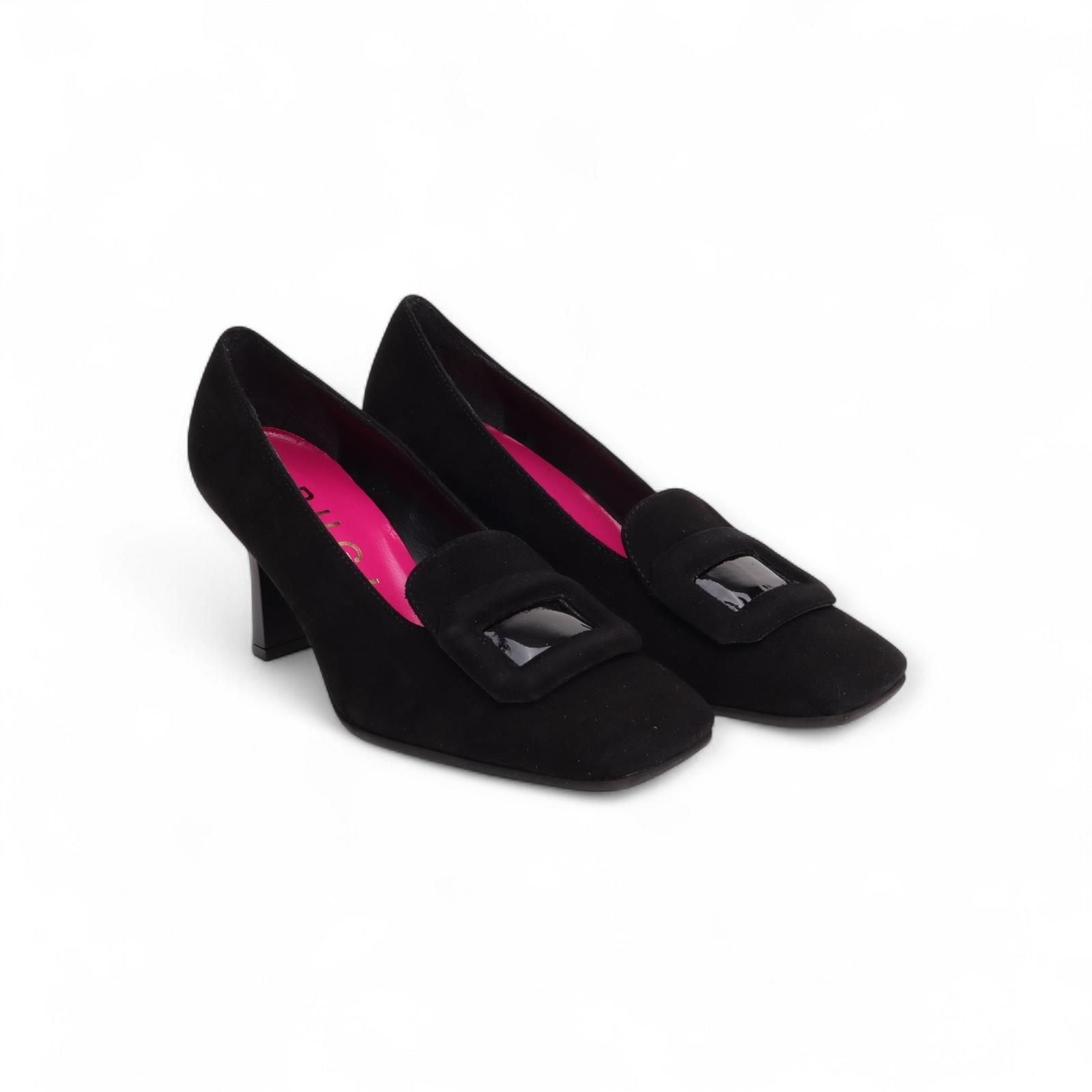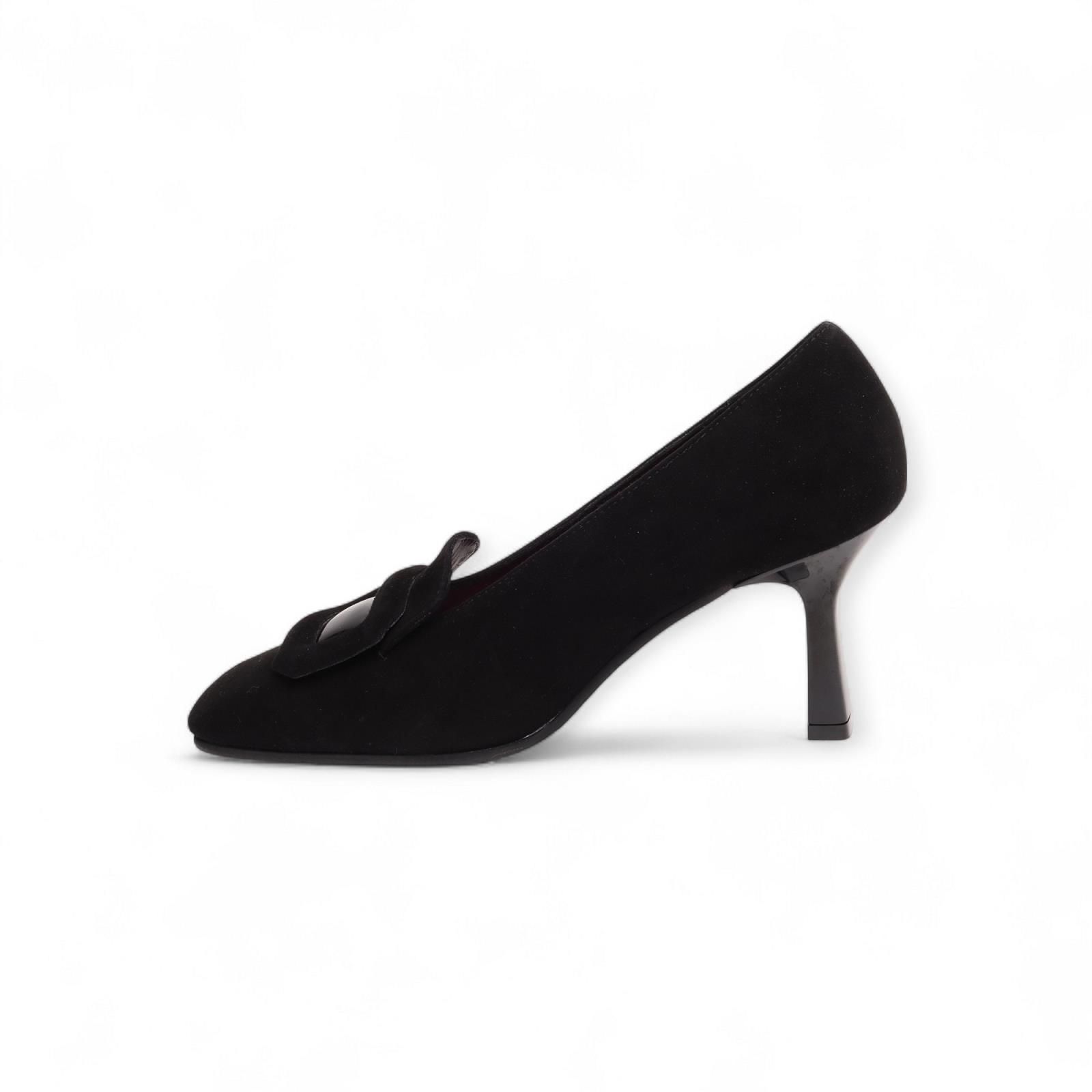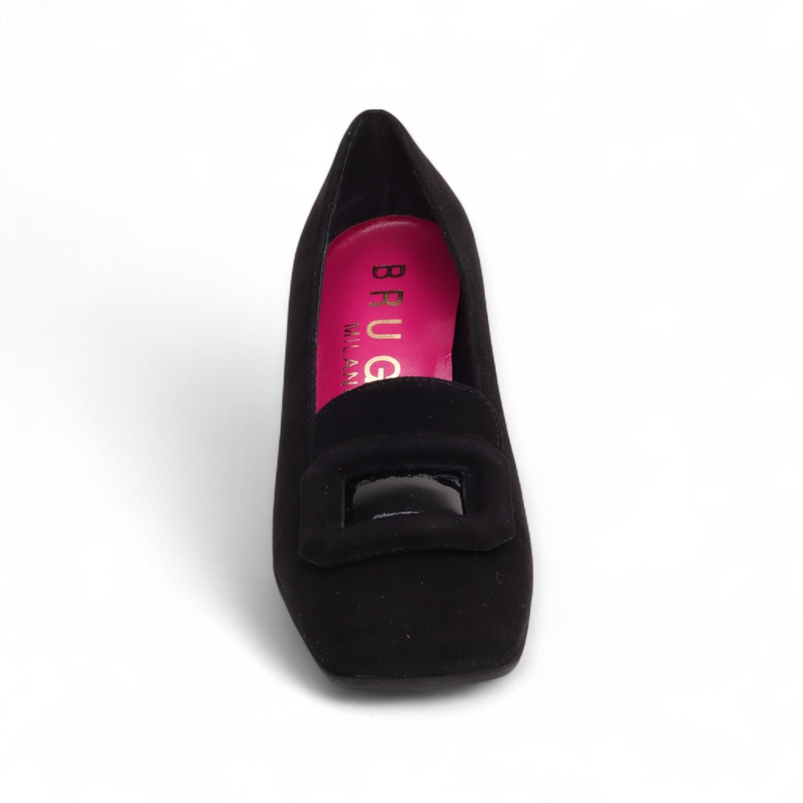 Pump van Bruglia voor dames. Deze pump is in zwart suède met een prachtige boekel over de wreef. Is met een carré top en een hakje van 7-7.5cm hoog.
