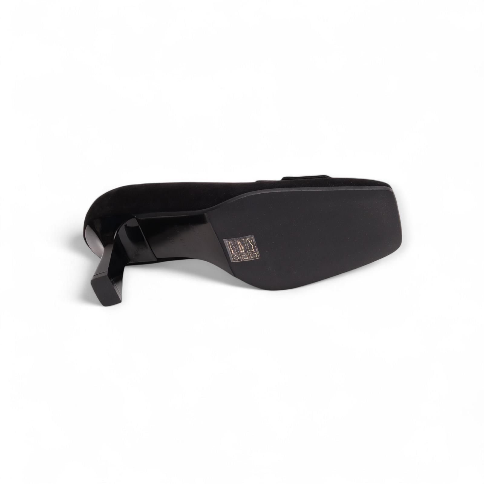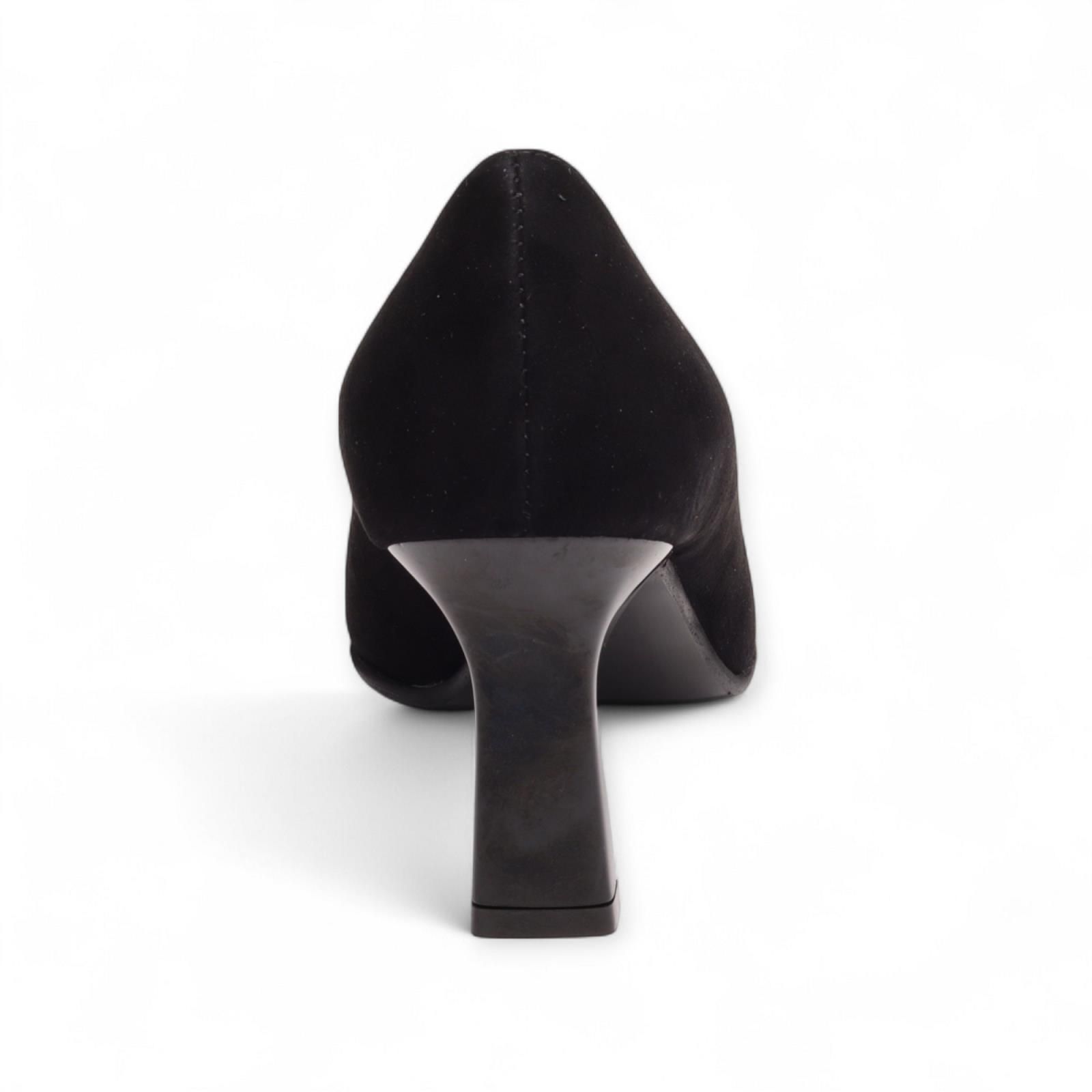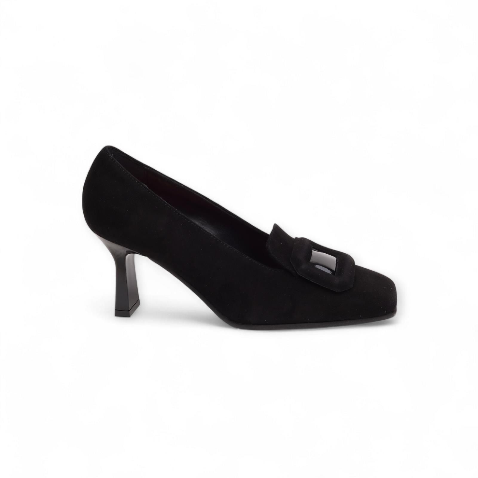 Pump van Bruglia voor dames. Deze pump is in zwart suède met een prachtige boekel over de wreef. Is met een carré top en een hakje van 7-7.5cm hoog.
