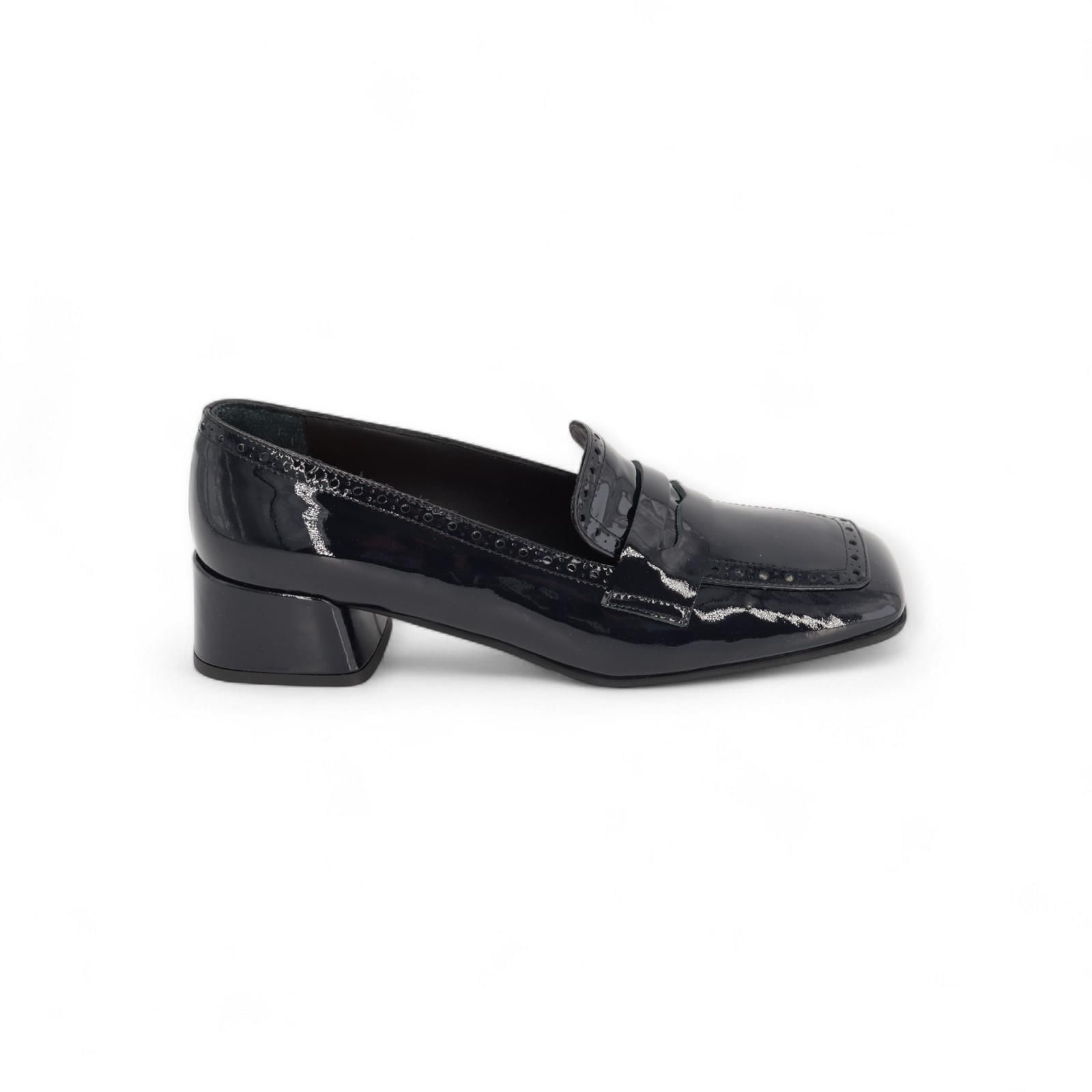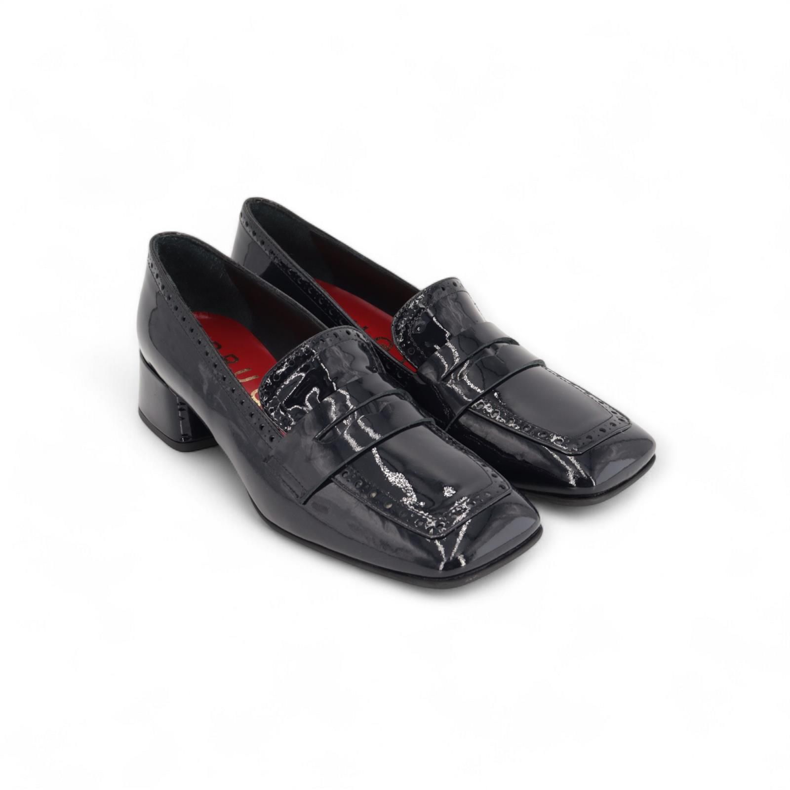 Mocassin 9265 van Bruglia voor dames. Deze mocassin is in zwart lakleer. Is met een band over de wreef en mooi afgewerkt met geperforeerde stiksels. Heeft een carré top en een blokhak van 2-2.5cm hoog.