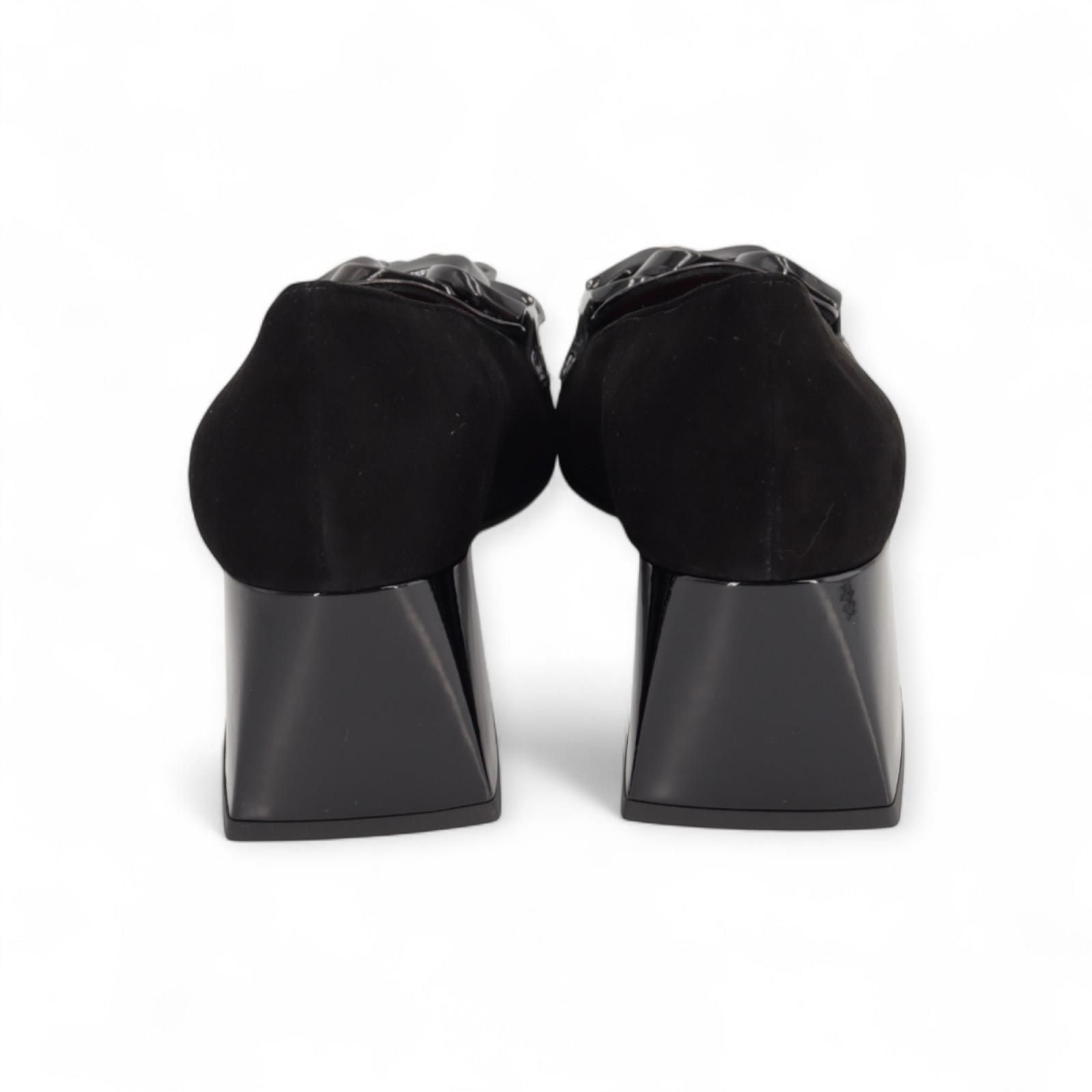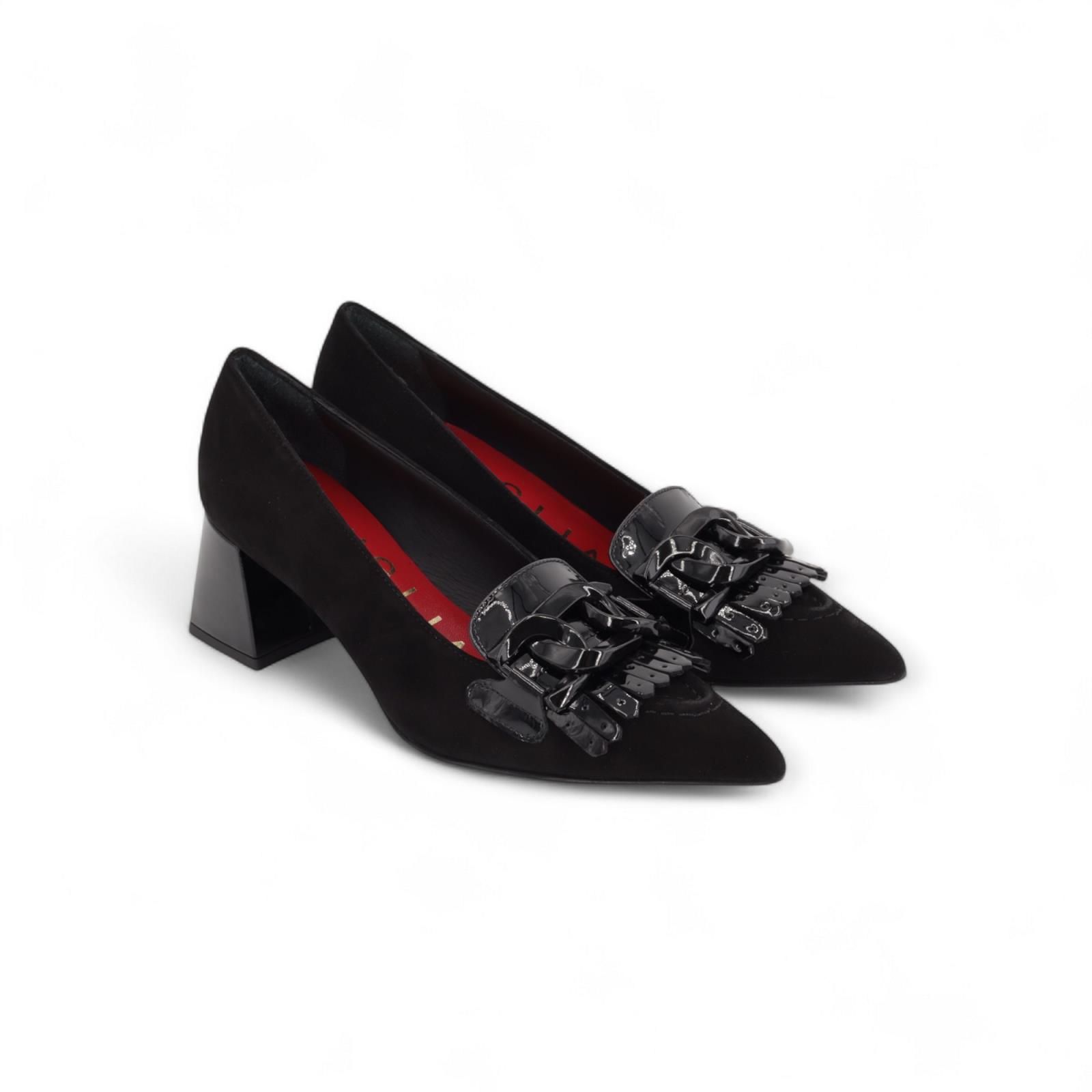 Pump 9302 van Bruglia voor dames. Deze pumps is in zwart suède. Heeft een scherpe top met een mooie boekel en flap in zwart lakleer over de wreef. Is op een blokhak van 5-5.5cm hoog met een antislipzool.