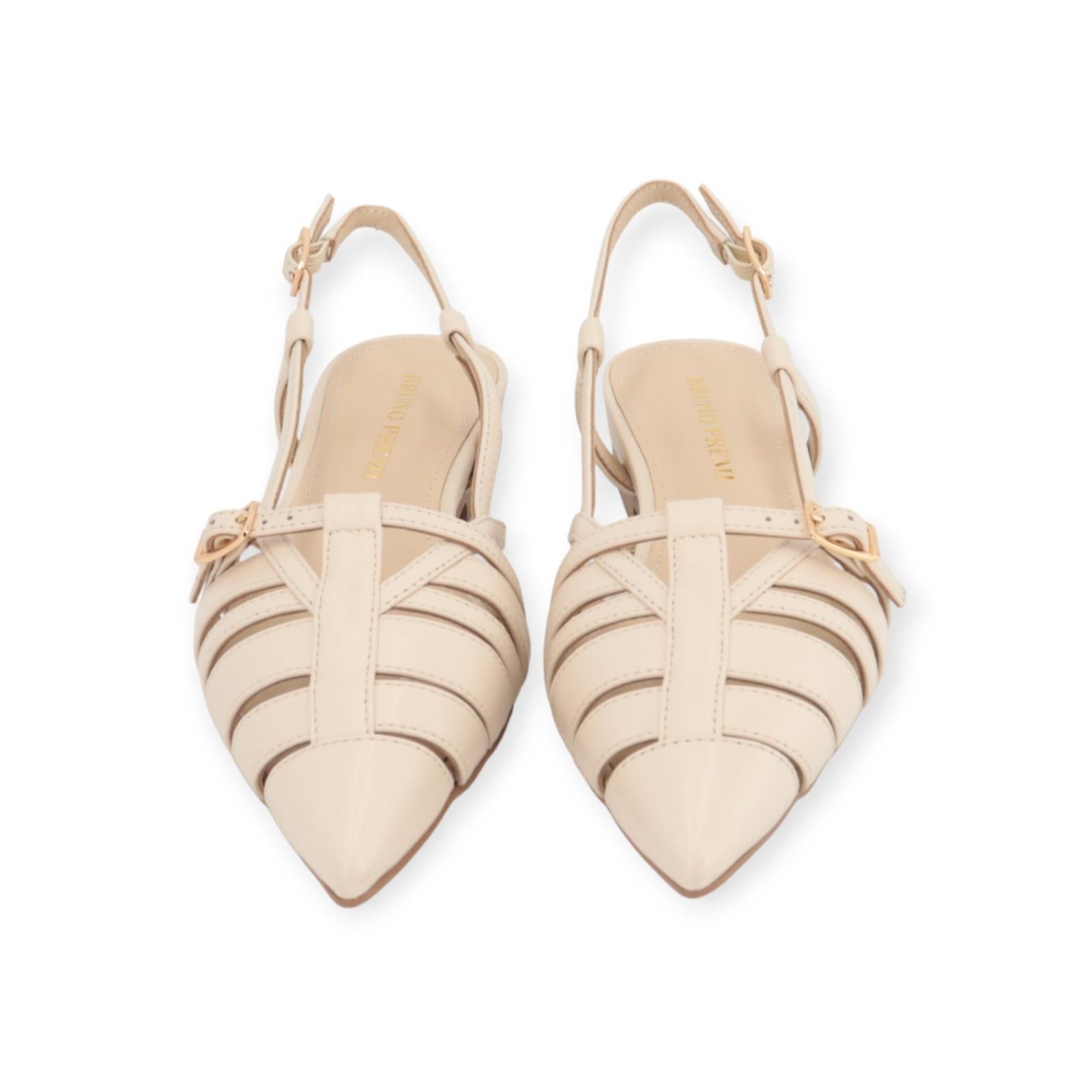 Ballerina 0105 van Bruno Premi voor dames. Deze ballerina is in off wit leer. Heeft een scherpe neus met een open hieltje. Heeft verschillende bandjes over de wreef met een gespsluiting aan de wreef als detail. Blijft mooi vast aan de voet door een bandje rond de hiel met gespsluiting.