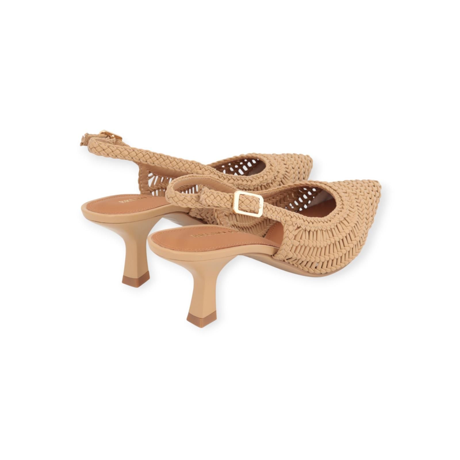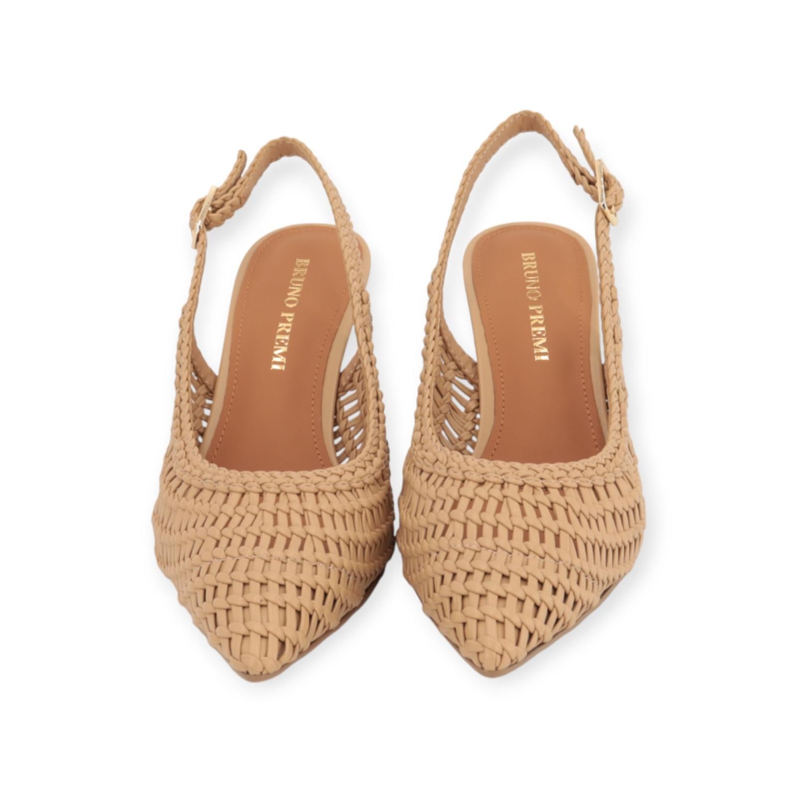 Pump 0310 van Bruno Premi voor dames. Dit slingback model is in beige gevlochten tressée leer. Heeft een scherpe neus met een open hieltje. Blijft mooi vast aan de voet door een bandje rond de hiel met gespsluiting. Is op een hakje van 5,5cm hoog.