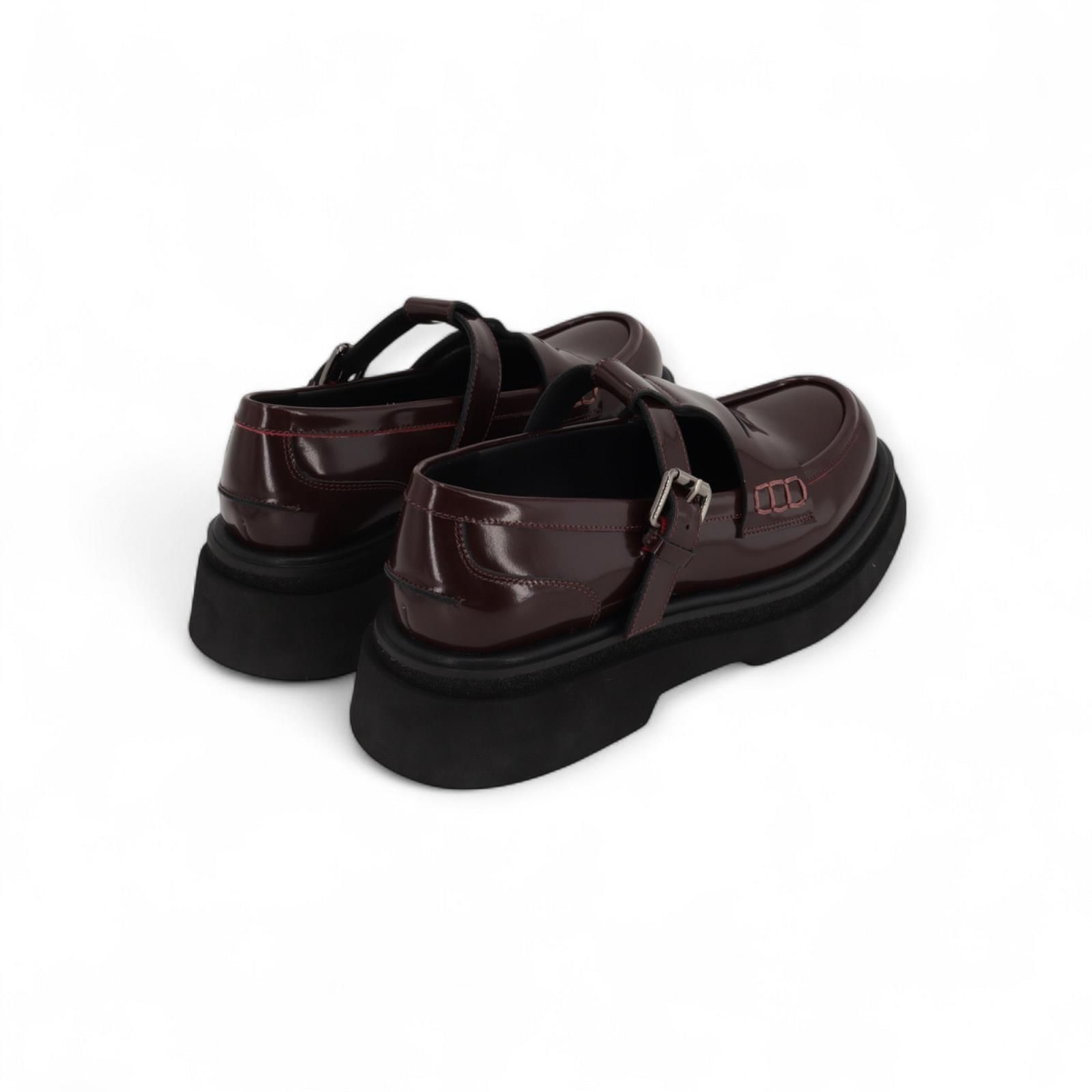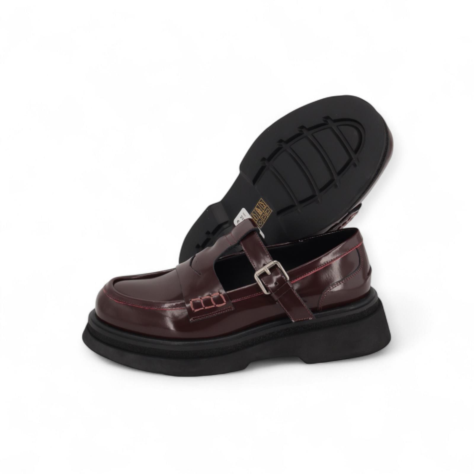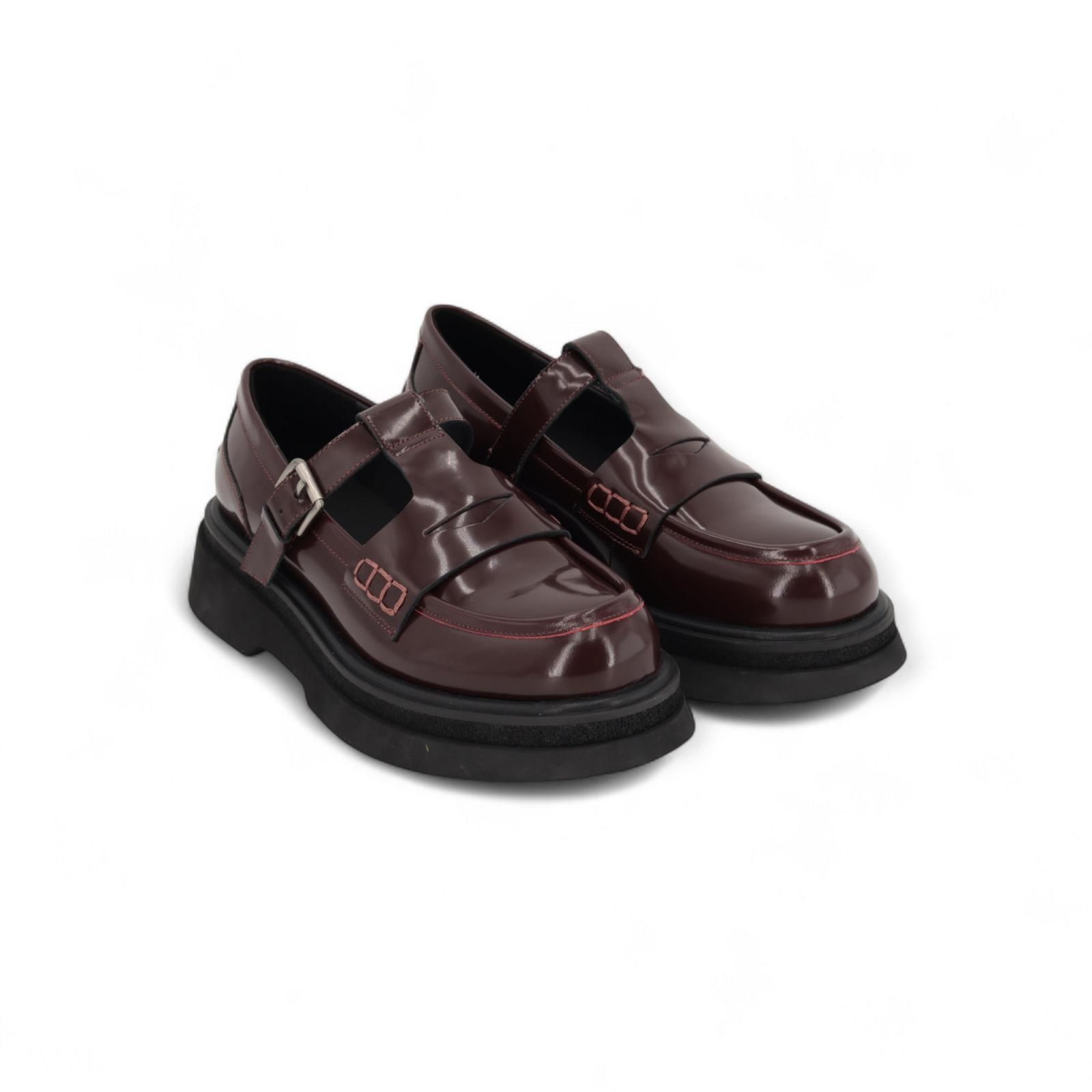 Mocassin 3401 van Bruno Premi voor dames. Deze hippe mocassin is in bordeaux lakleer. Heeft een gesp met zilver sluiting met band over de wreef en een stekking op de voorvoet. Is op een dikke zwarte zool die voor aangenaam comfort zorgt.