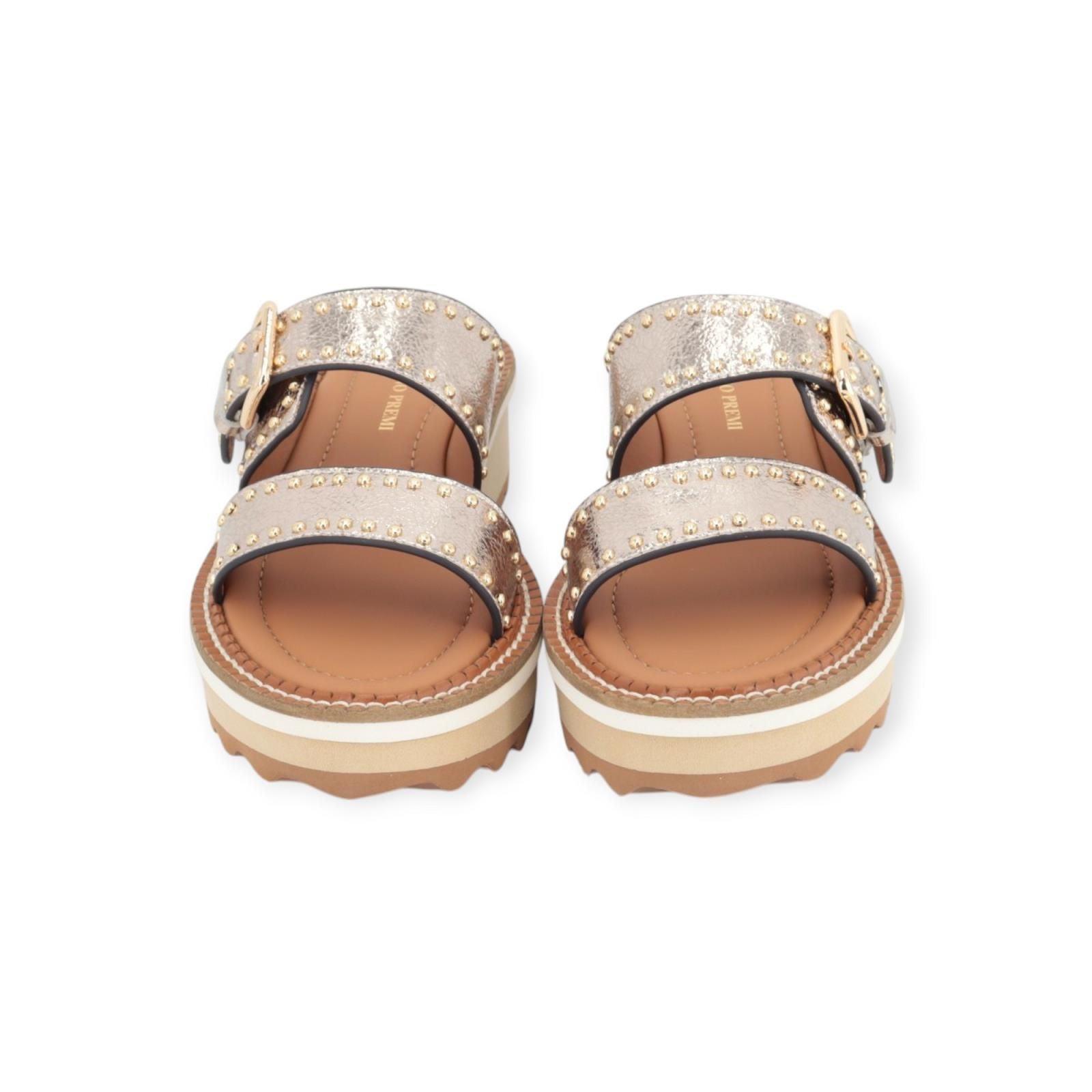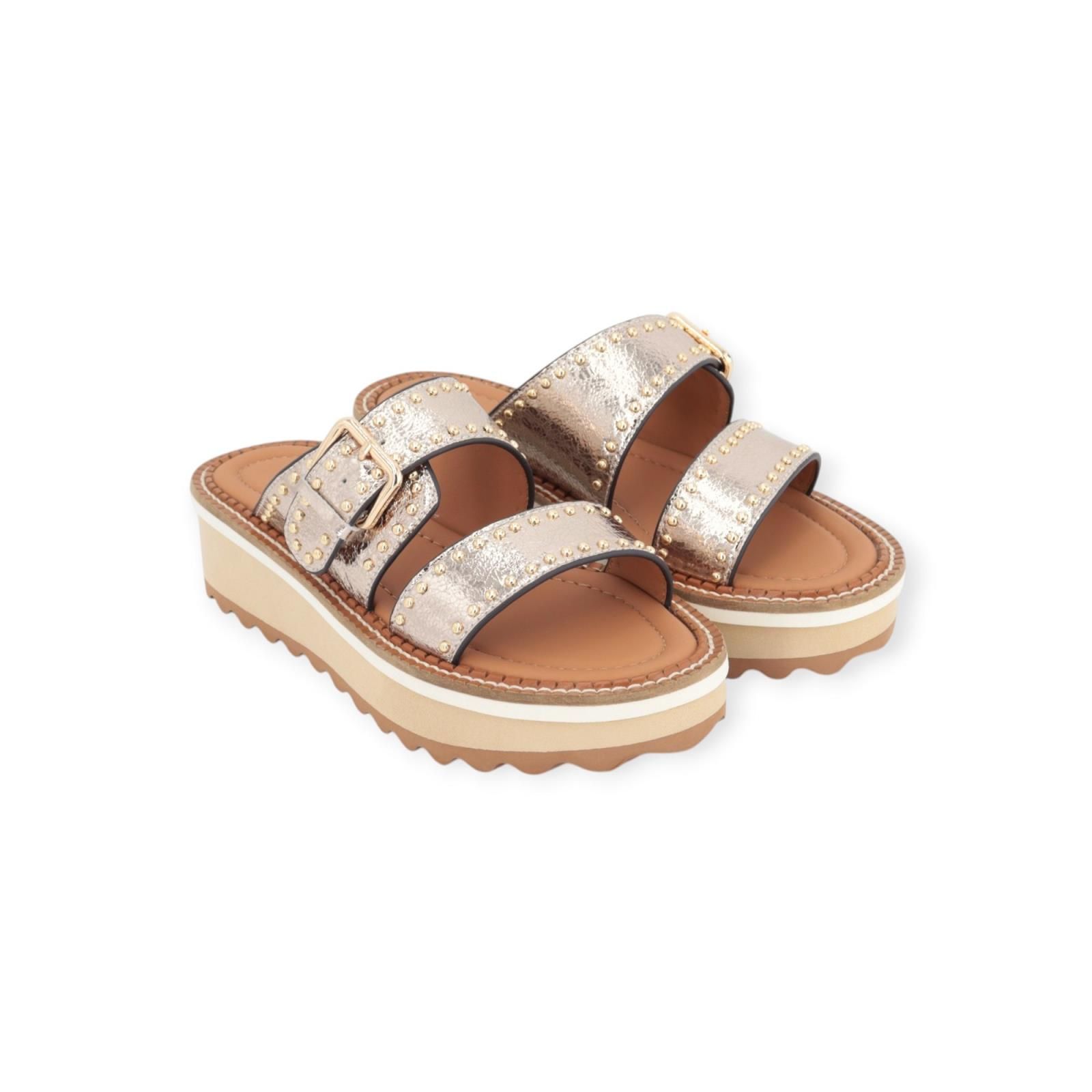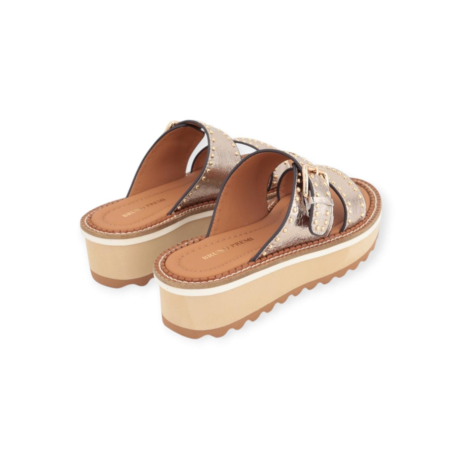 Slipper van Bruno Premi voor dames. Deze elegante slipper heeft 2 banden over de wreef in goud craquéle leer. Mooi afgewerkt met gouden subtiele studs. De bovenste band is voorzien van een gespsluiting. Is op een zachte leren binnenzool met mooi opvallende stiksels rond de buitenzool. Heeft een aangename 3 kleurige microzool met een sleehak van 3,5 cm hoog.