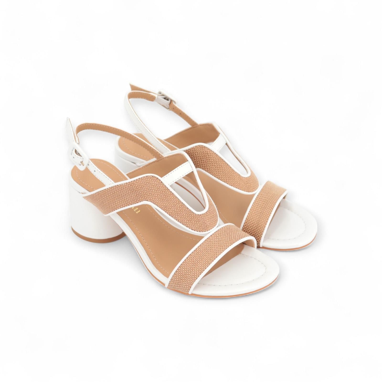 Sandaal Bruno Premi voor dames. Deze sandaal is in wit leder met canvas textiel. Heeft een mooi textuur over de wreef en is afgesloten met een bandje rond de hiel met gespsluiting. Is op een ronde blokhak van 5-5.5cm hoog.