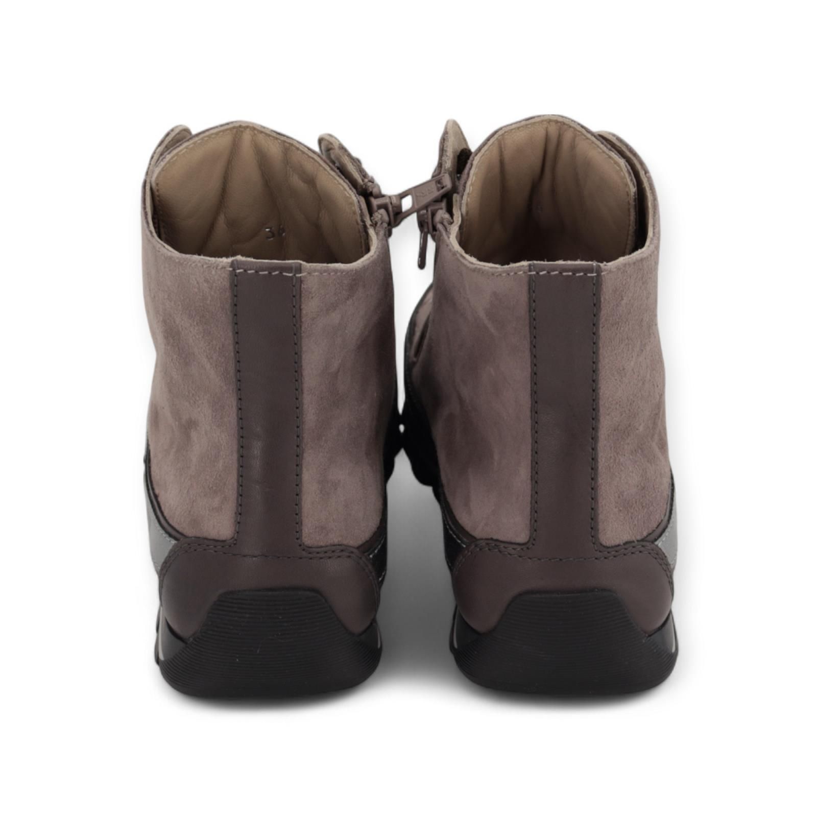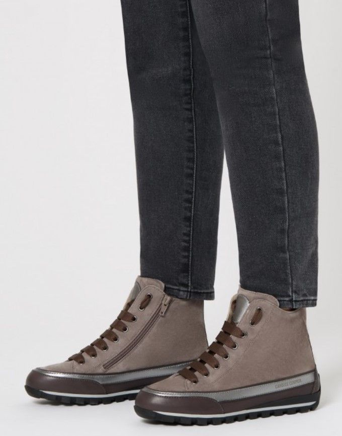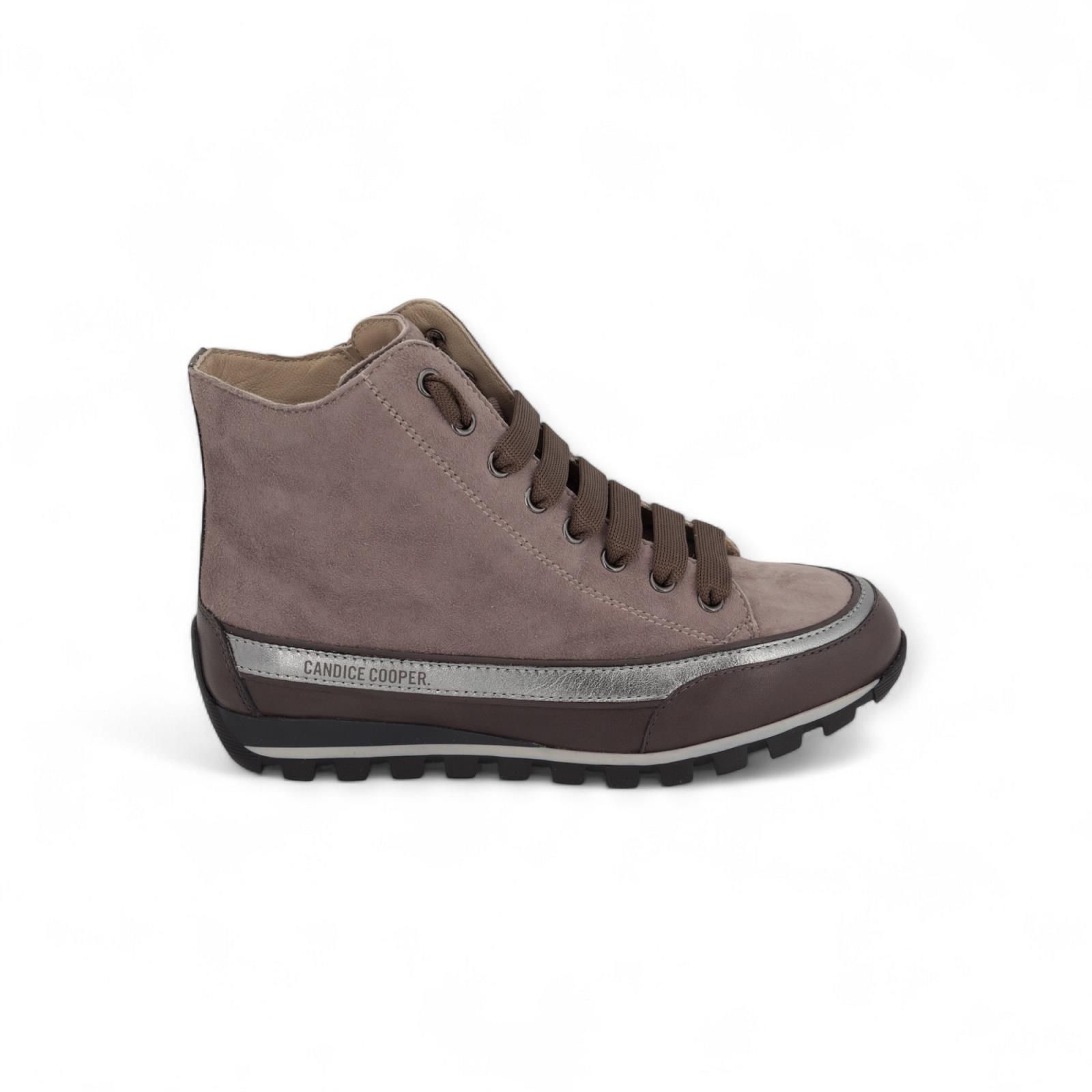 Sneaker Janis Strip Plus van Candice Cooper voor dames. Deze sneaker is volledig in soepel zacht leer en komt tot aan de enkel.Heeft een ritssluiting en veters. Is in suède taupe met bruine nappaleren zool en afgewerkt met shining zilver. Heeft een uitneembare binnenzool op een plateauzool.
