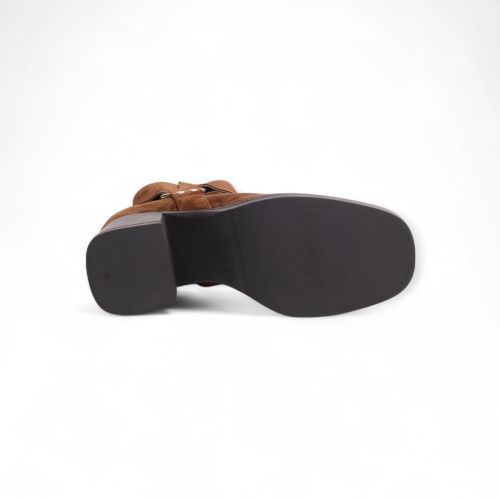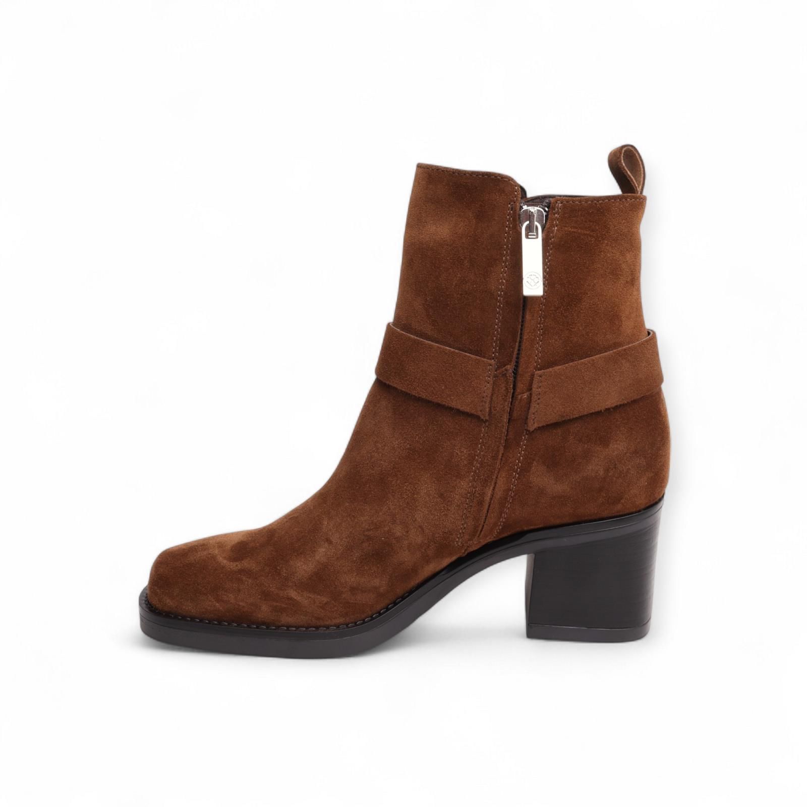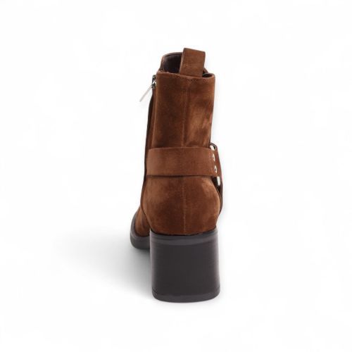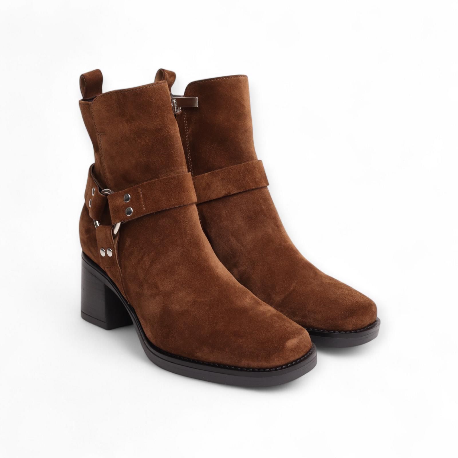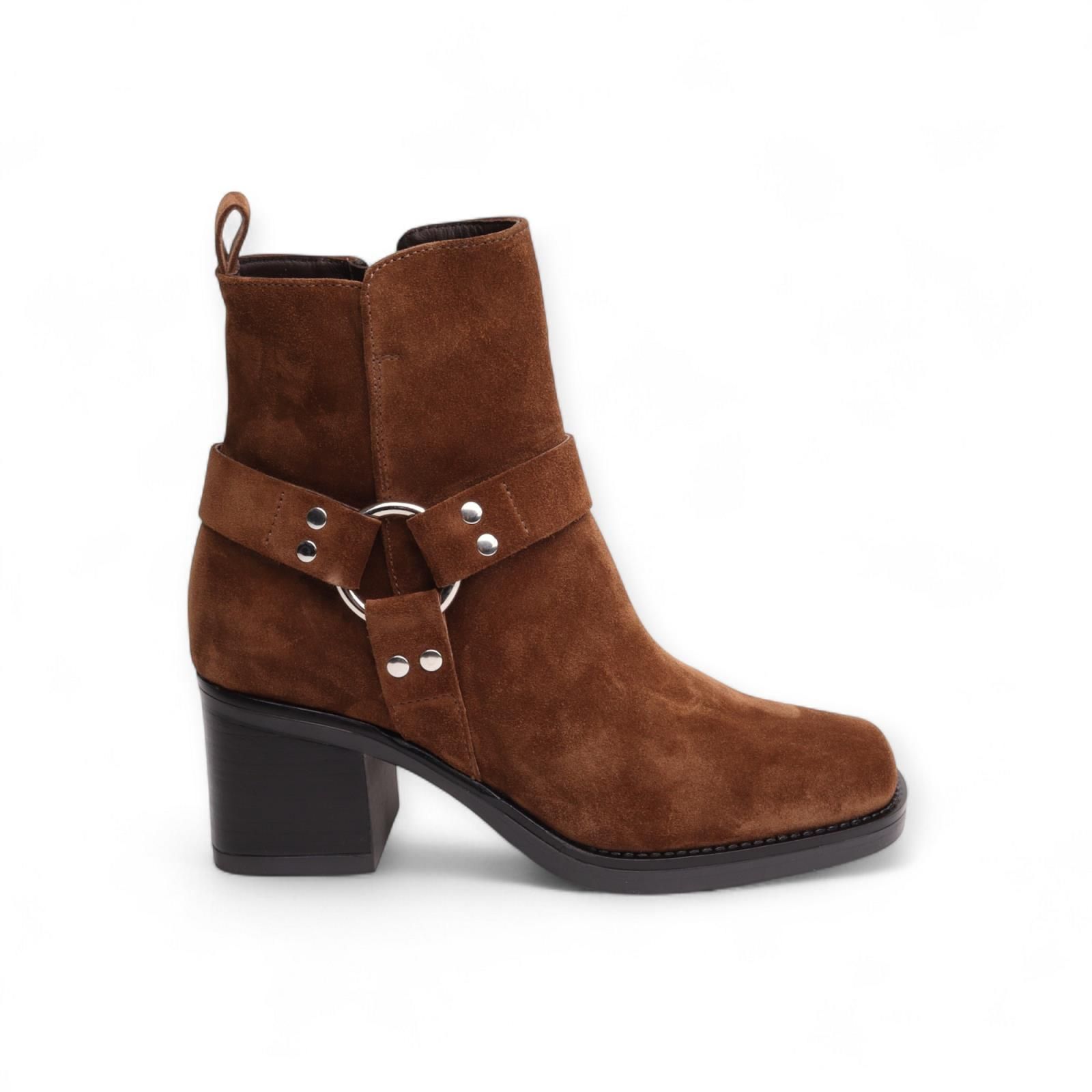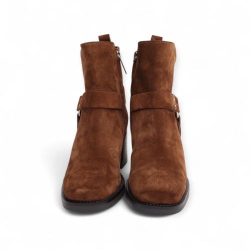 Enkellaarsje Holly Ring van Carmens voor dames. Deze bruine/zwarte enkellaars heeft een vierkante neus en is verfraaid met zilveren metalen ringen. Is gemaakt van zacht suède/leder en is op een blokhak van 3-3.5cm hoog.