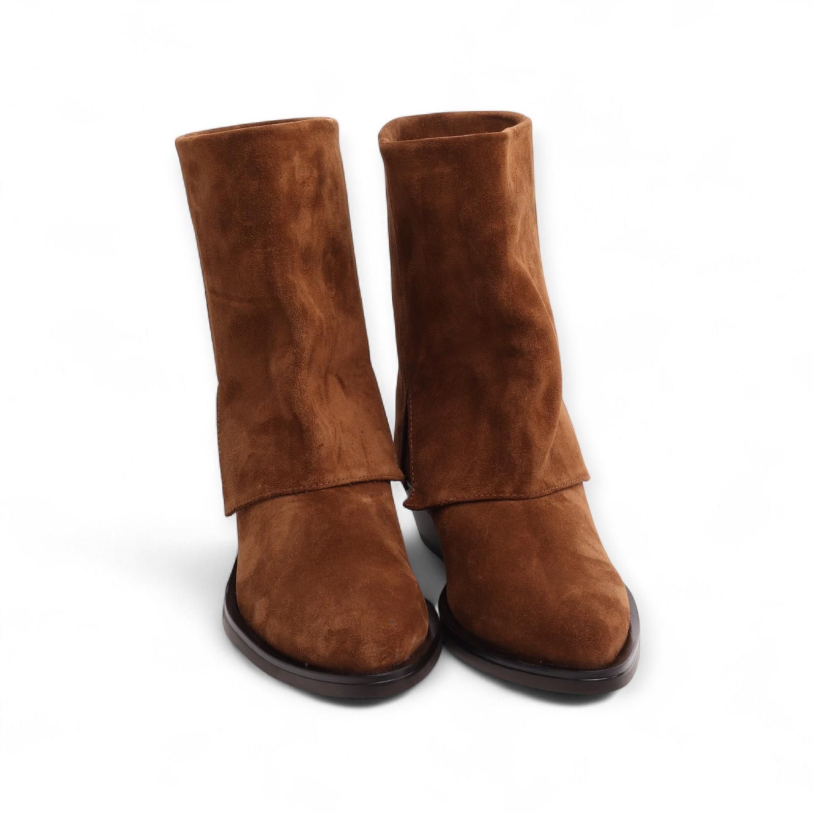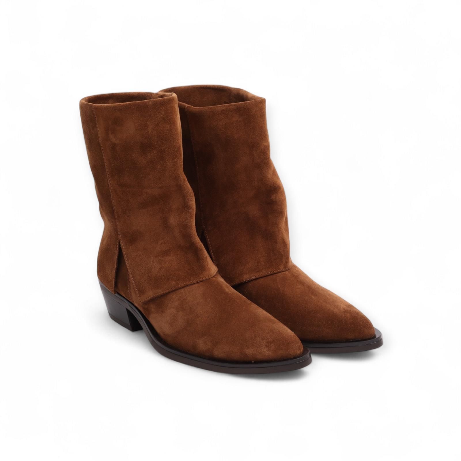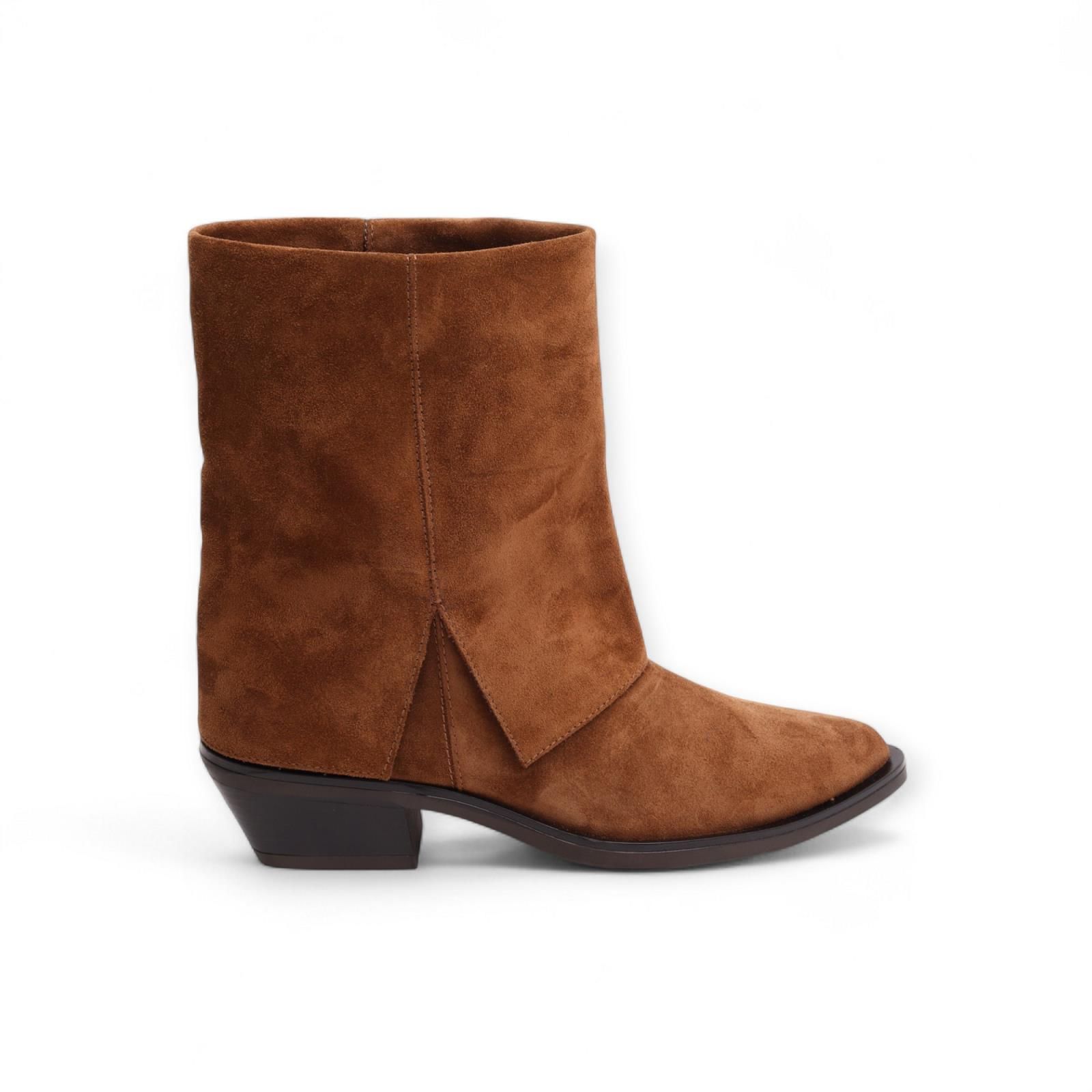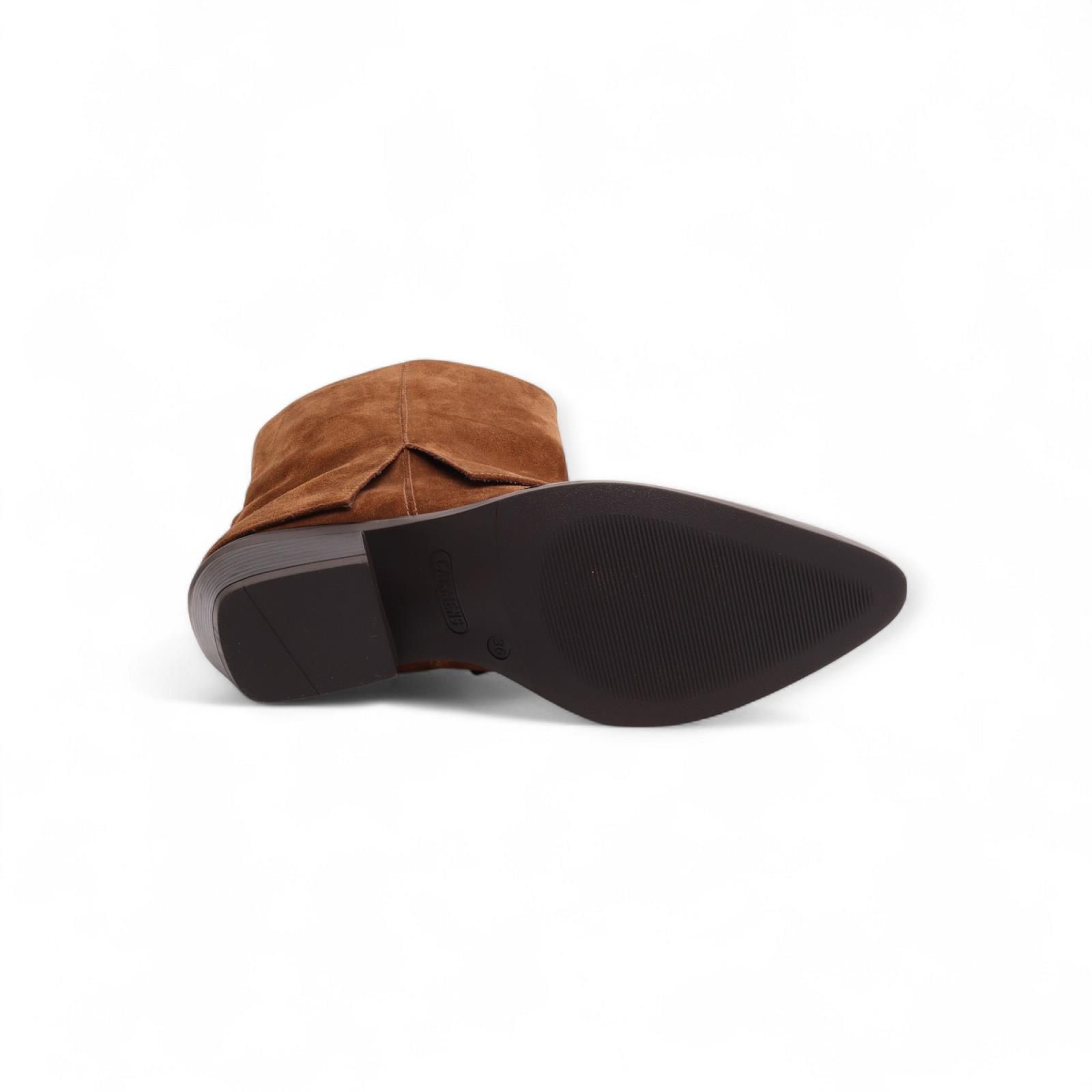 Enkellaarsje Kelly Skirt van Carmens voor dames. Dit enkellaarsje heeft een puntig silhouet en geeft een western uitstraling door de decoratieve split aan de zijkant en het overlapte leder. Is in bruin suède leder en heeft een brede schacht. Is op een blokhakje van 3-3.5cm hoog.