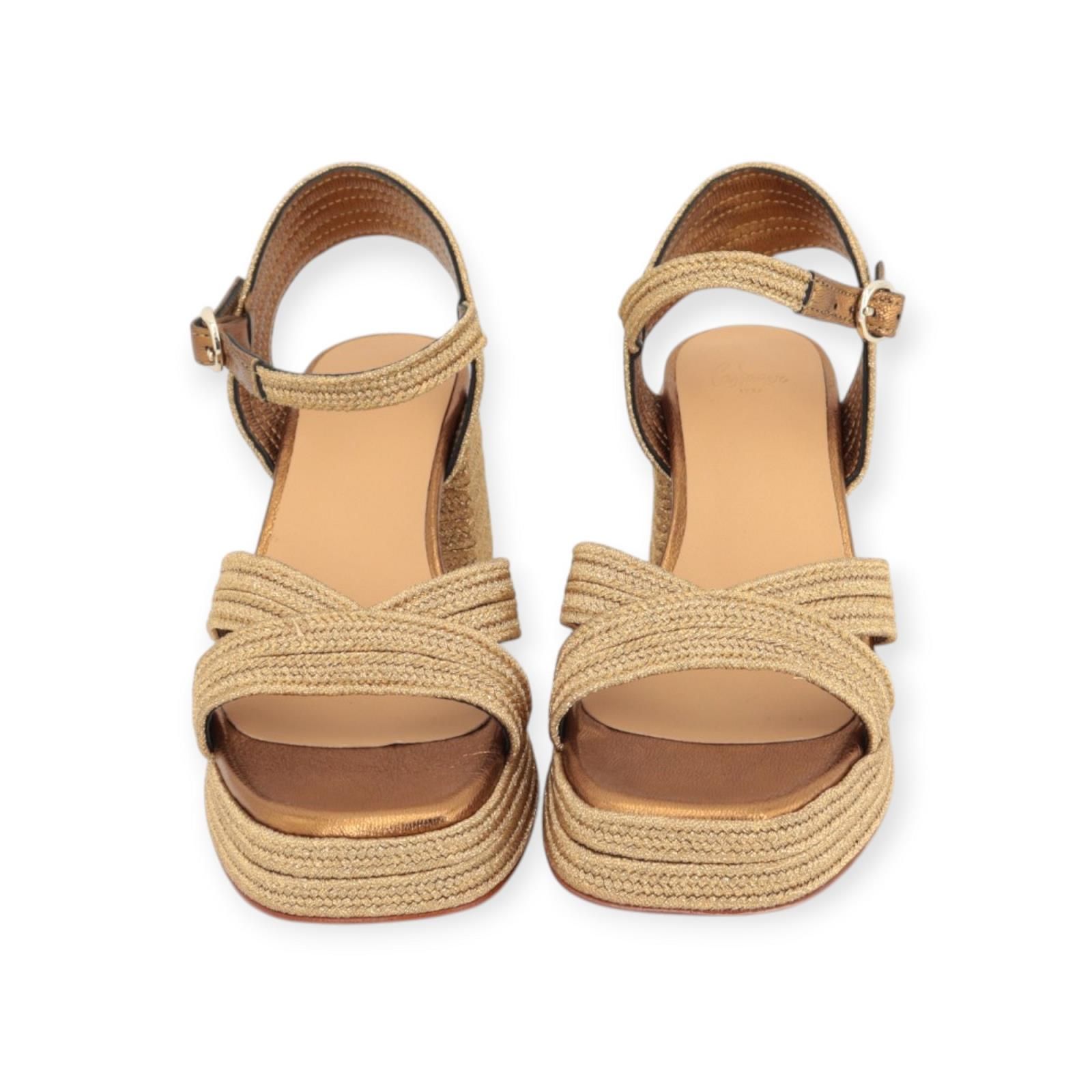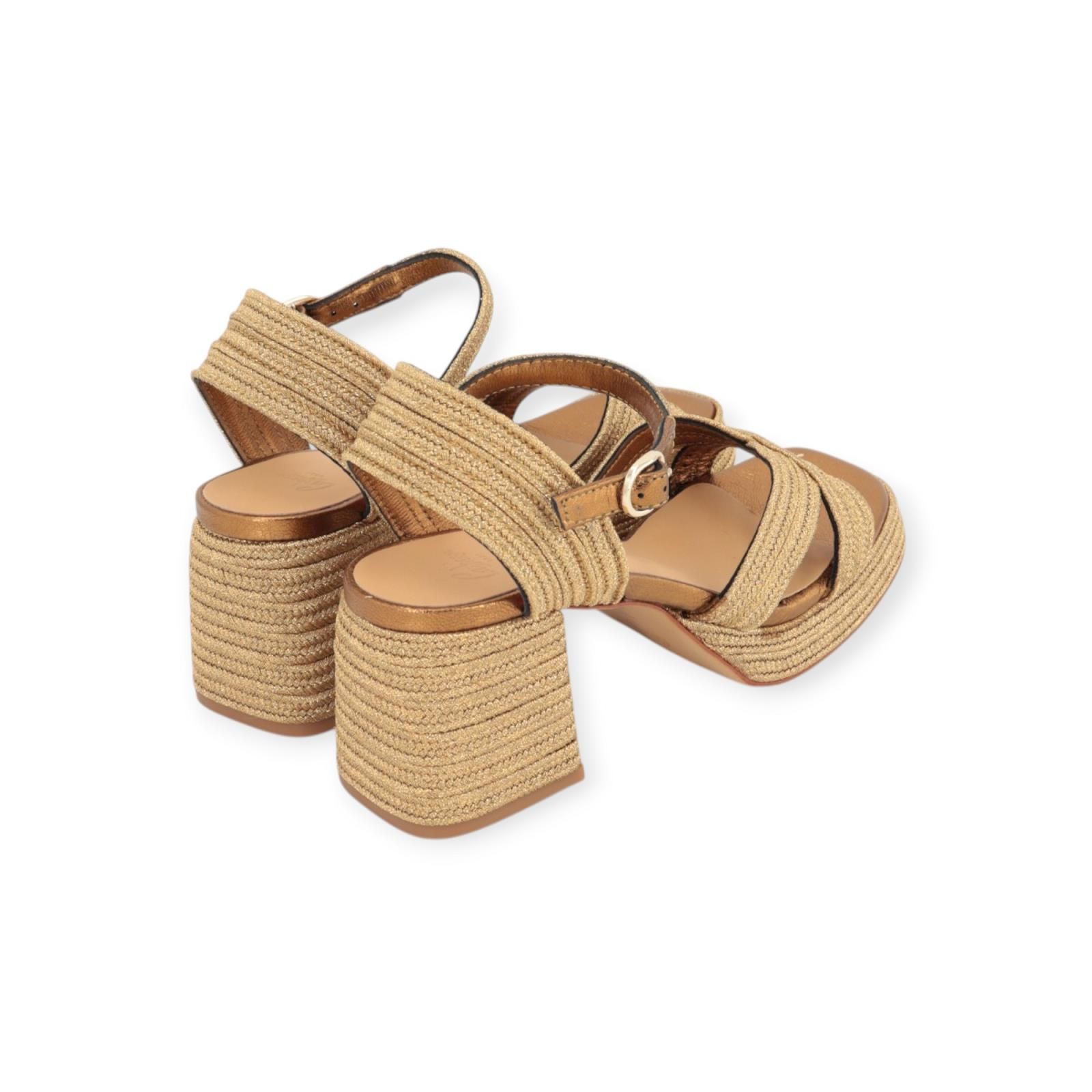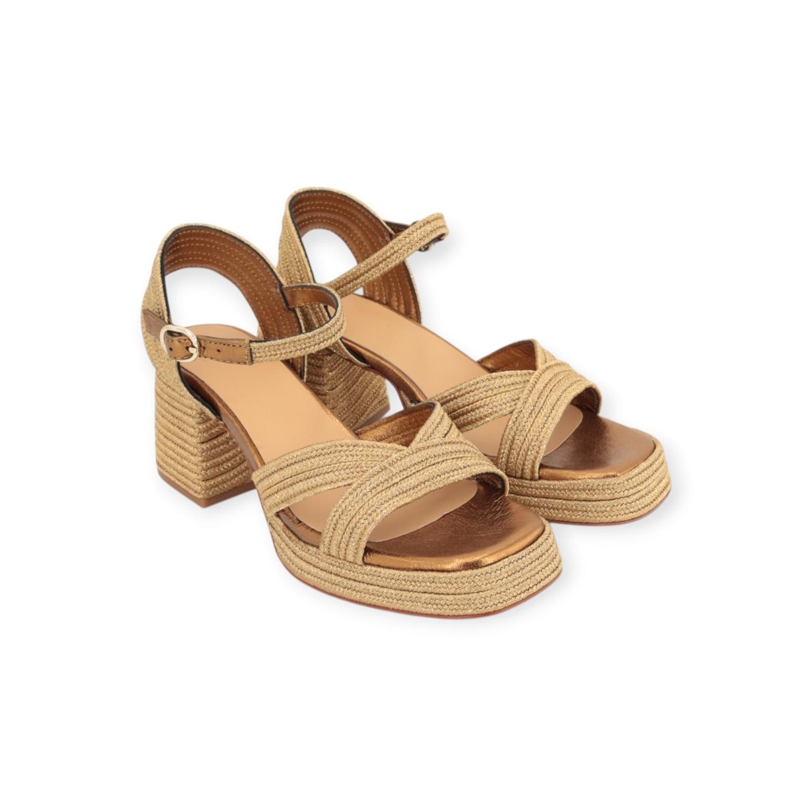 Sandaal Vallita van Castaner voor dames. Deze sandaal is volledig in raffia shining goud. Heeft een gekruiste band over de wreef met een half gesloten hiel. Is afgesloten met een bandje rond de enkel met gespsluiting. Is vooraan met een lichte plateauzool van 2cm met een aangename blokhak van 6,5cm hoog. Heeft een leren buitenzool met antisliplaag. Combineer deze sandaal met de bijpassende handtas: 22967