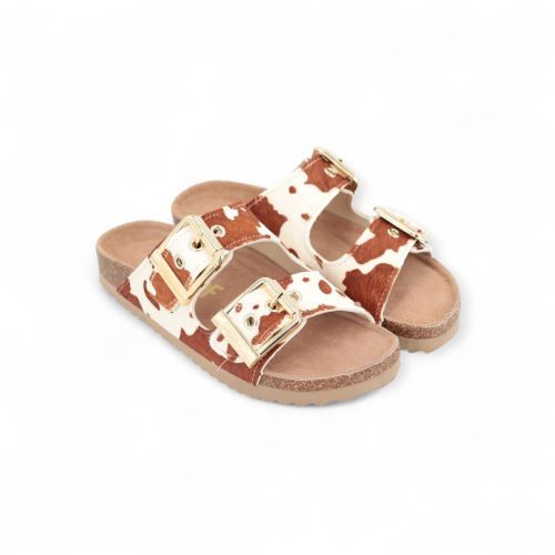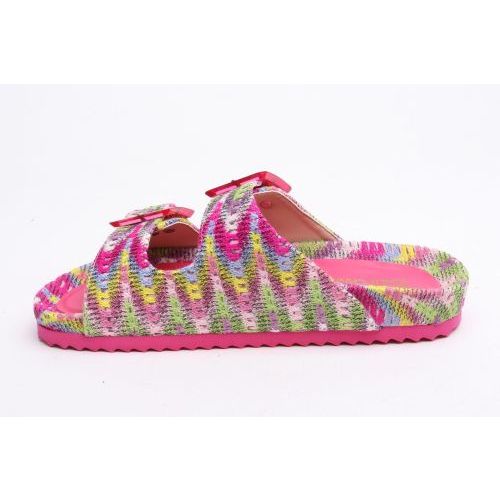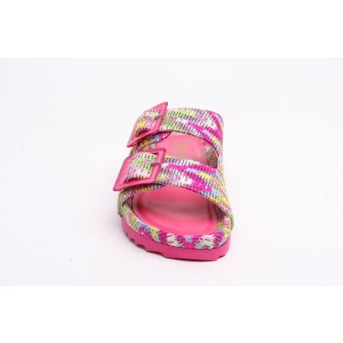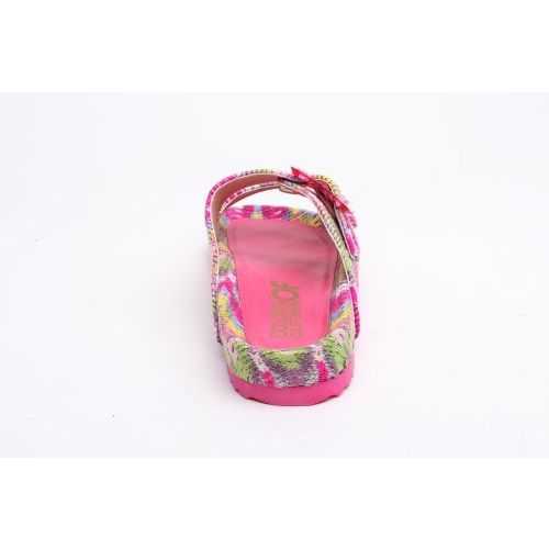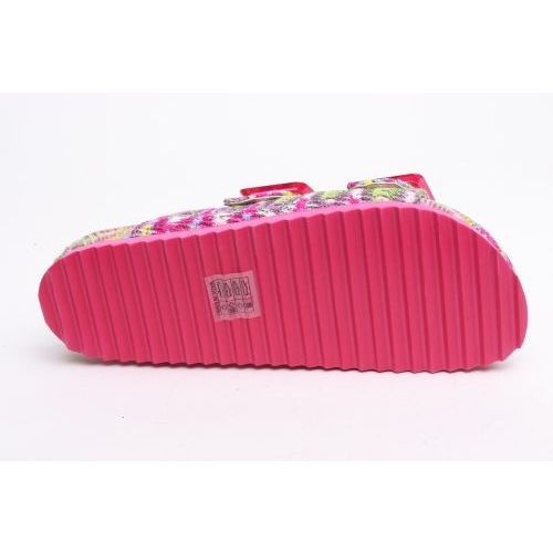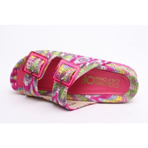 Slipper Colors of California in fushia raffia print. Deze slipper is op een lederen zool met een voetbed die voor de nodige steun zorgt. Heeft 2 banden afgewerkt met transparante gespen.