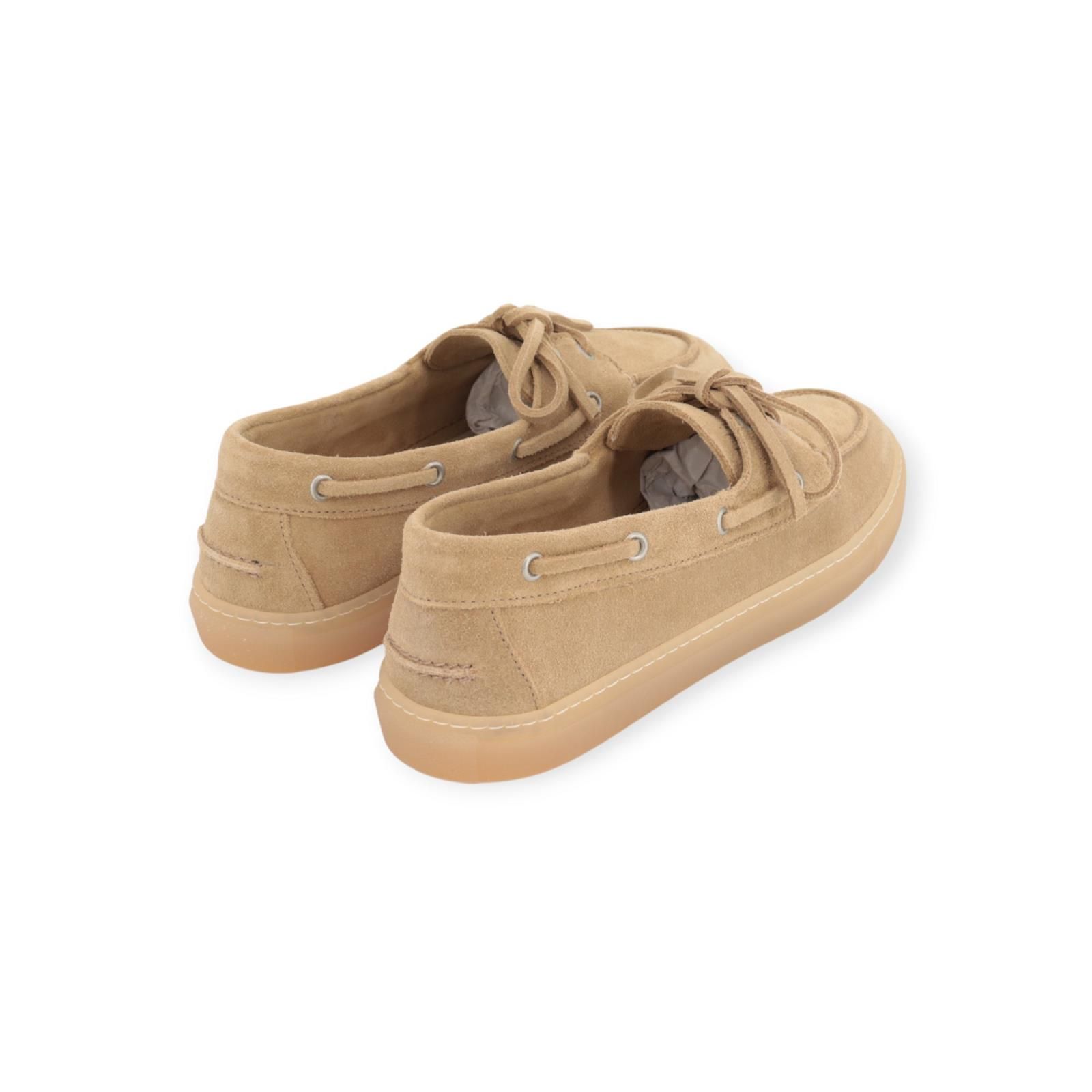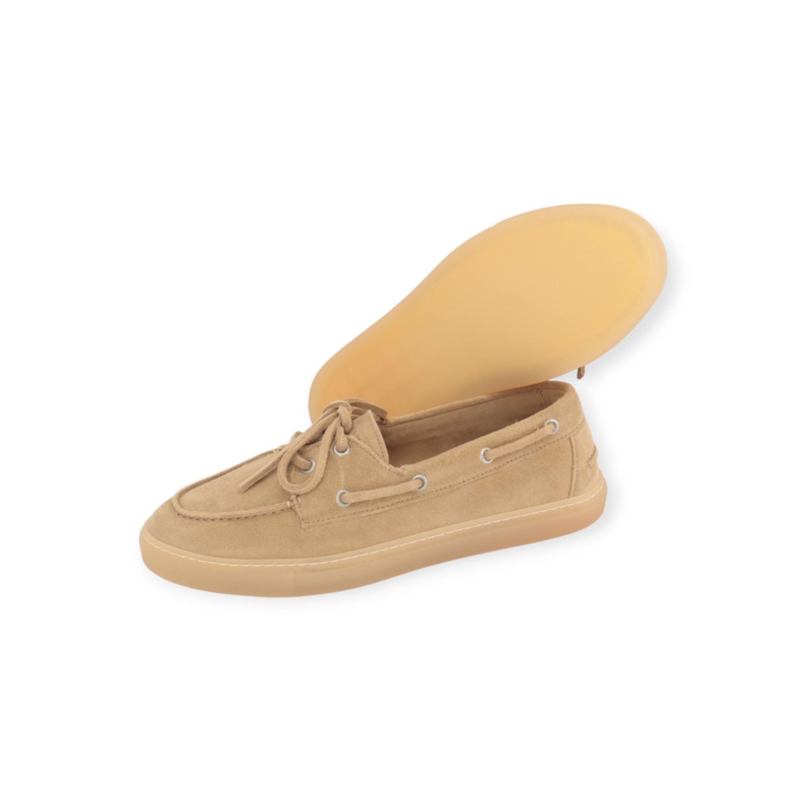Mocassin CPH160 van Copenhagen Studios voor dames. Deze zandkleurige loafer is gemaakt in zacht suède met vetersluiting en decoratieve veters langs de zijkant. ‘De typische bootschoen stijl en de trend voor deze zomer. Heeft een ronde neus met stiksels rond de zijkant en voorvoet. Dit model is zeer minimalistisch en toch modern. Heeft een flexibele antislip gummyzool.