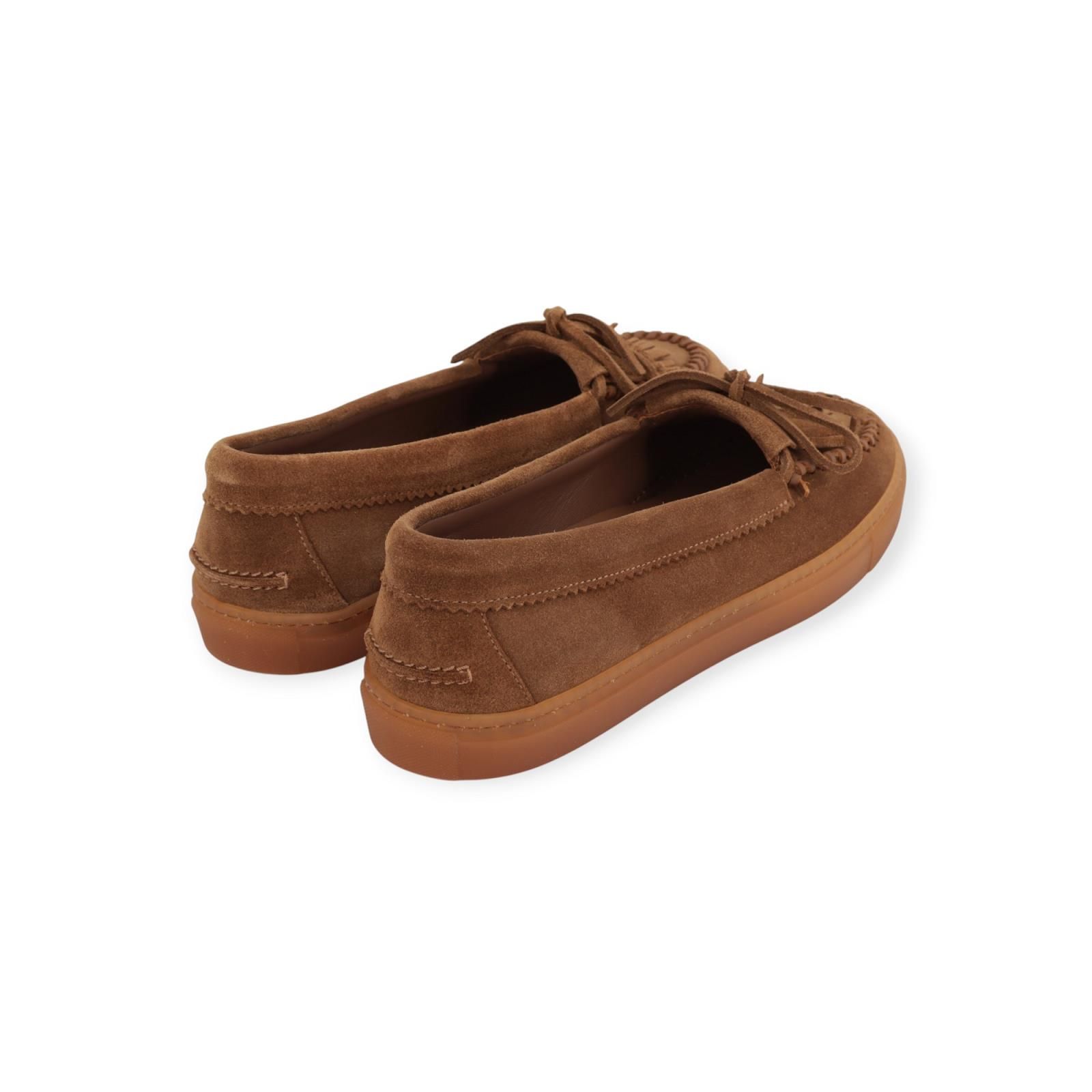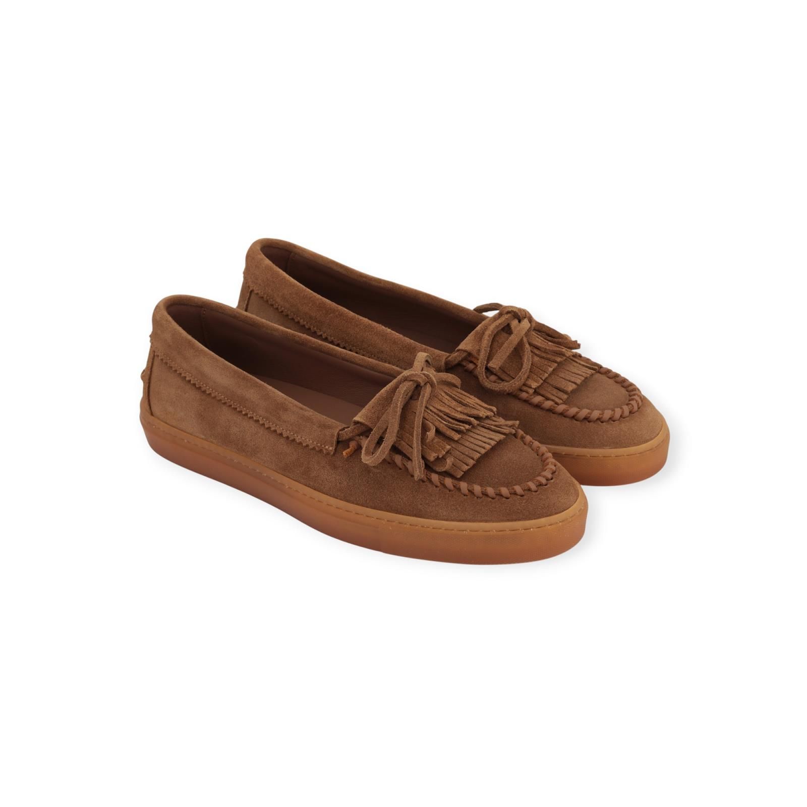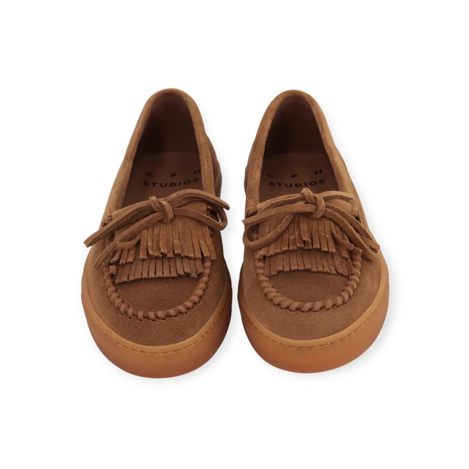 Mocassin CPH365 van Copenhagen voor dames. Deze mocassin is in suède bruin. Is mooi afgewerkt met gekartelde stekking rond de zijkant en op de wreef met een dikke brede stekking, flap en veter. Dit typisch bootschoen model is dé trend voor deze zomer. Is op een aangename gummyzool met uitneembare binnenzool.