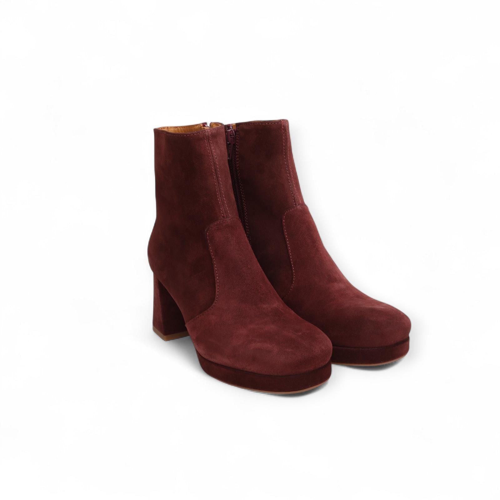 Enkellaars Barcelona van CTWLK voor dames. Dit elegant enkellaarsje is in bordeaux suède leder. Heeft een dikke zool vooraan en een licht carré top. Is met een ritssluiting en op een blokhak van 5-5.5cm hoog.