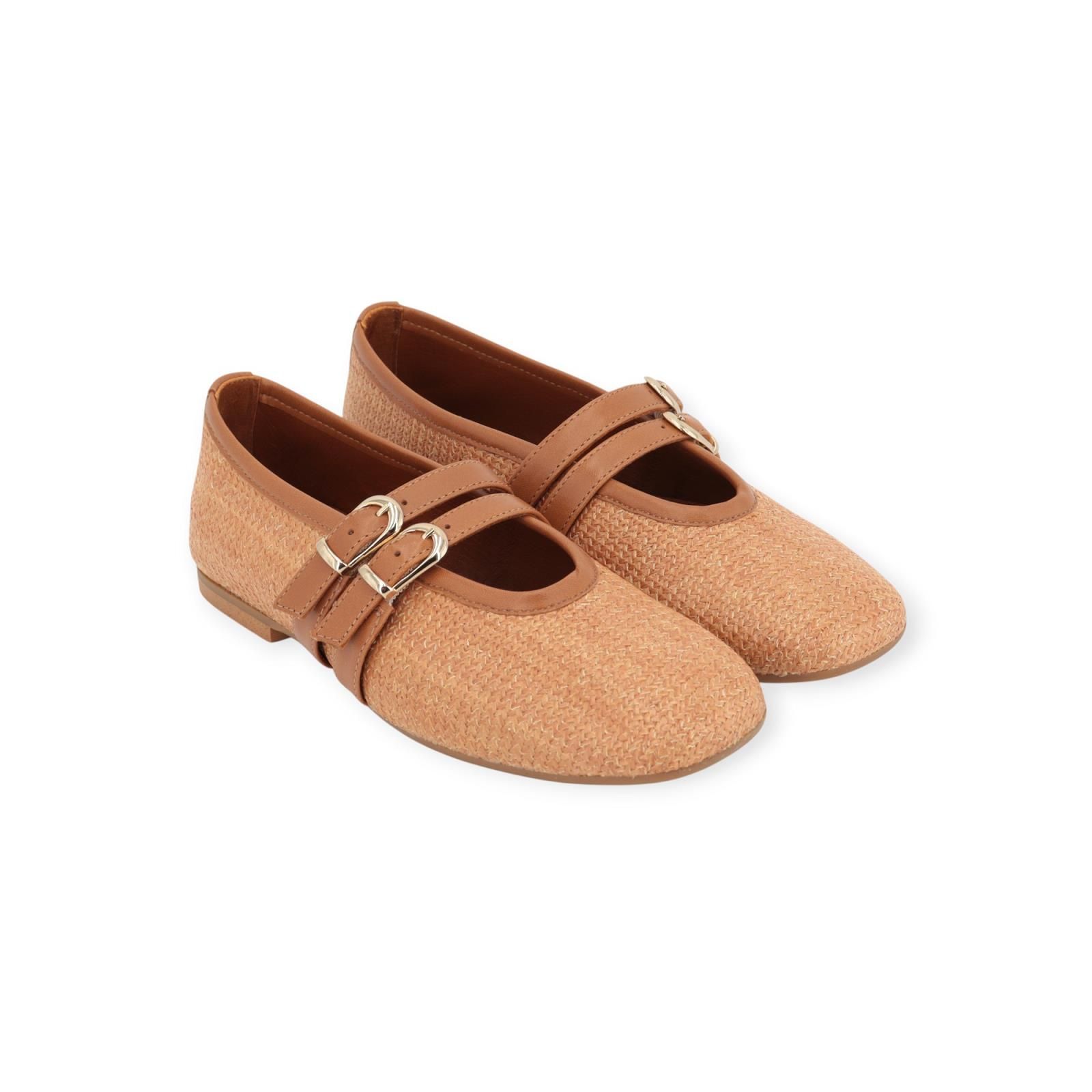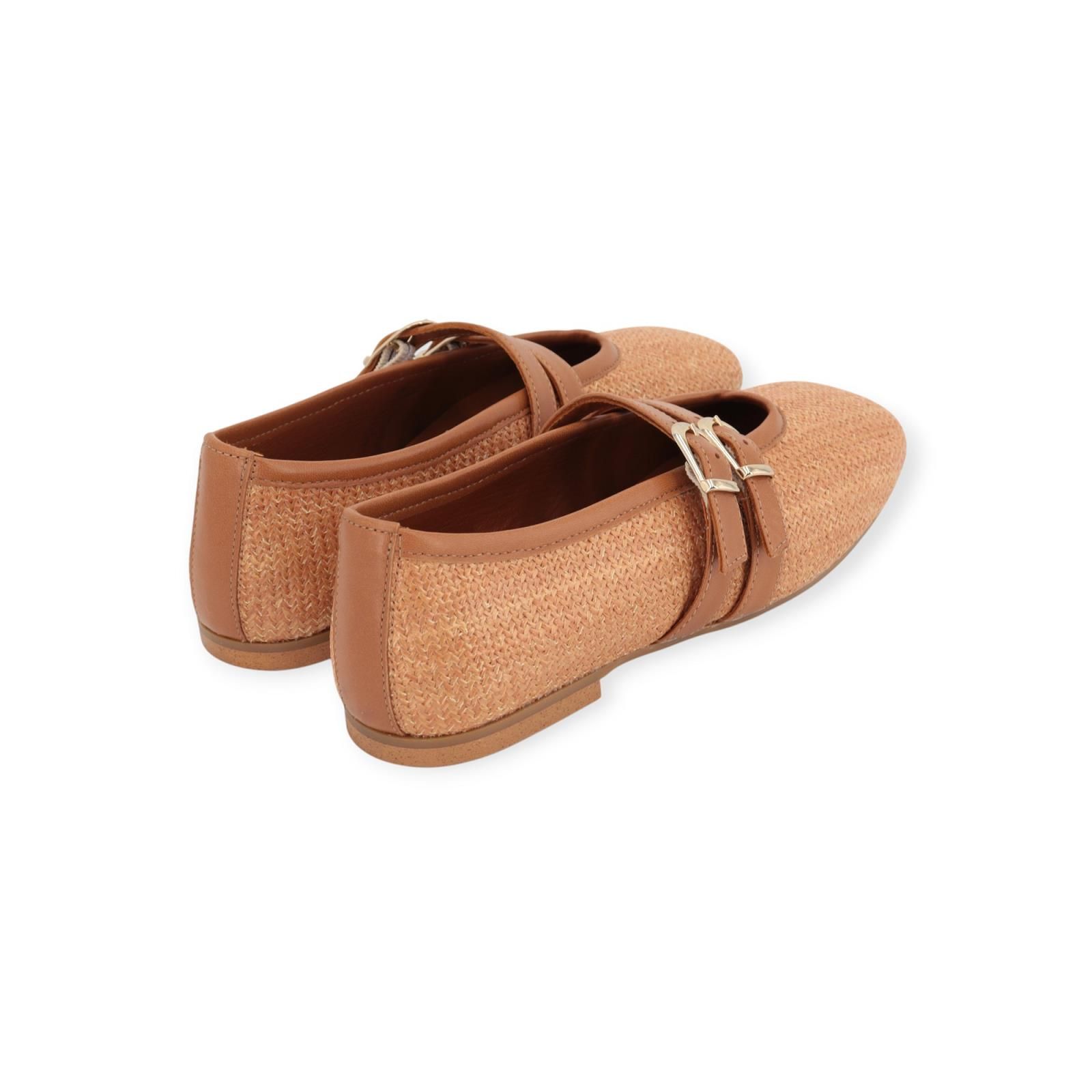 Ballerina Clara S6 van CTWLK – CATWALK voor dames. Deze elegante ballerina is in raffia cognac / camel. Is mooi omrand in cognac leer en 2 cognac bandjes over de wreef in leer met gouden gespsluiting. Heeft een antislip buitenzooltje.