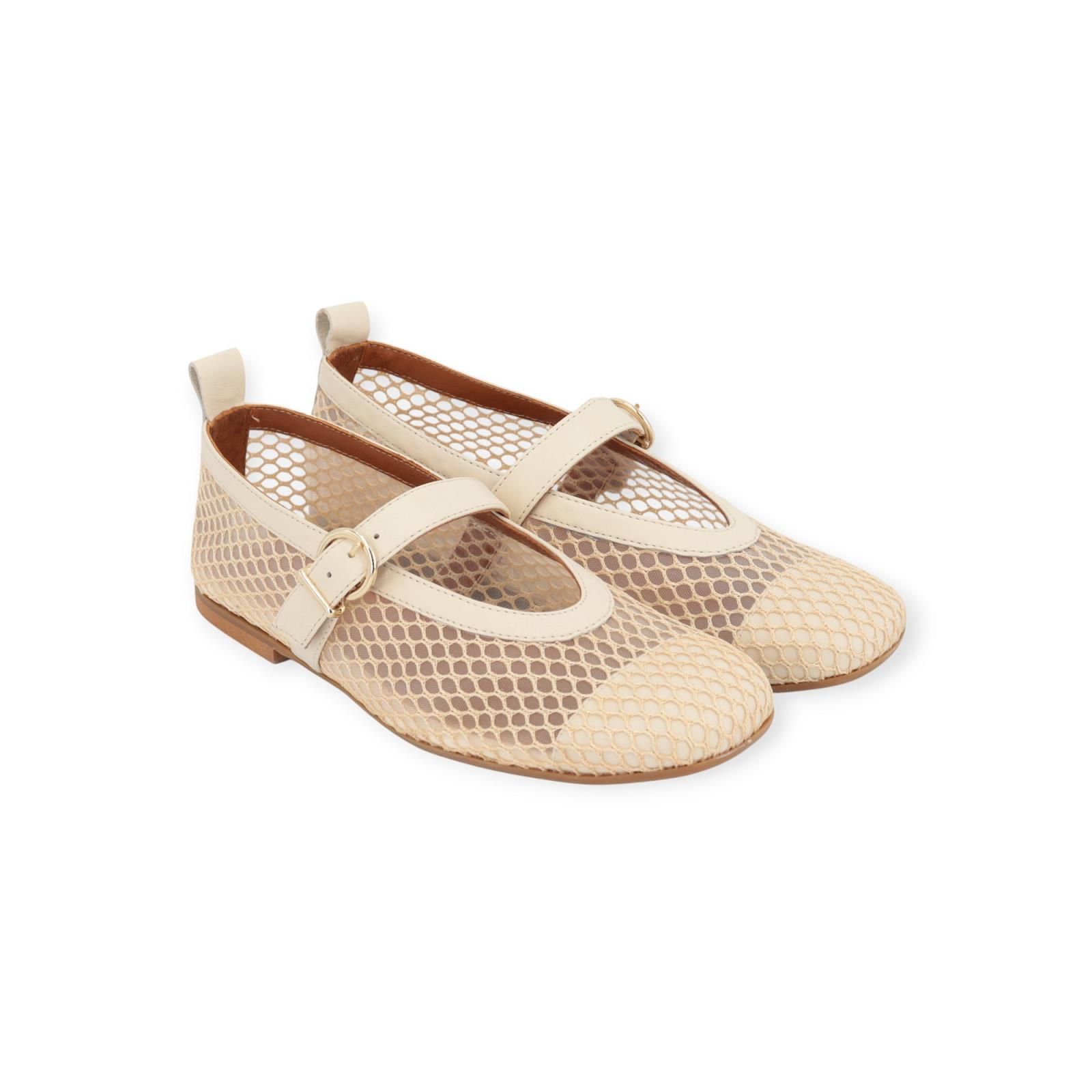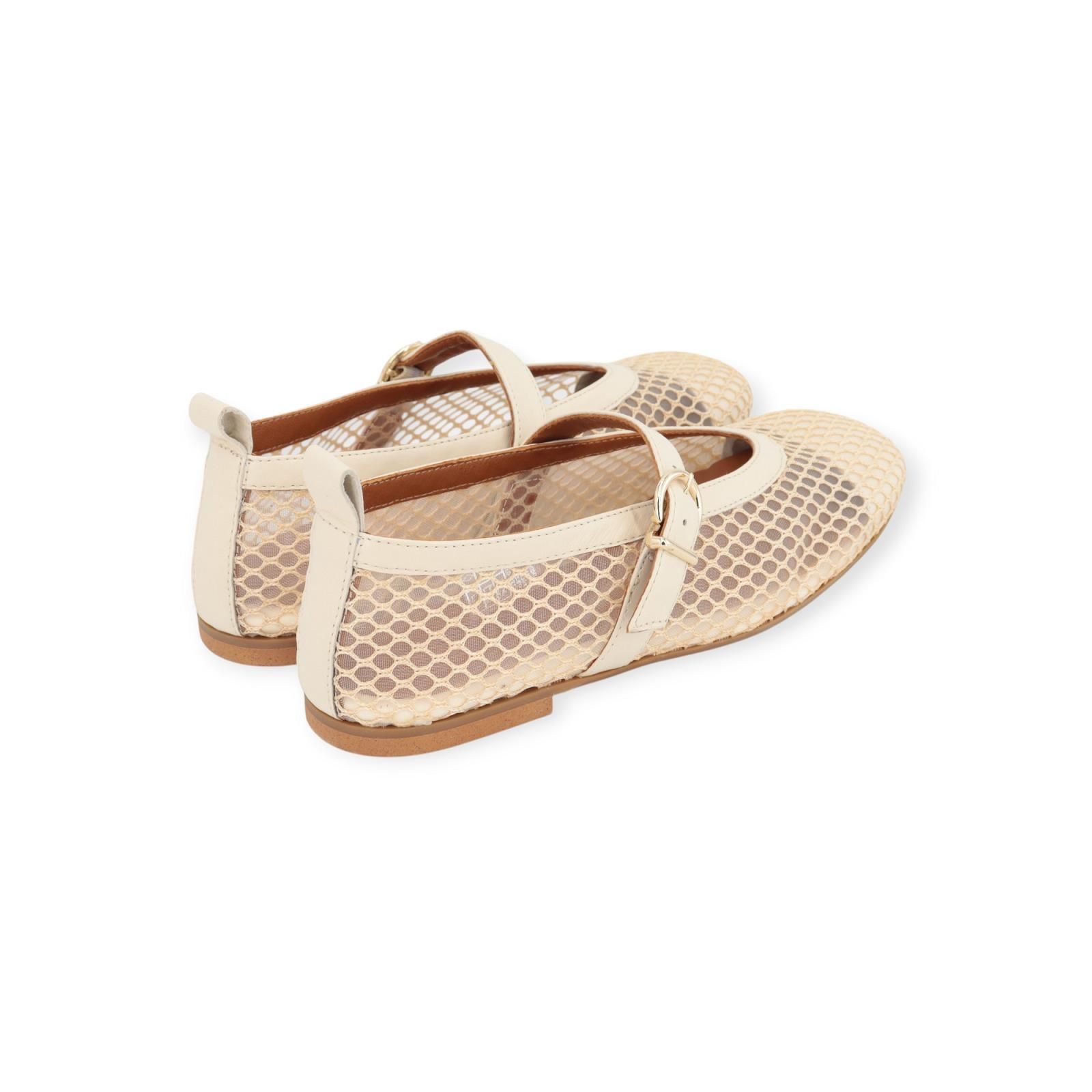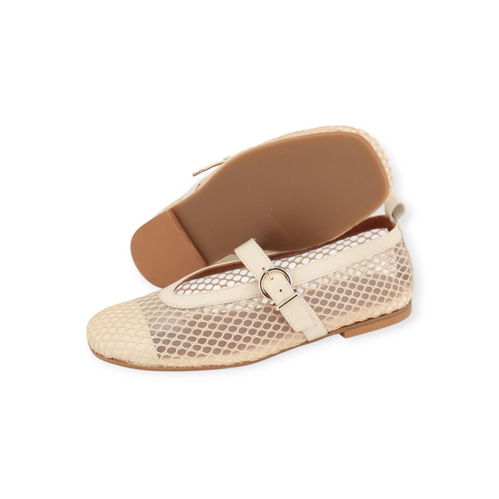 Ballerina Claudia Q8 van CTWLK – CATWALK voor dames. Deze elegante ballerina is in off wit geperforeerd leer met gaas. Is mooi omrand en aan de neus met effen leer. Heeft een bandje over de wreef met gouden gespsluiting. Is op een antislipzooltje.