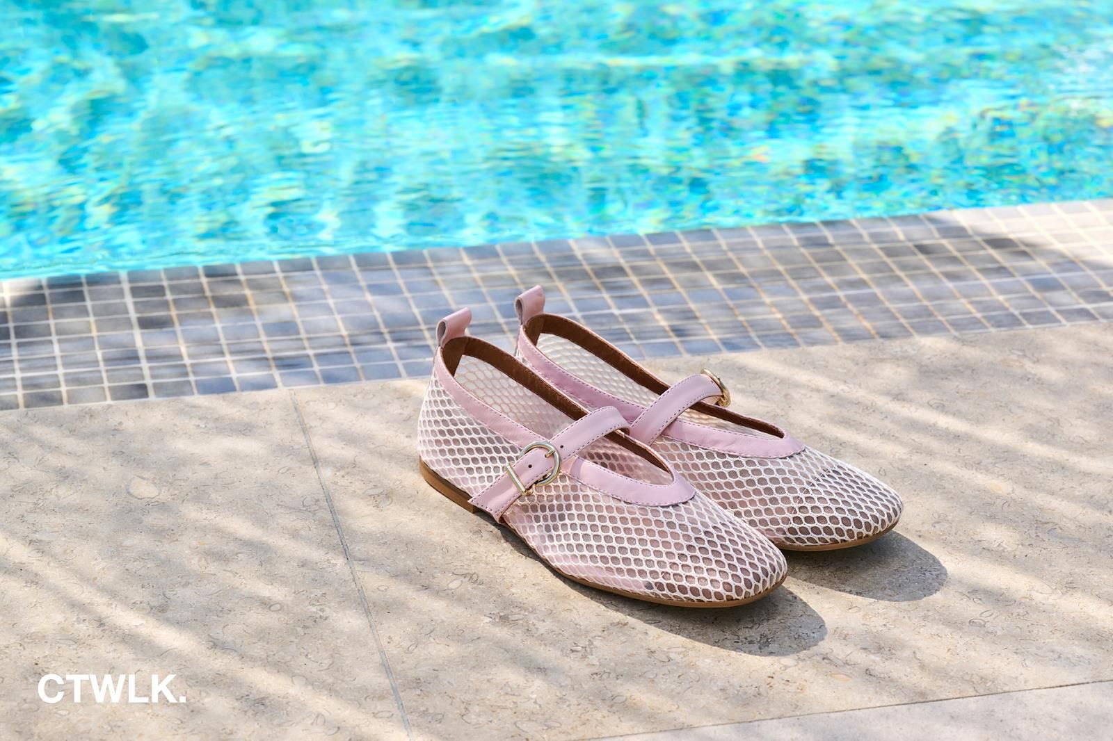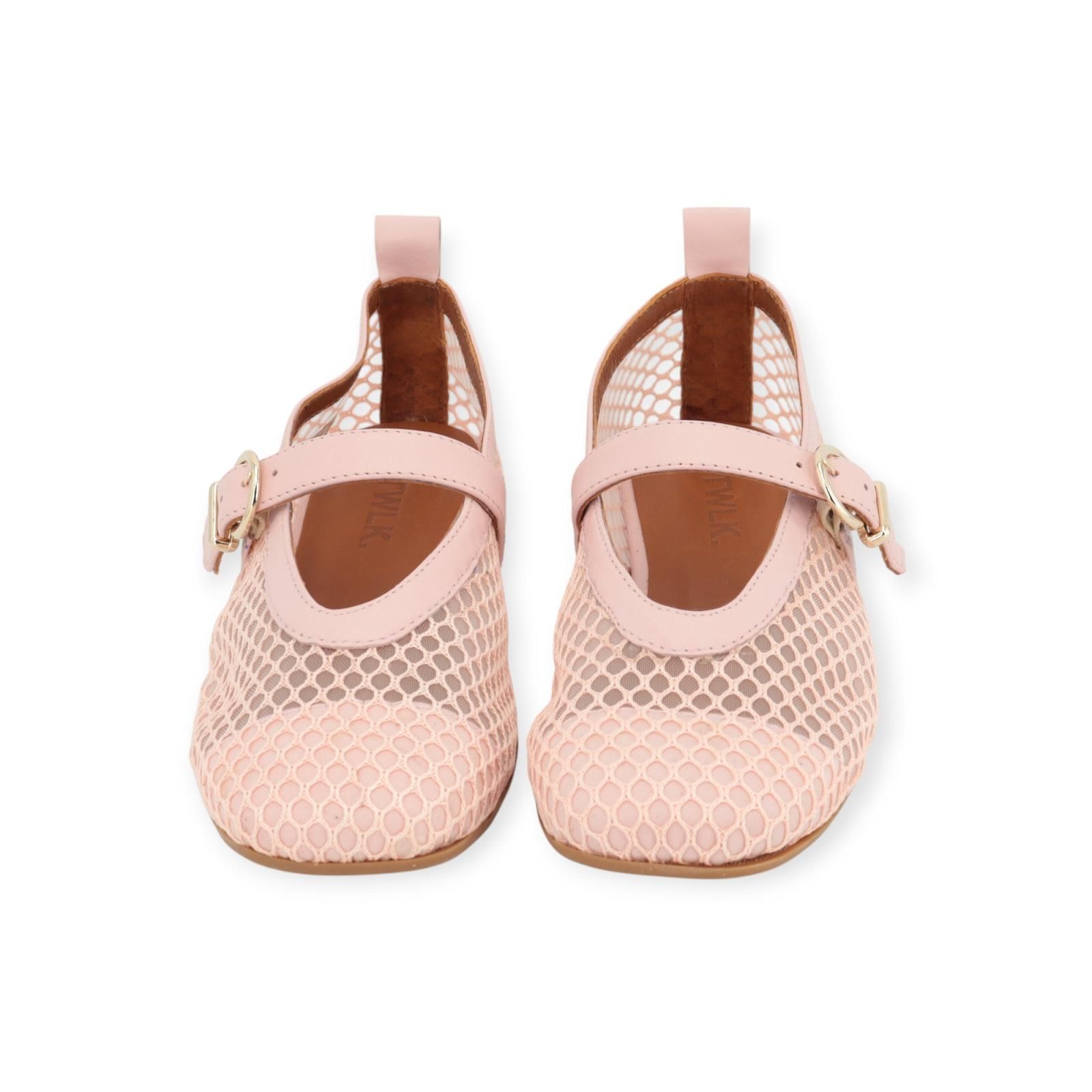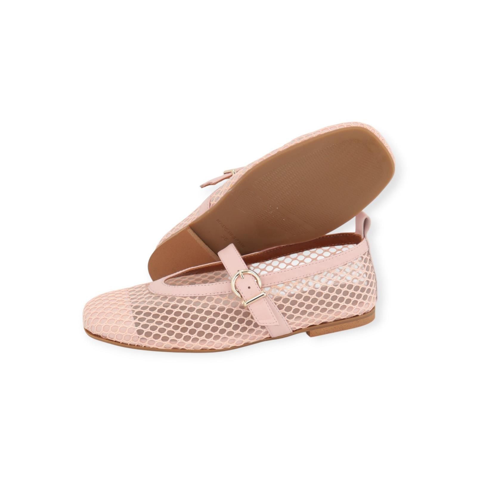 Ballerina Claudia R2 van CTWLK – CATWALK voor dames. Deze elegante ballerina is in roze geperforeerd leer met gaas. Is mooi omrand en aan de neus met effen leer. Heeft een bandje over de wreef met gouden gespsluiting. Is op een antislipzooltje.