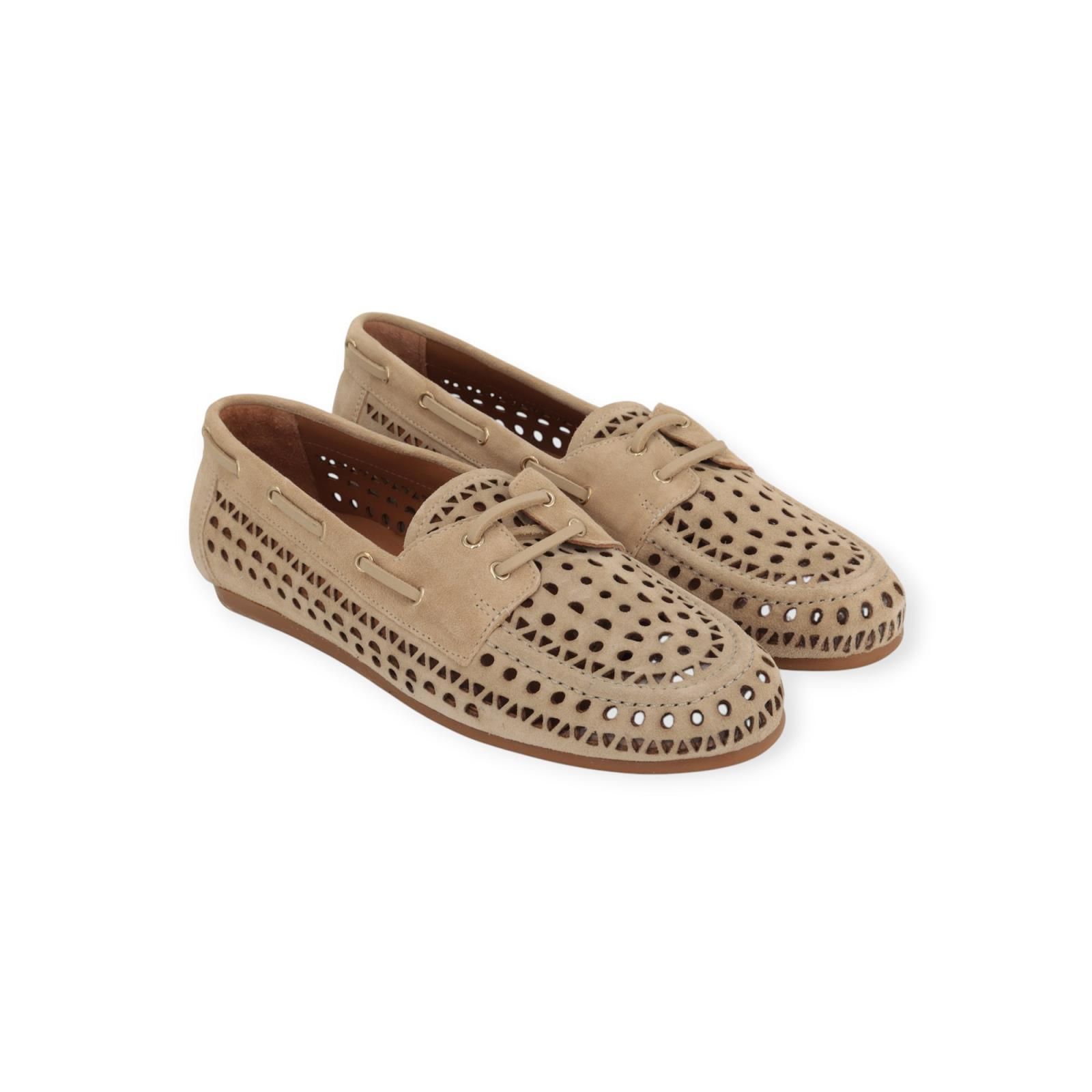 Mocassin Gigi F1 van CTWLK – Catwalk voor dames. Deze mocassin is in geperforeerde patronen beige suède. Heeft een vetersluiting en omrand met veters in gouden oogjes. Deze typische bootschoen stijl is de trend voor deze zomer. Is op een aangename antislipzool.