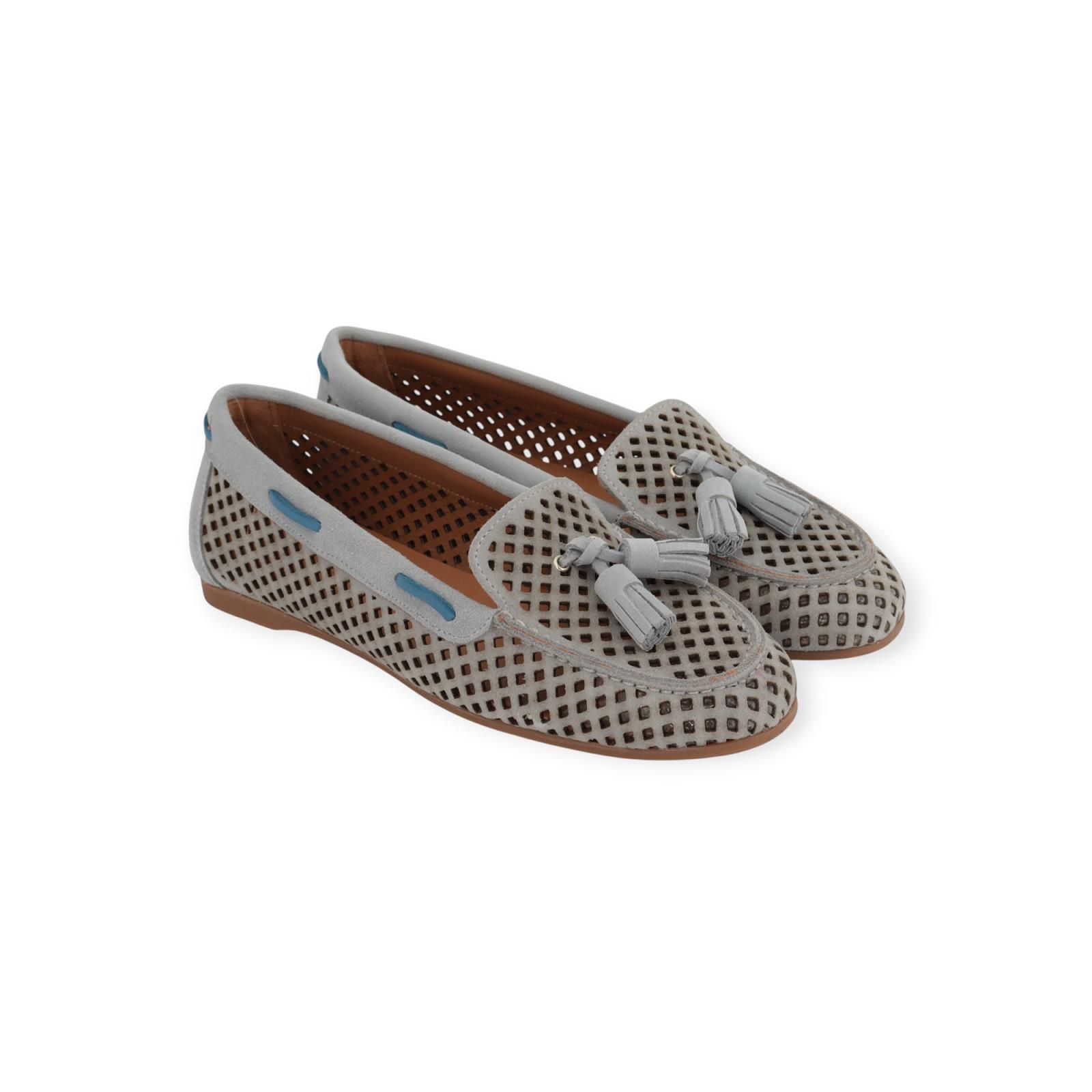 Mocassin Gilio J9 van CTWLK-Catwalk voor dames. Deze mocassin is in geperforeerd licht blauw suede leer. Is mooi afgewerkt met cognac leren veters langs de zijkant en een flosh op de wreef. Dit model is op een lichte antislipzool.