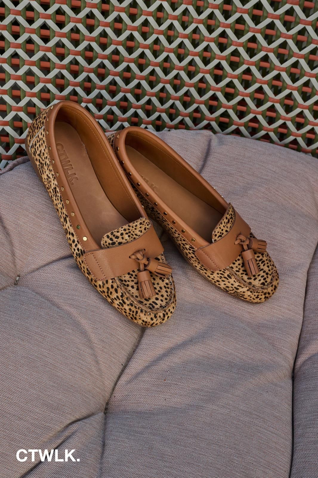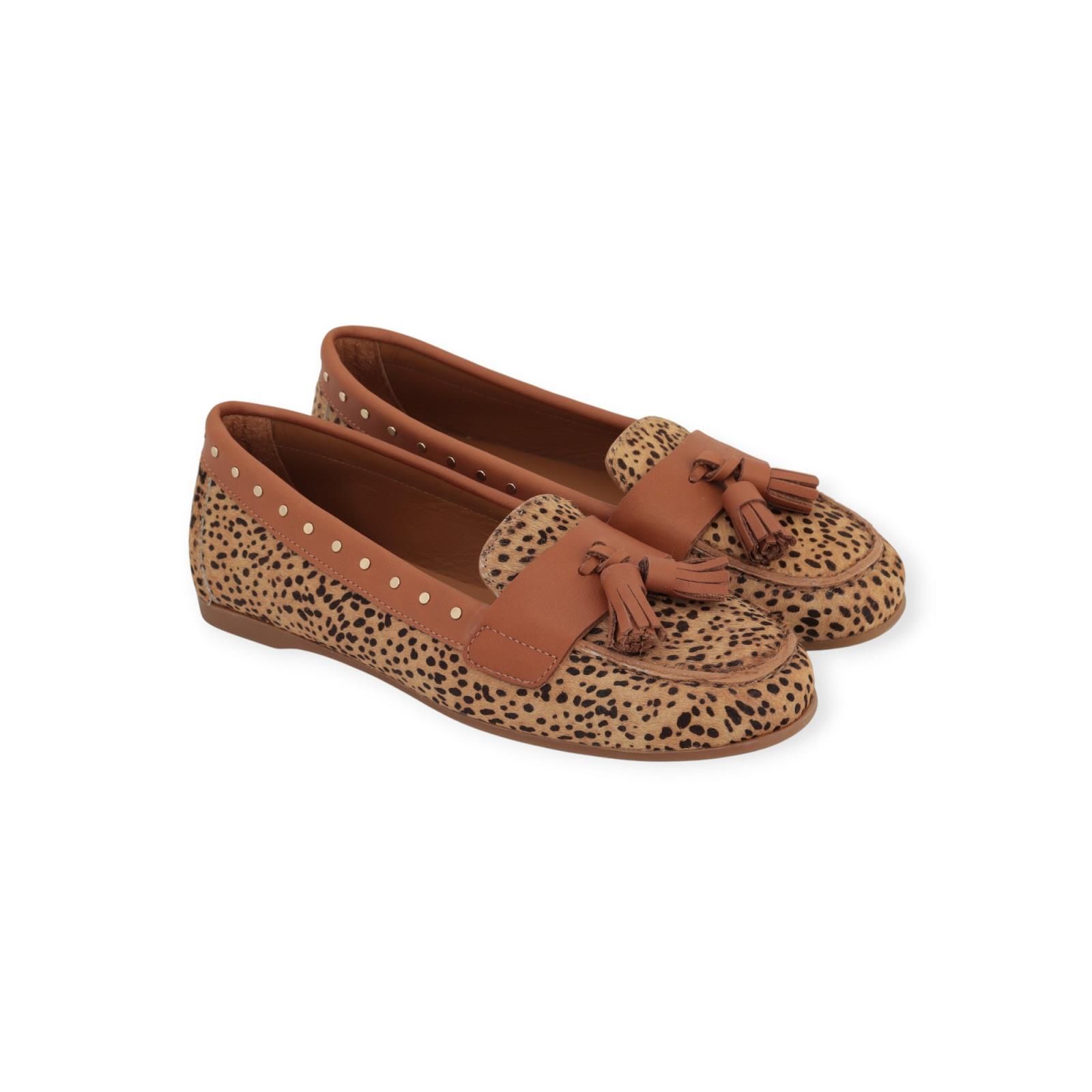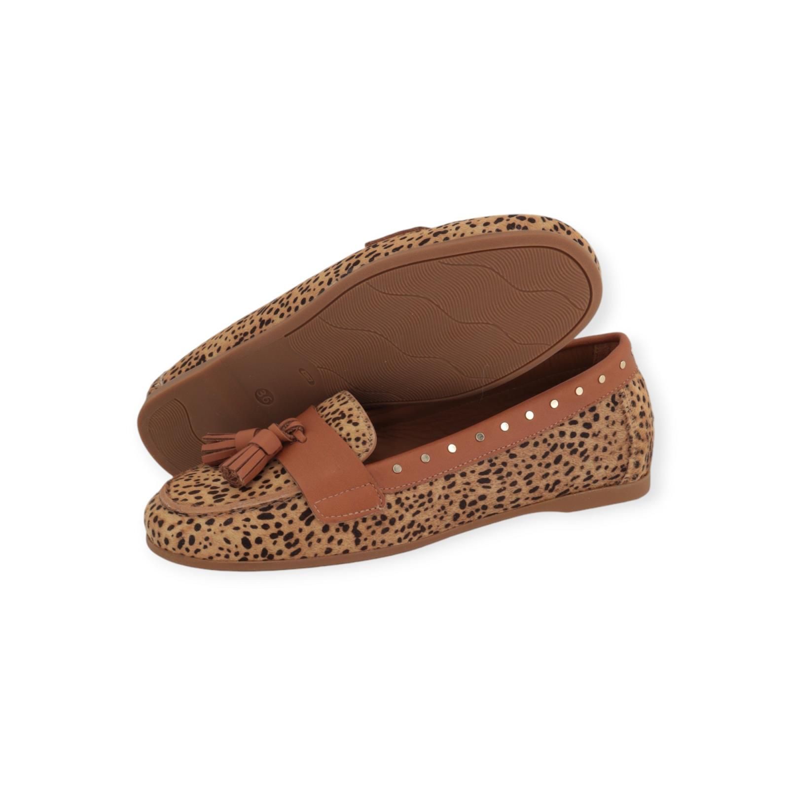 Mocassin Gilroy S2 van CTWLK – Catwalk voor dames. Deze mocassin is in leopard pony. Is omrand met cognac leer en studs en heeft een cognac band met flosh over de wreef. Is op een aangename antislipzool.
