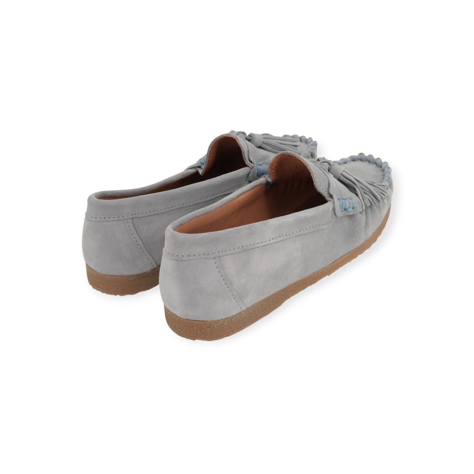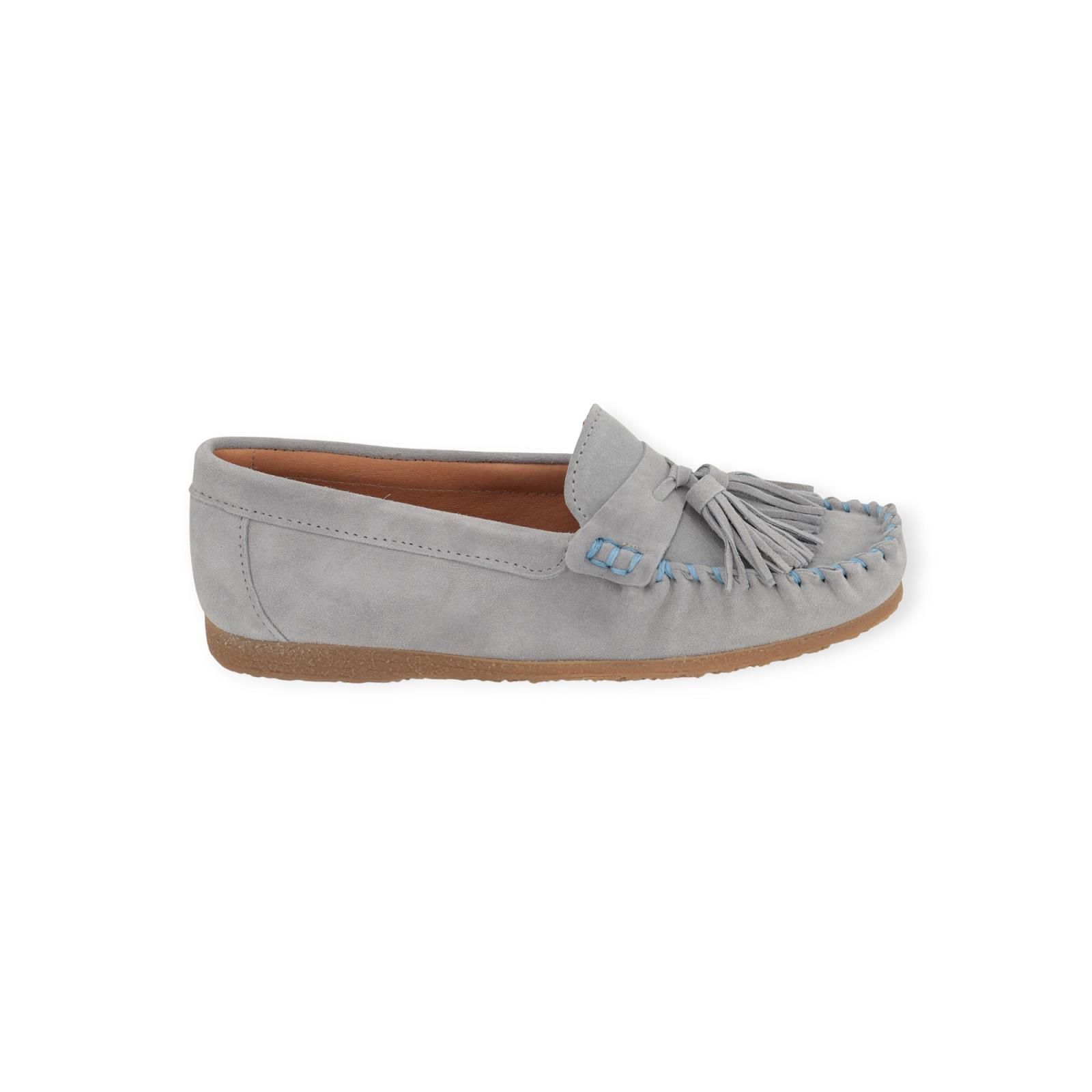 Mocassin Pablito E8 van CTWLK – Catwalk voor dames. Deze mocassin is in lichtblauw suède. Heeft een band over de wreef met een flosh en is met gestropt suède en breed stiksel rond de neus. Is op een aangename antislipzool.