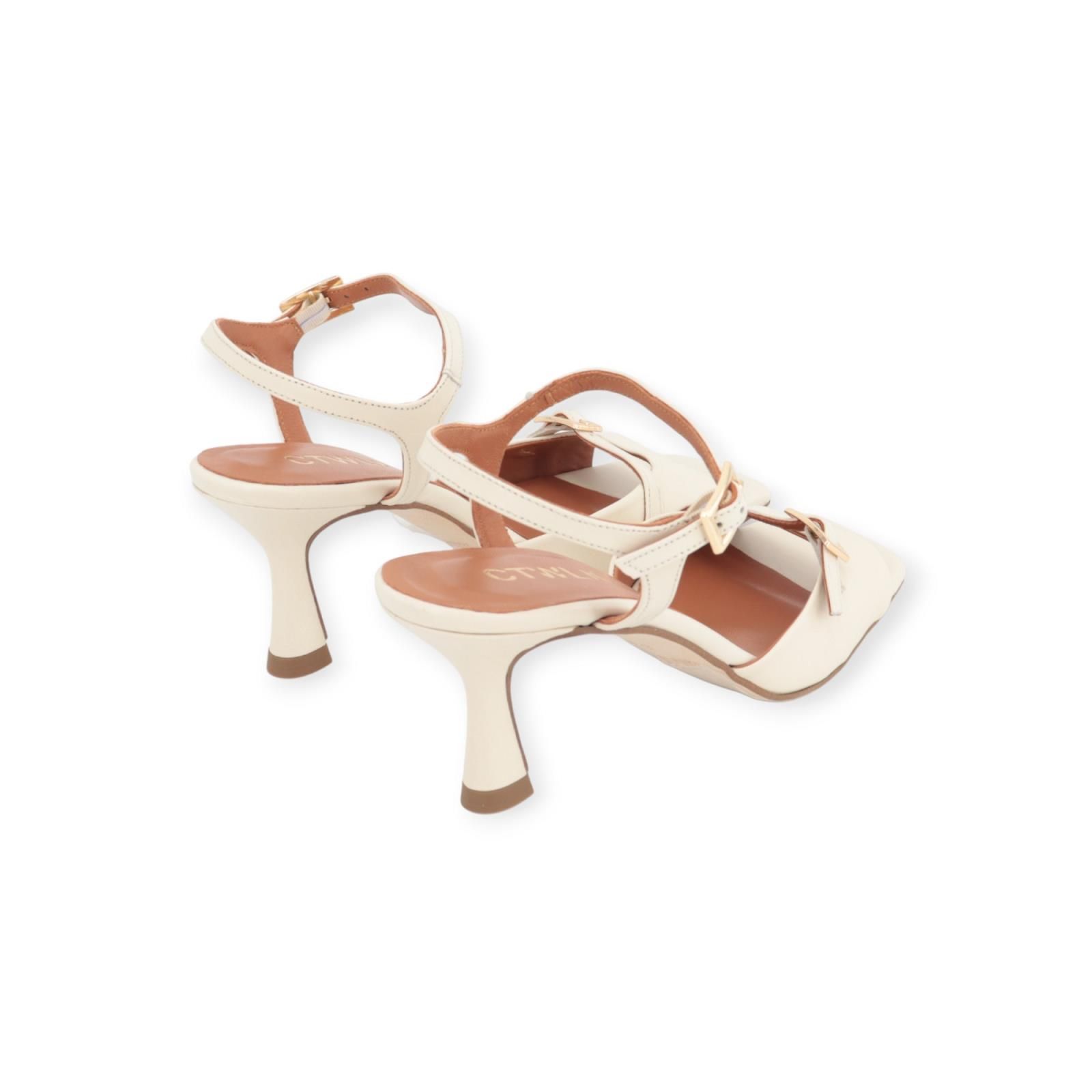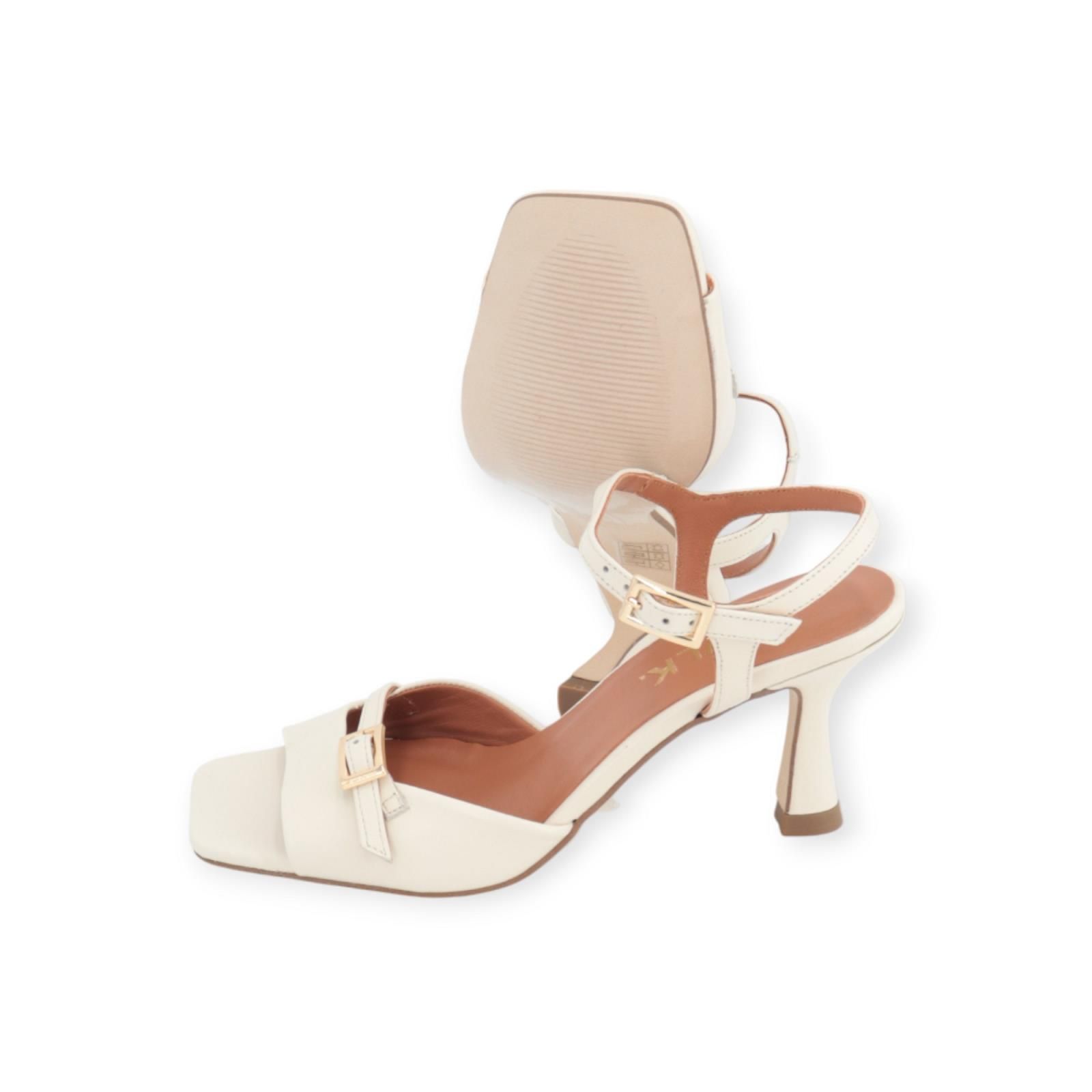 Sandaal Ramble W7 van CTWLK voor dames. Deze geklede sandaal is in off wit leer. Is een diep uitgesneden model met 2 bandjes over de wreef met gouden gespsluiting. Heeft een carré top en een fijn hakje van 6,5cm hoog. Is afgesloten met een bandje rond de enkel. De buitenzool is in leer.