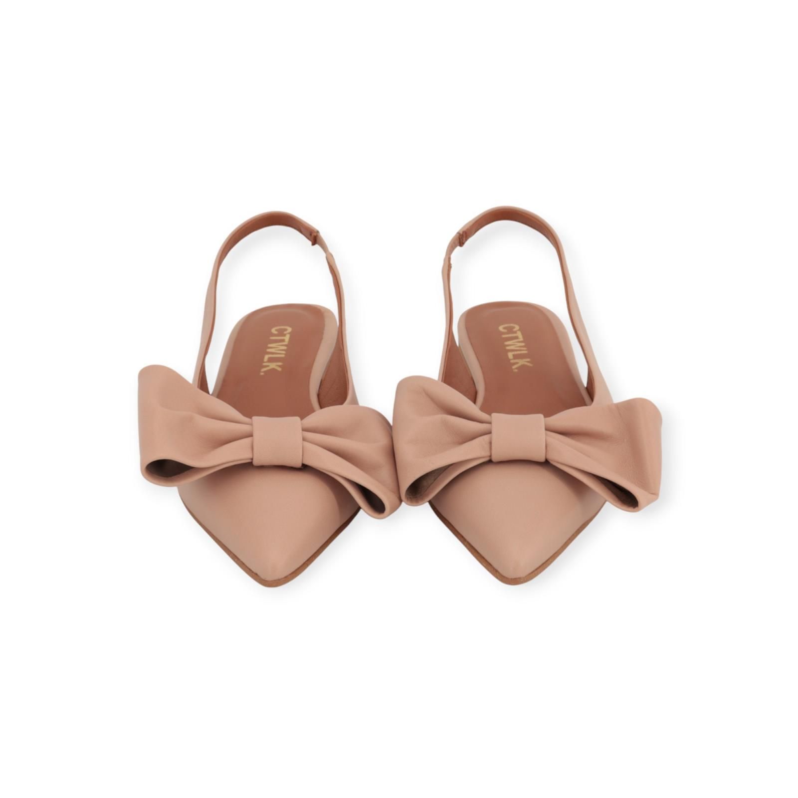 Ballerina Rocco X3 van CTWLK voor dames. Dit elegant nude ballerina in leer met een scherpe neus en een open hieltje. Op de wreef is er een grote strik voorzien. Het model blijft mooi aan de voet door een elastiek rond de enkel. Is op een leren zooltje.