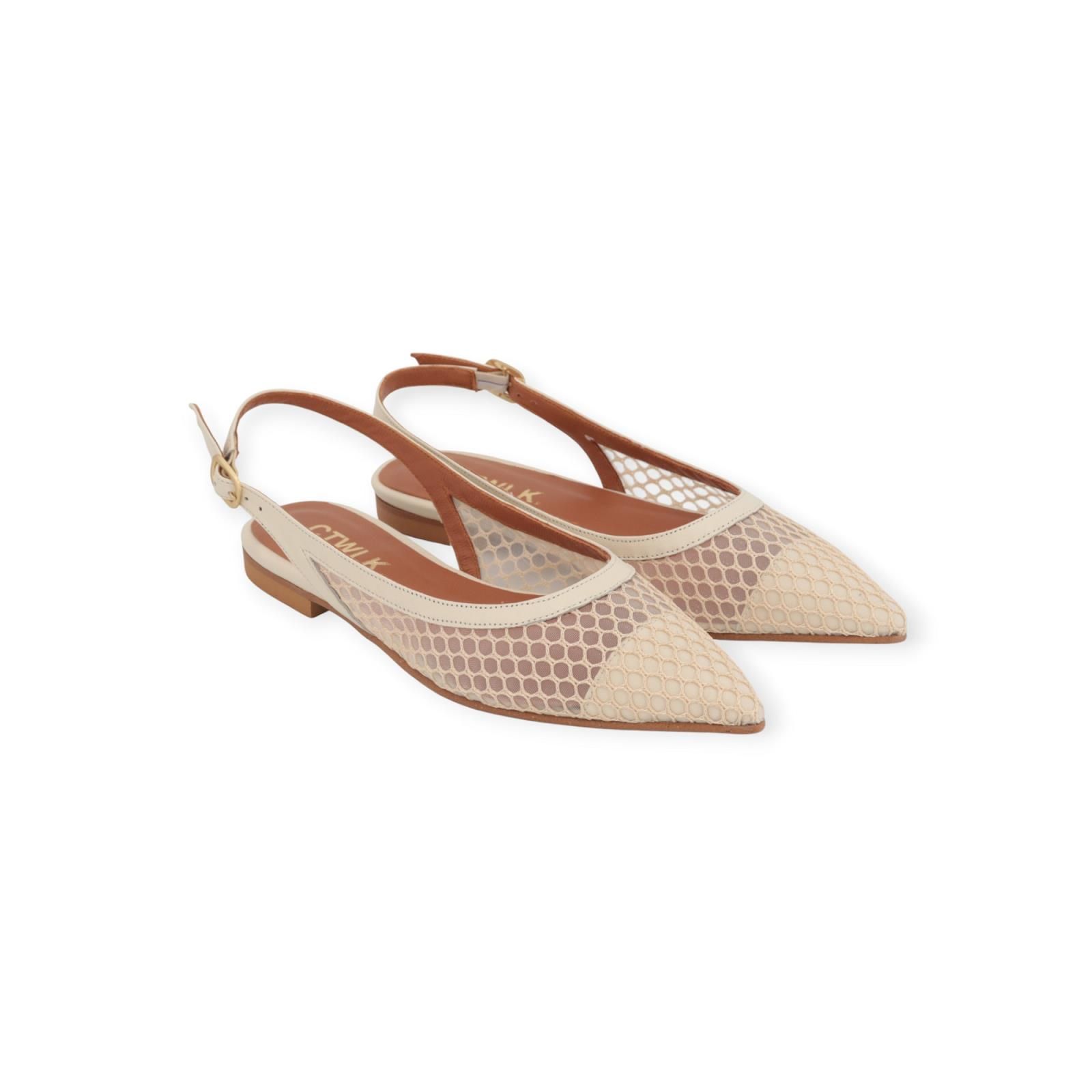 Ballerina Romee Q8 van CTWLK voor dames. Deze elegante slingback ballerina is in zacht beige leer met geperforeerde mesh. Heeft een scherpe neus met een open hieltje en een gespsluiting rond de enkel. De buitenzool is in leer.