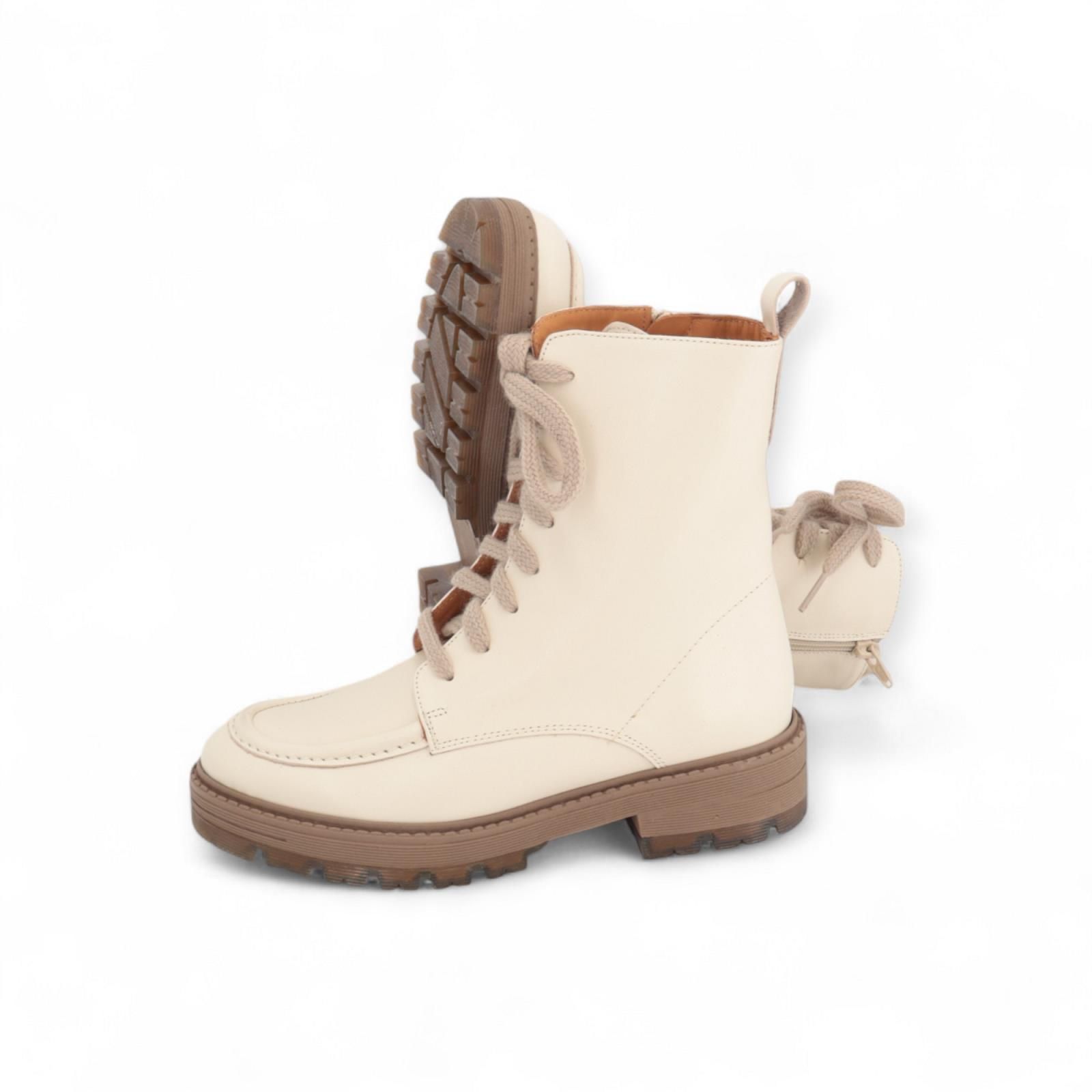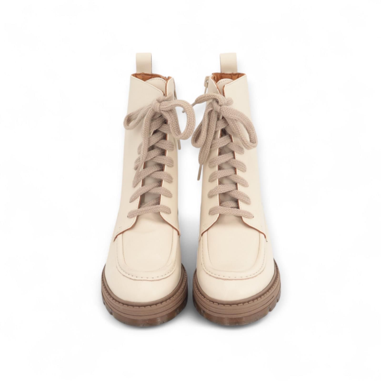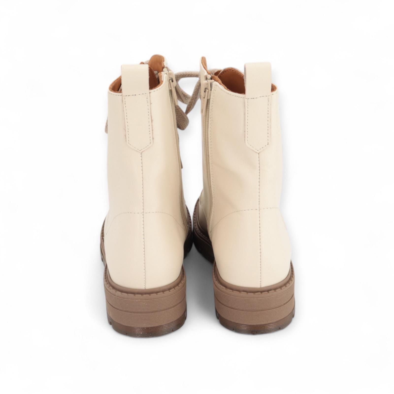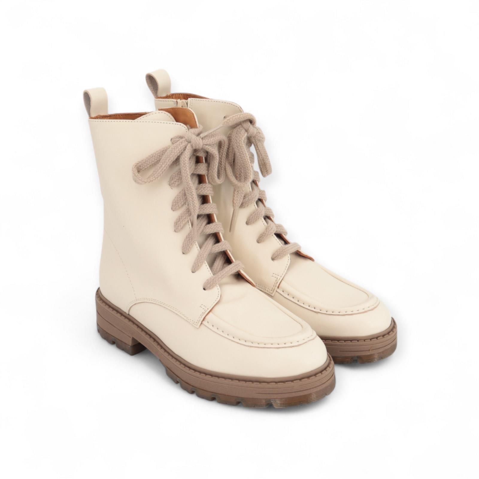 Enkellaars Serena van CTWLK voor dames. Deze bottine is in off wit leer met een dikke stekking op de voorvoet. Heeft een rits aan de zijkant en beige veters. Is op een dikke bruine antislipzool.