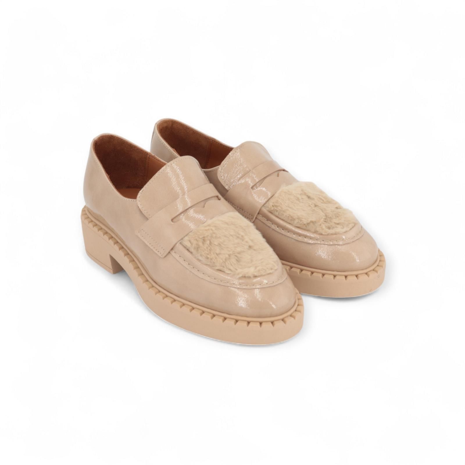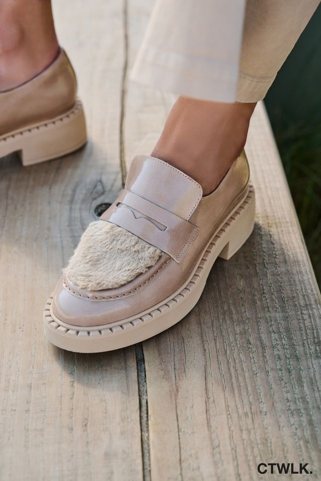 Mocassin Sheryl van Catwalk – CTWLK voor dames. Deze mocassin is in beige lakleer. Heeft op de voorvoet pony vel in beige en een band over de wreef. Is op een dikke beige antislipzool.