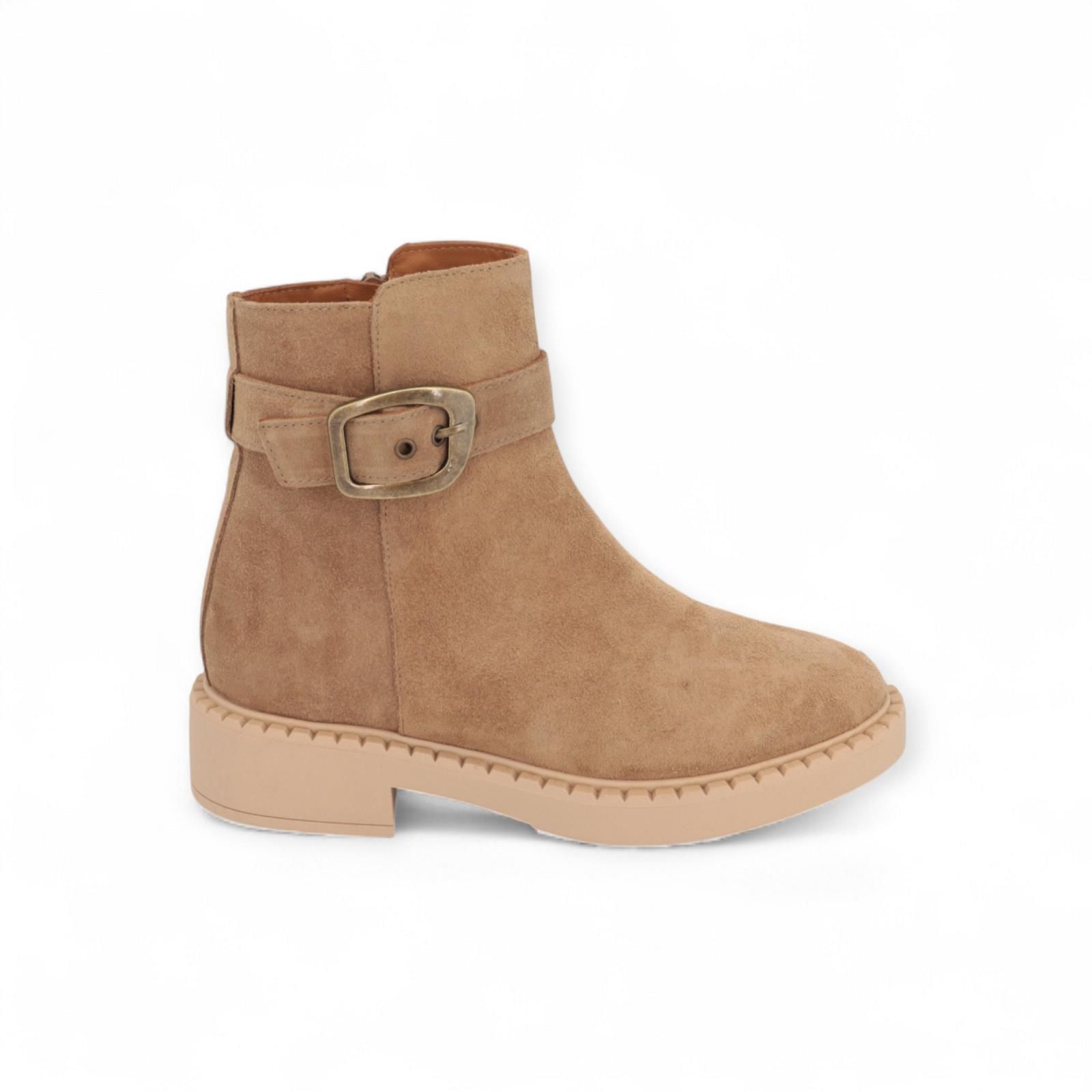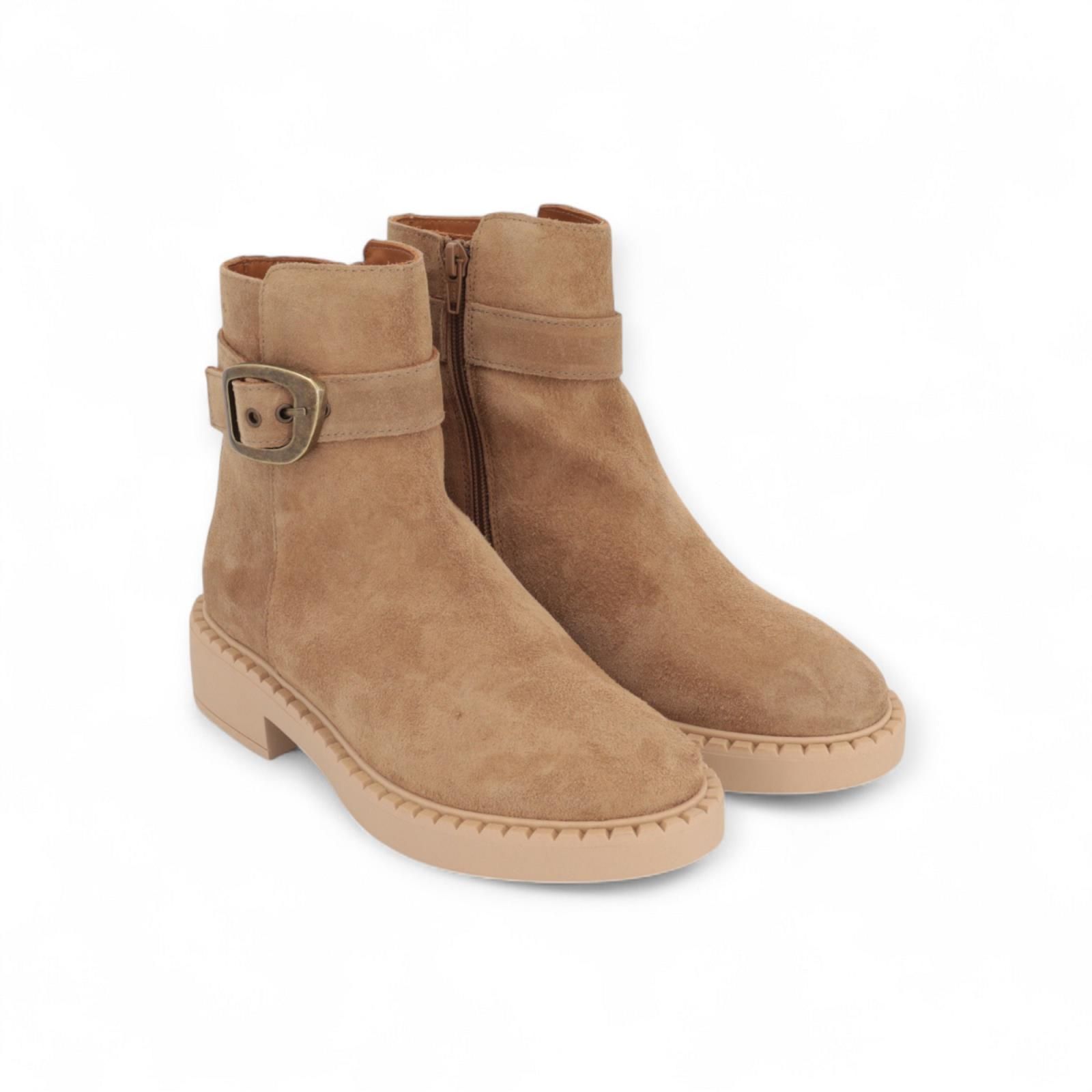 Enkellaars Sonja van CTWLK voor dames. Deze enkellaars is in zand suède. Heeft bovenaan aan de enkel een band met gespsluiting en een rits aan de zijkant. Heeft een ronde neus en is op een dikke beige gekartelde zool.