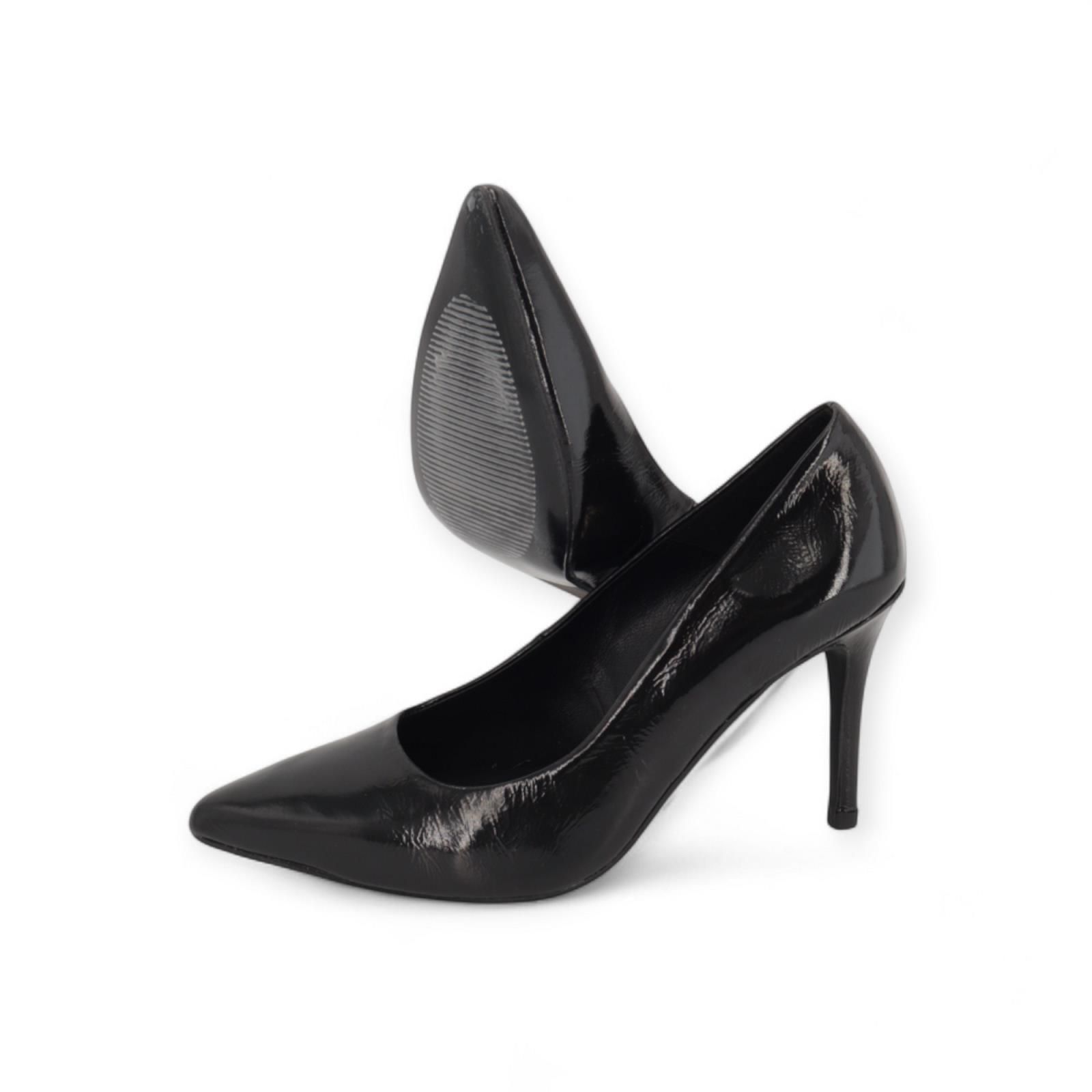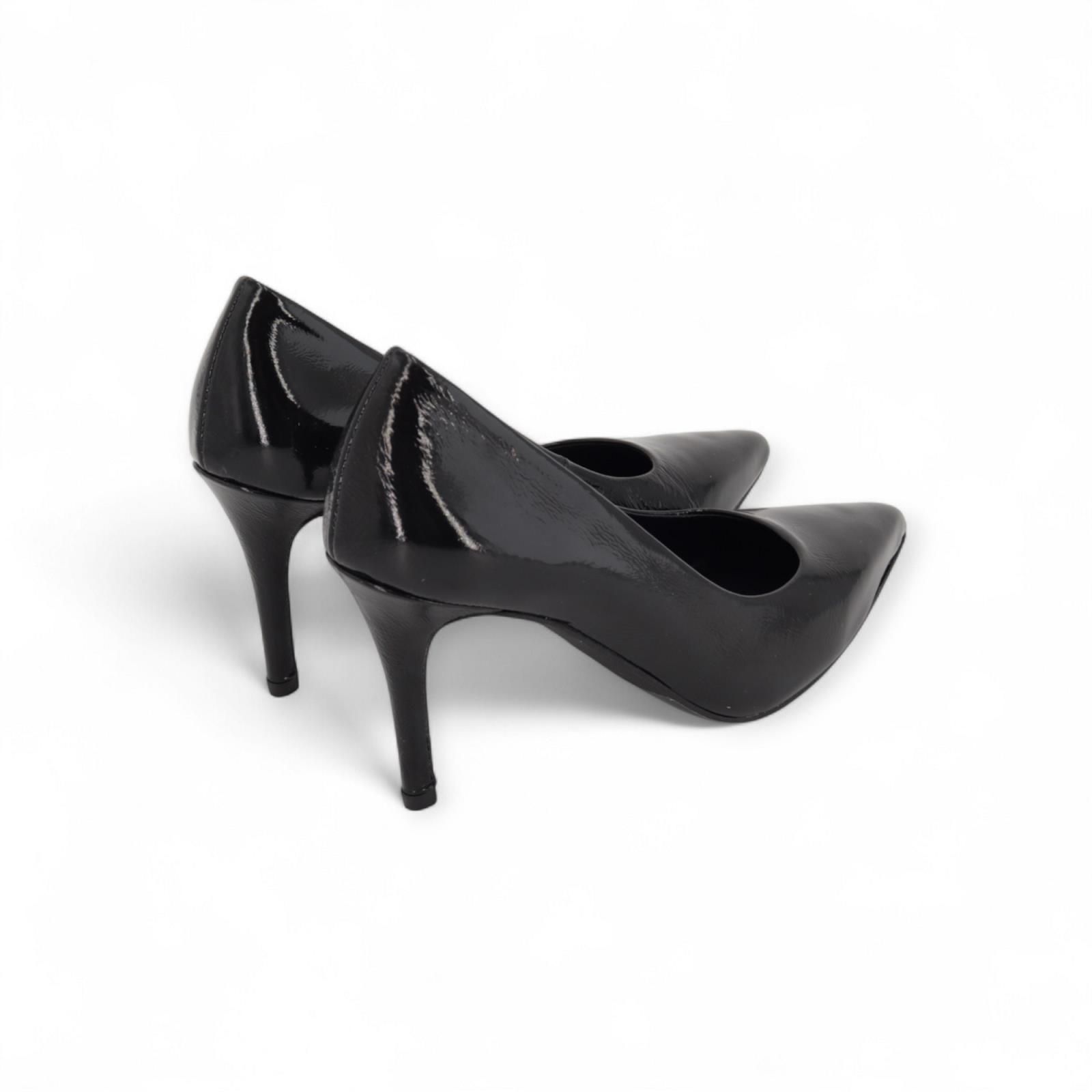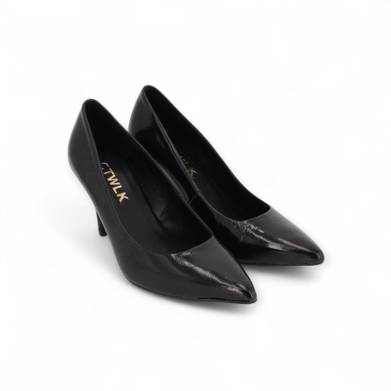 Pump Vabella van CTWLK voor dames. Deze pump is in zwart lakleer. Heeft een scherpe neus en een fijn naaldhakje van 7-7.5cm hoog.