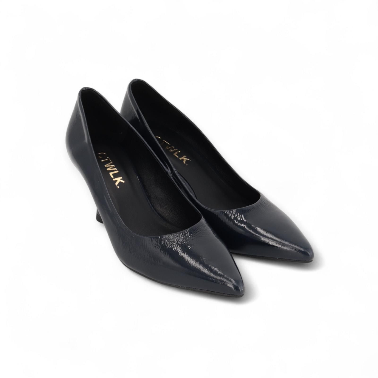 Pump Vaomy van CTWLK voor dames. Deze pump is in blauw lakleer. Heeft een scherpe neus en een geometrisch fijn hakje van 7-7.5cm hoog.