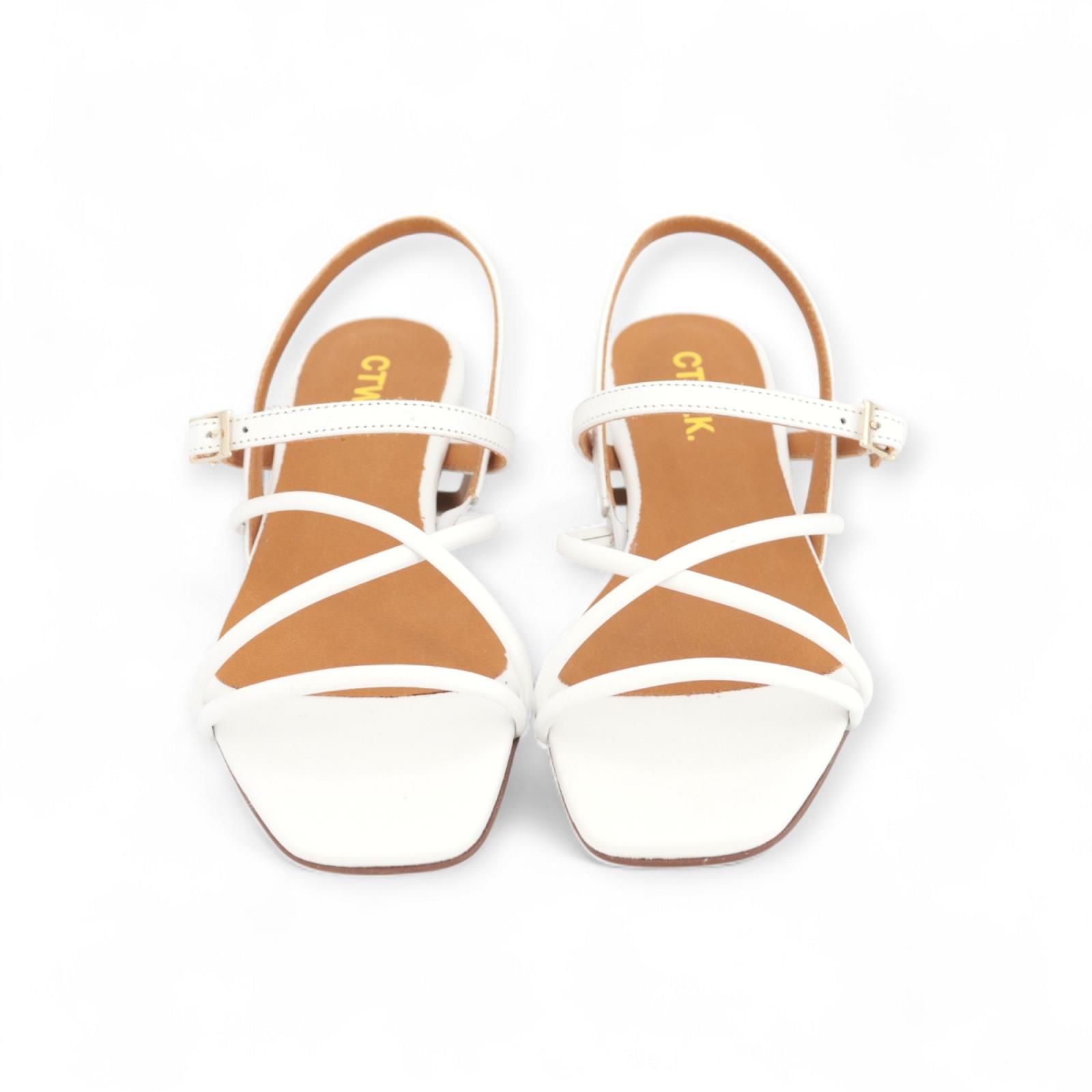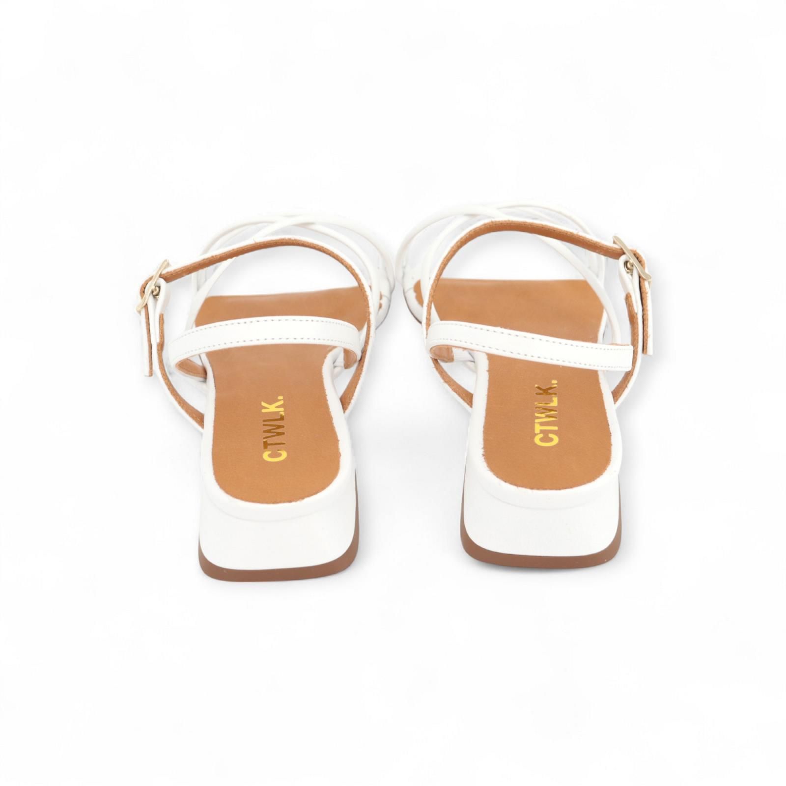 Vatessa CTWLK / Catwalk sandaal in wit voor dames. Dit gekleed sandaaltje is volledig uit leder met carré top vooraan. Is voorzien van bandjes aan de wreef en aan de hiel met een gespsluiting aan de enkel. Is op een klein hakje van +/-2cm die doorloopt van kleur met de rest.