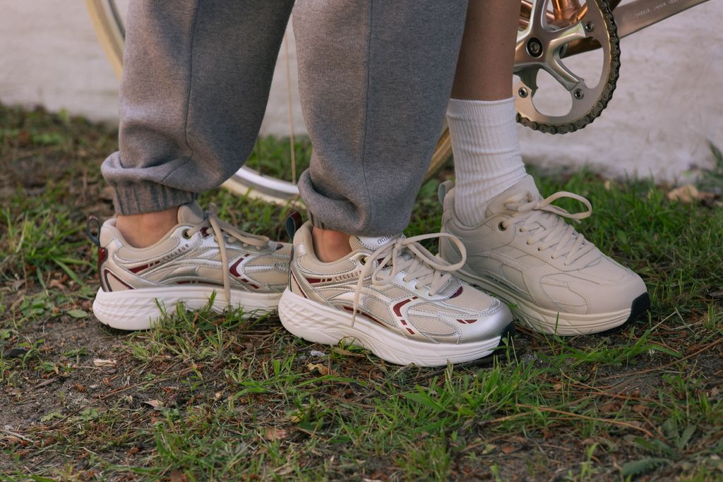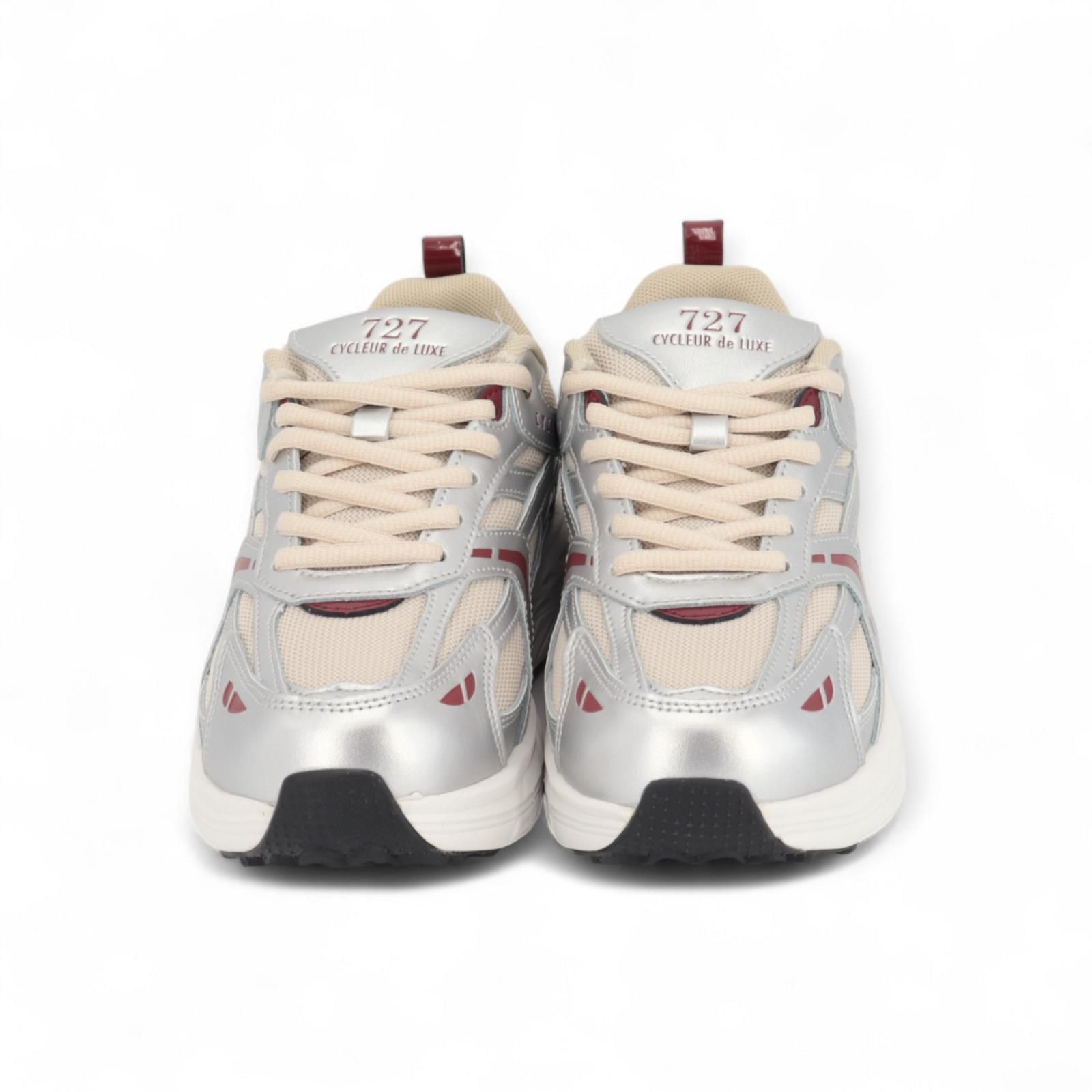 Sneaker CH1 van Cycleur De Luxe voor dames. Deze runner is in zilver shining leer met off wit mesh en bordeaux accenten. Heeft een dikke zool die licht aanvoelt. De binnenzool is uitneembaar.
