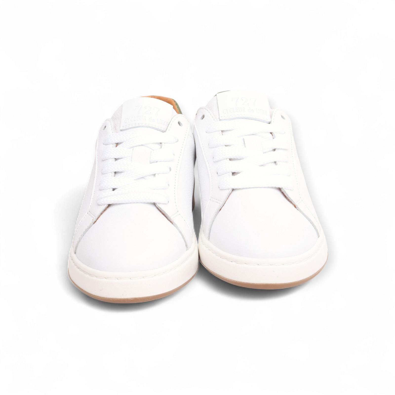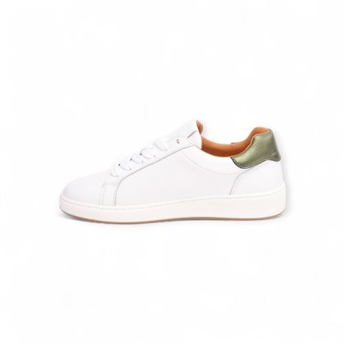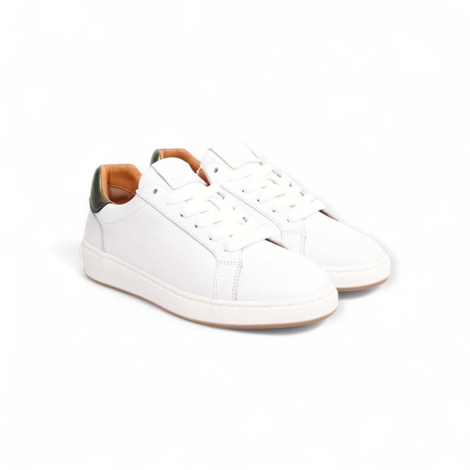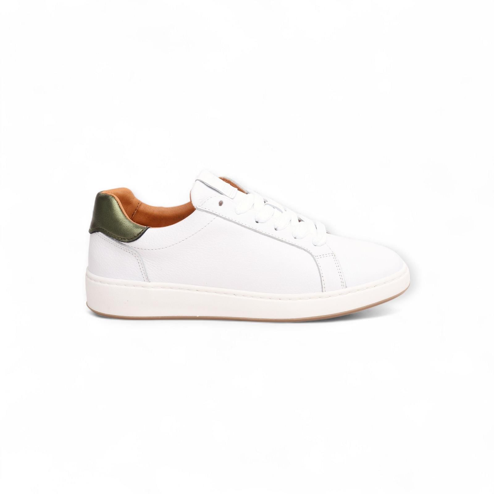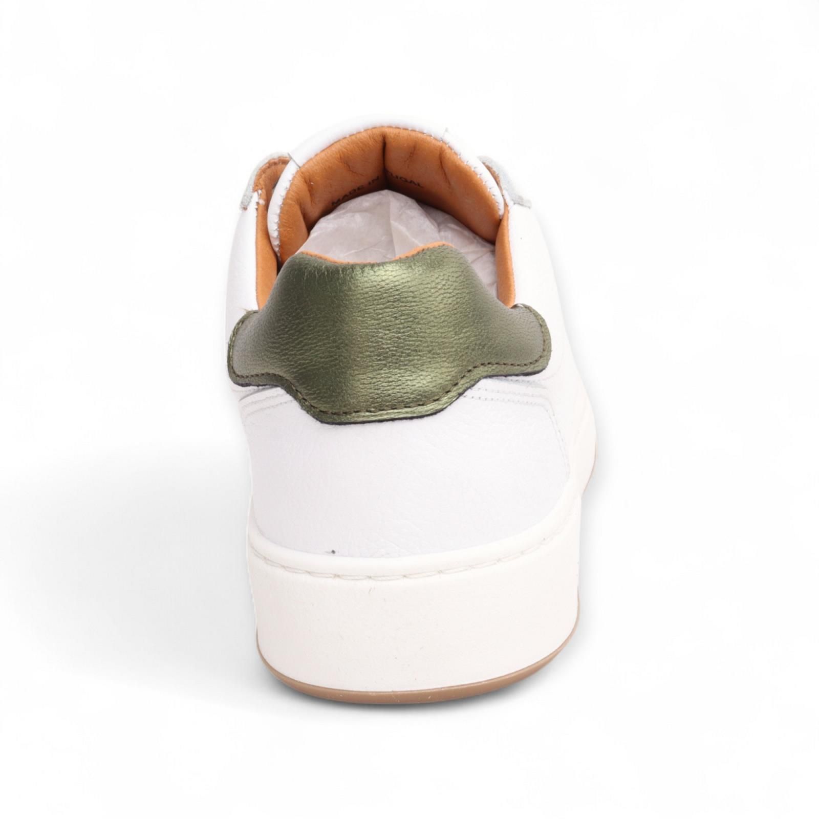 Sneaker Dipstick van Cycleur de Luxe voor dames. Deze sneaker is in wit leder met een groen shining hielflap. Is met een uitneembare binnenzool.