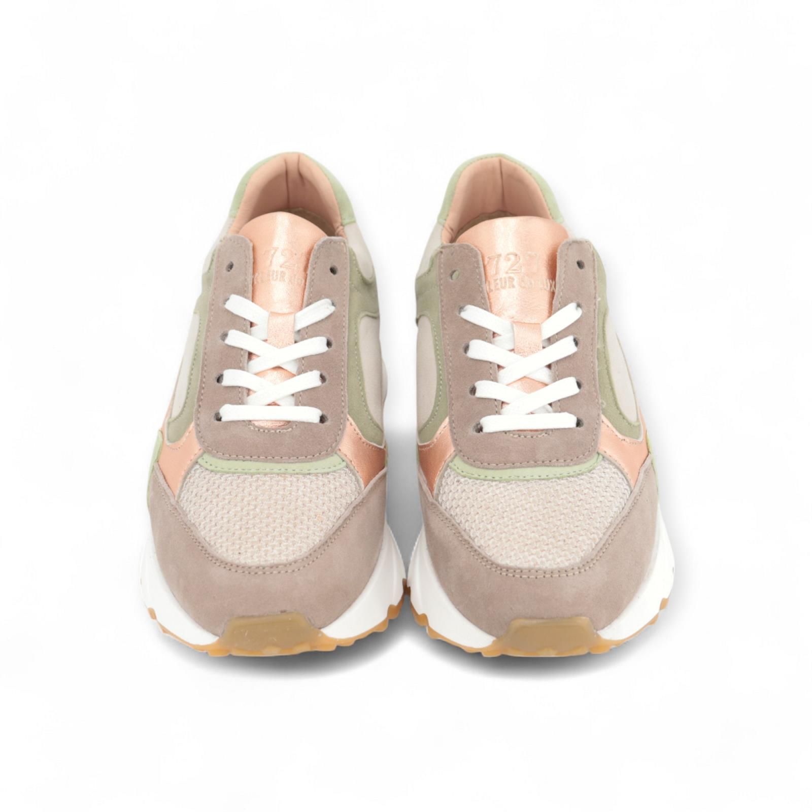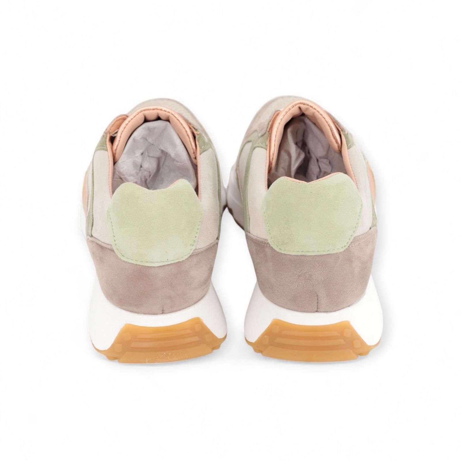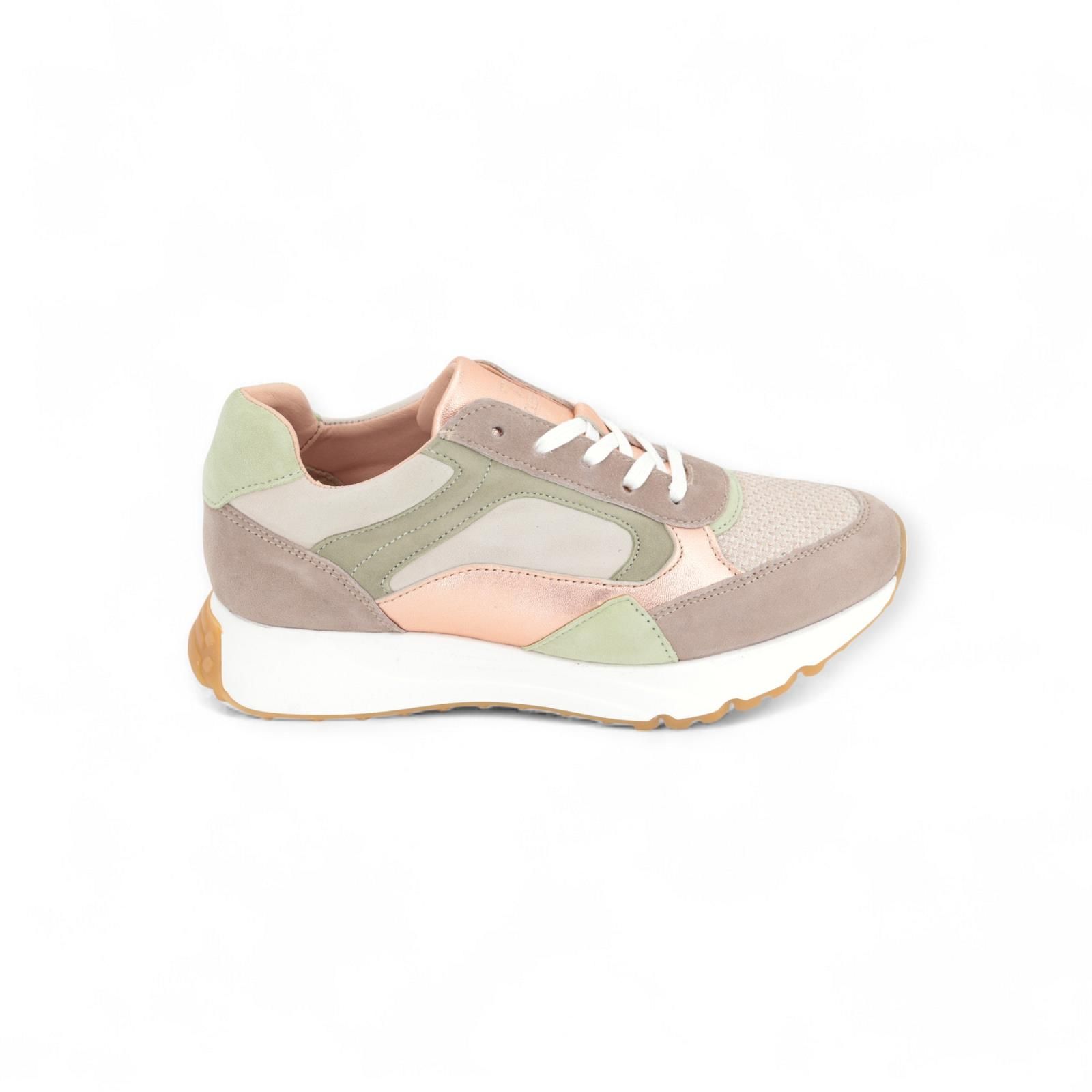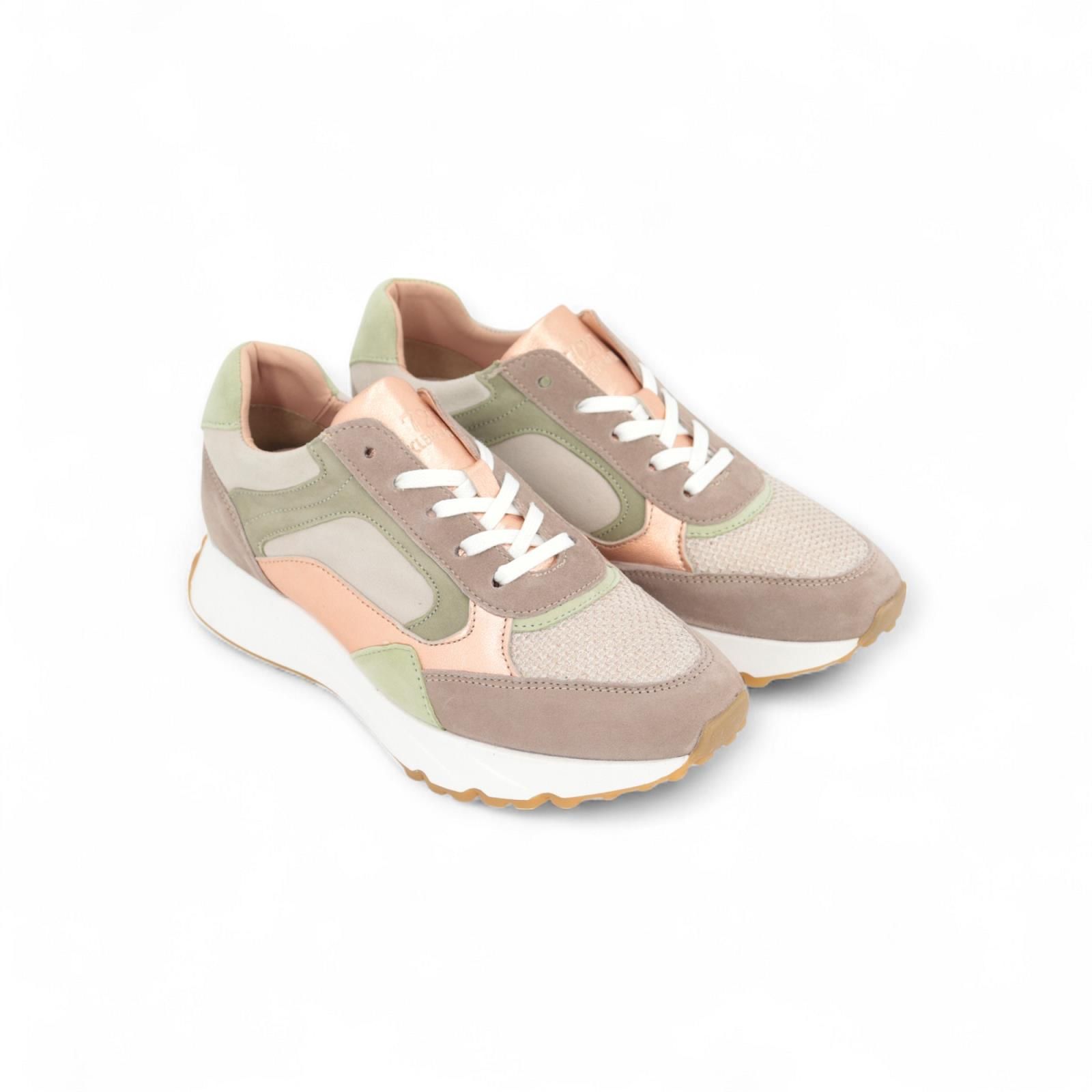 Drina Cycleur De Luxe sneaker voor dames. Deze runner model is in zand suède met taupe en lichtgroene tinten , beige mesh vooraan aan de voet met een witte veter. Aan de flap en zijkanten rosé shining lederstukken. De hiel is in lichtgroen met taupe. Deze runner heeft een uitneembare binnenzool.