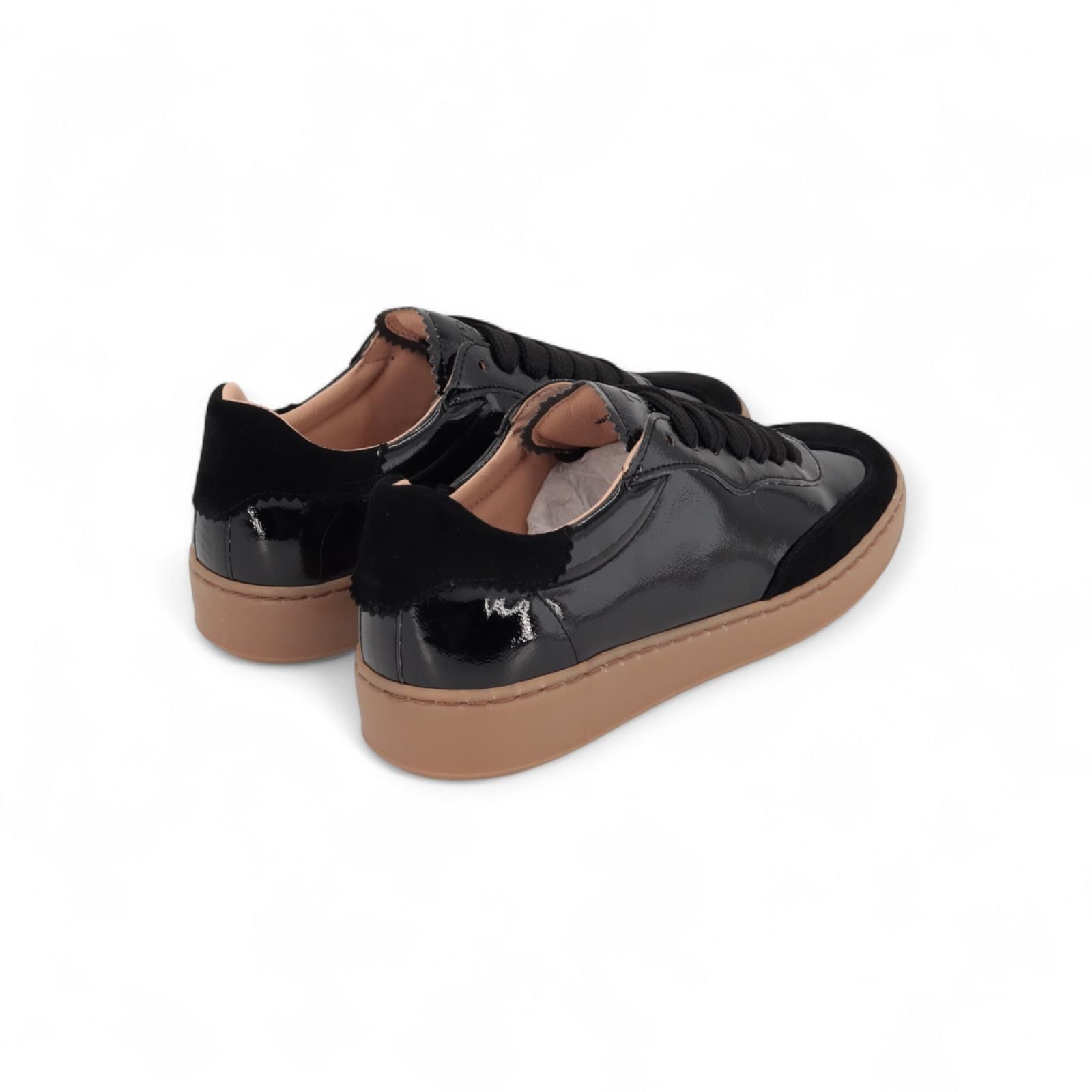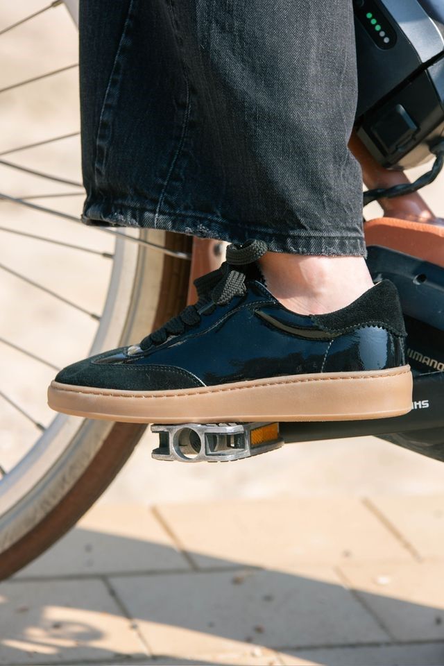Sneaker Jawn van Cycleur de Luxe voor dames. Deze sneaker is in zwart lakleer met suède aan de voorkant. Heeft een zwart gekartelde hielflap. Is op een lichte gummyzool en de binnenzool is uitneembaar.