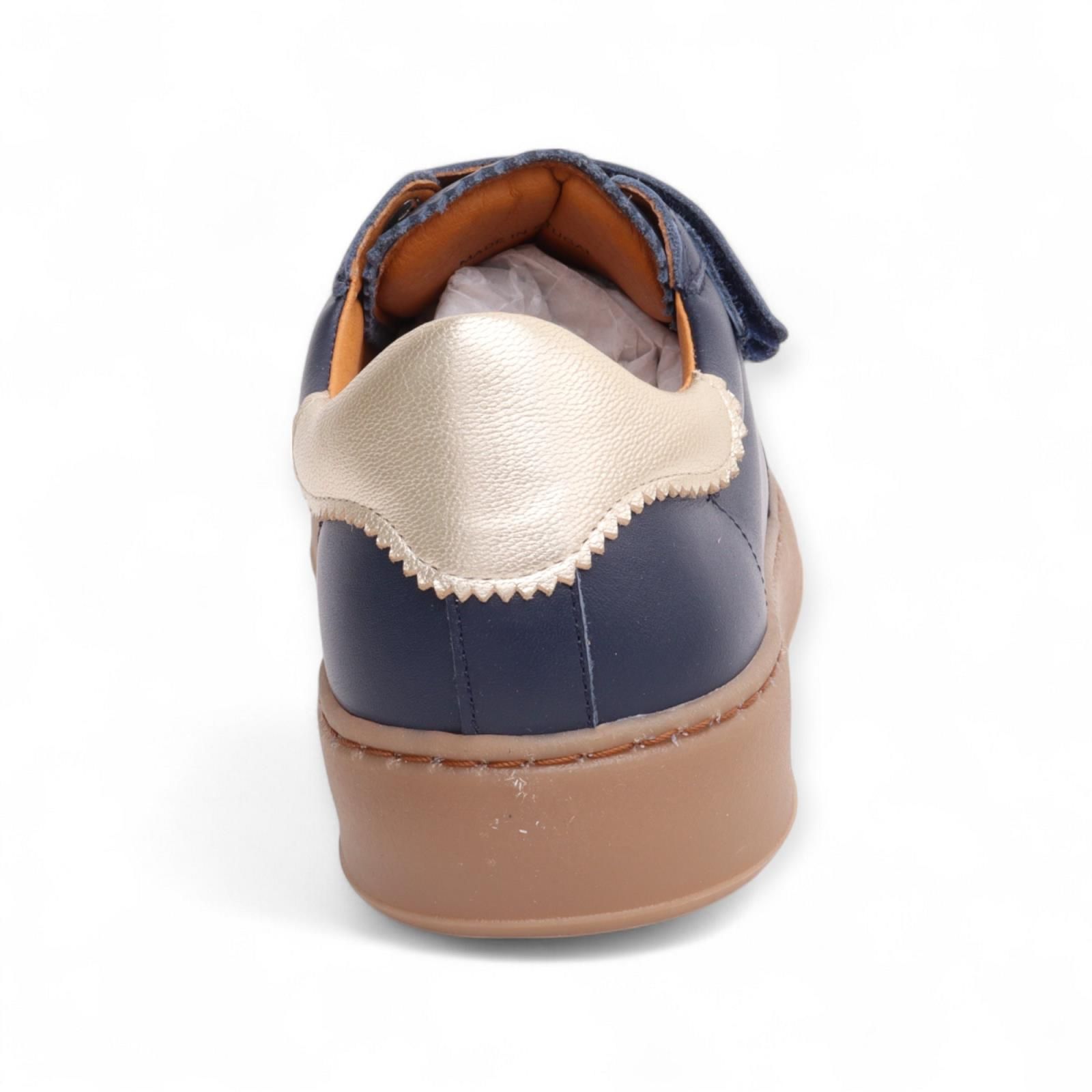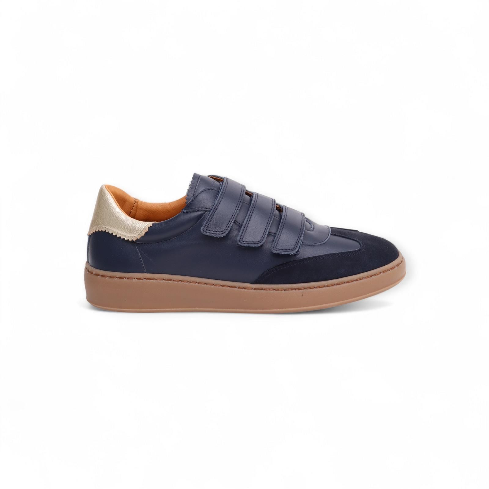 Sneaker Jawn Strap van Cycleur de Luxe voor dames. Deze sneaker is in blauw leder met suède aan de voorkant. Heeft een gouden hielflap. Is op een gummyzool en de binnenzool is uitneembaar.