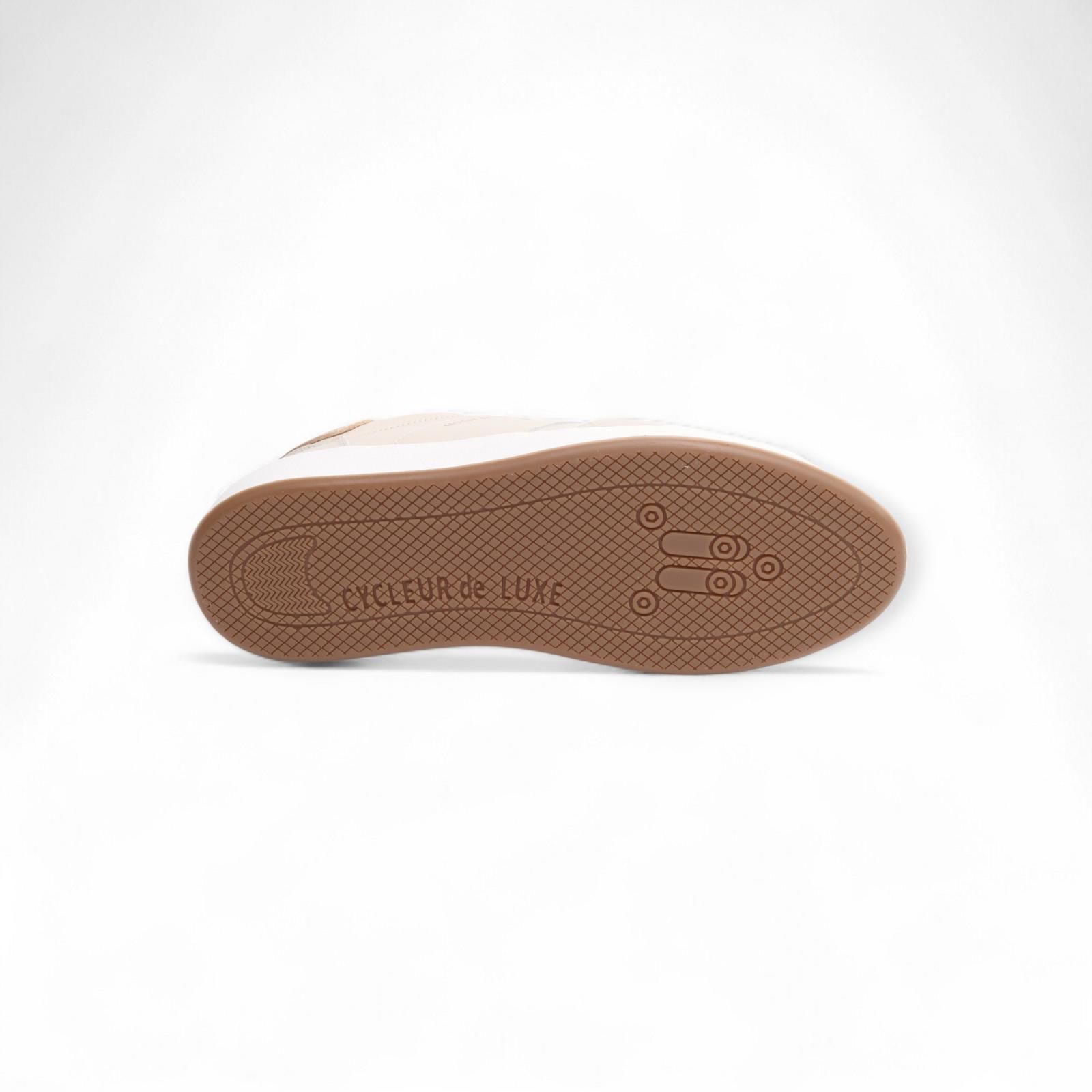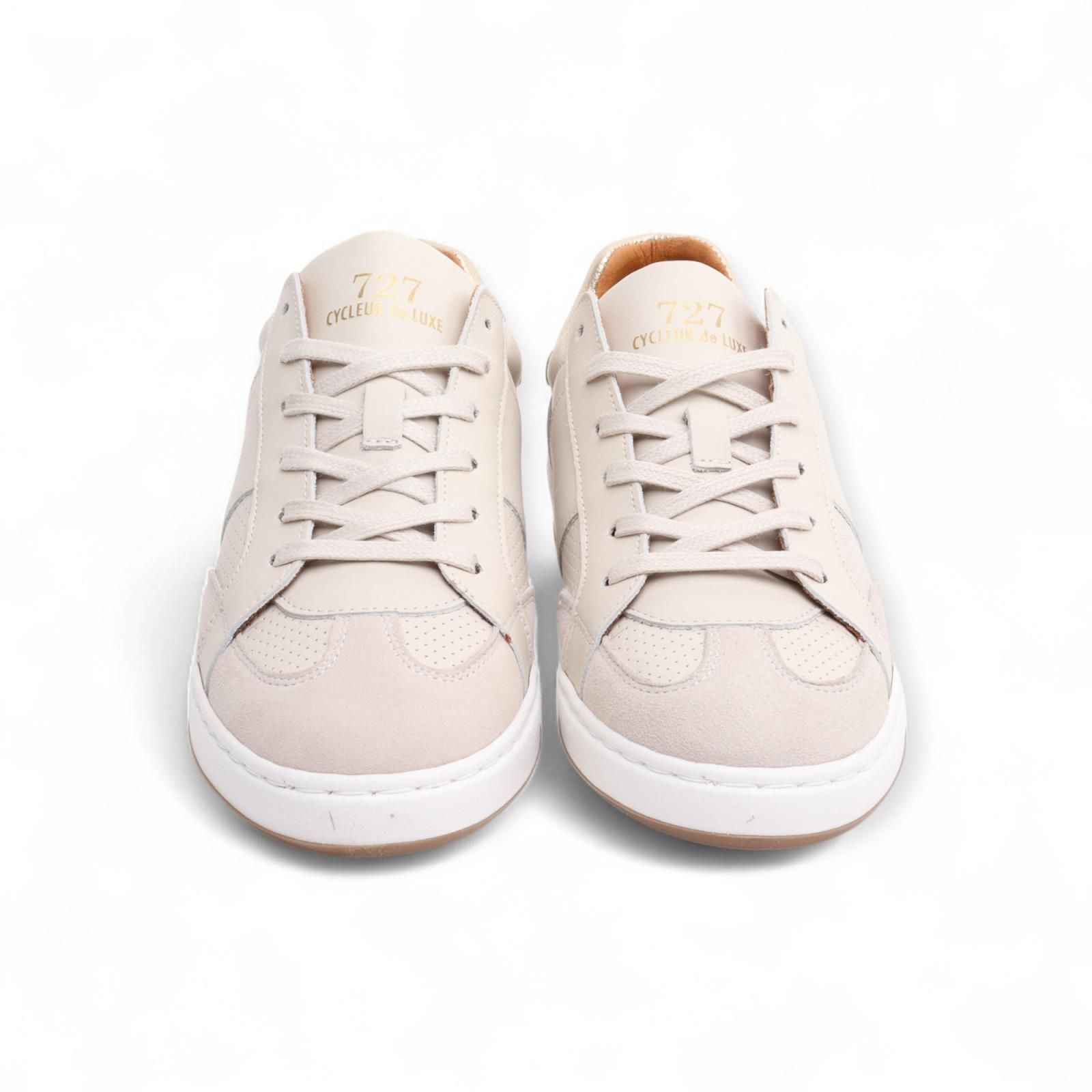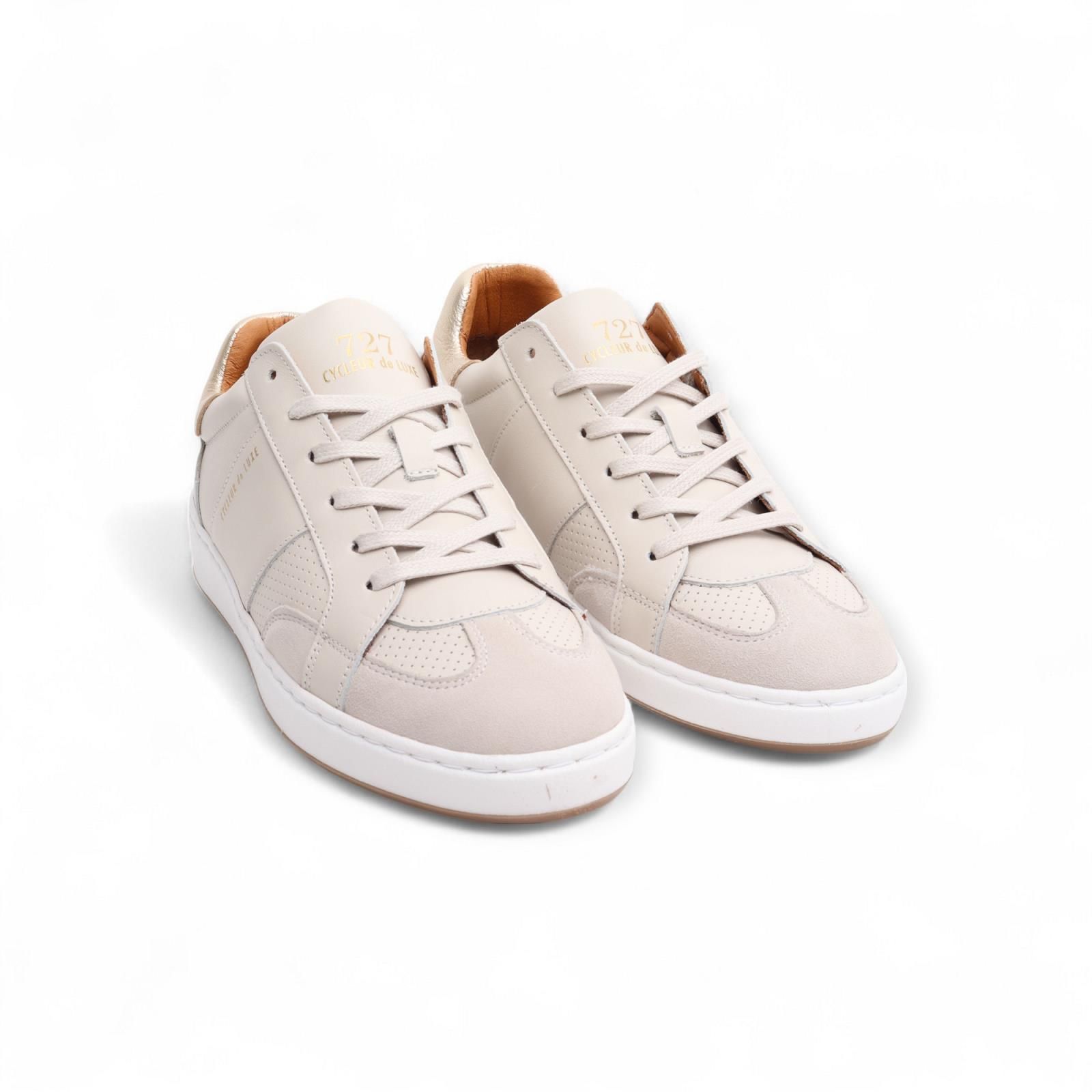 Sneaker Tabletop van Cycleur de Luxe voor dames. Deze sneaker is in beige leder met suède aan de neus en een gouden hielflap. Is op een witte sneakerzool en de binnenzool is uitneembaar.