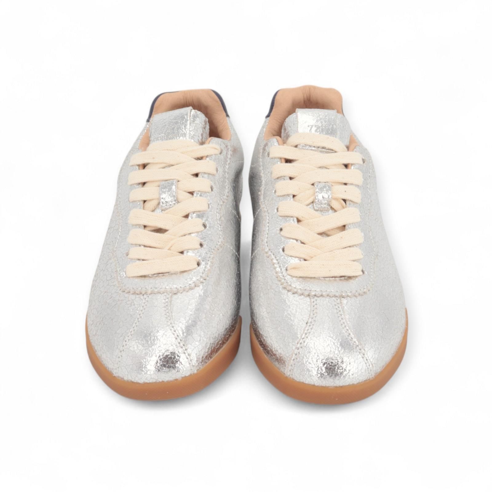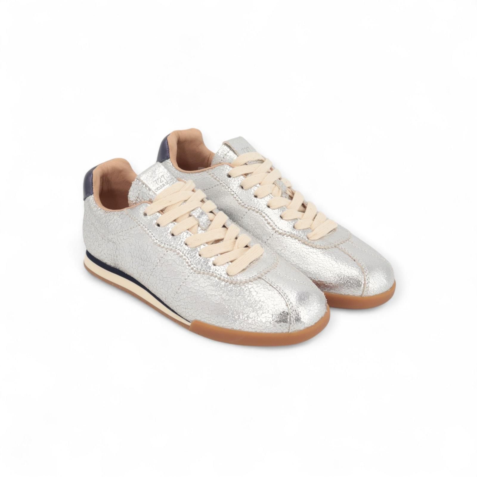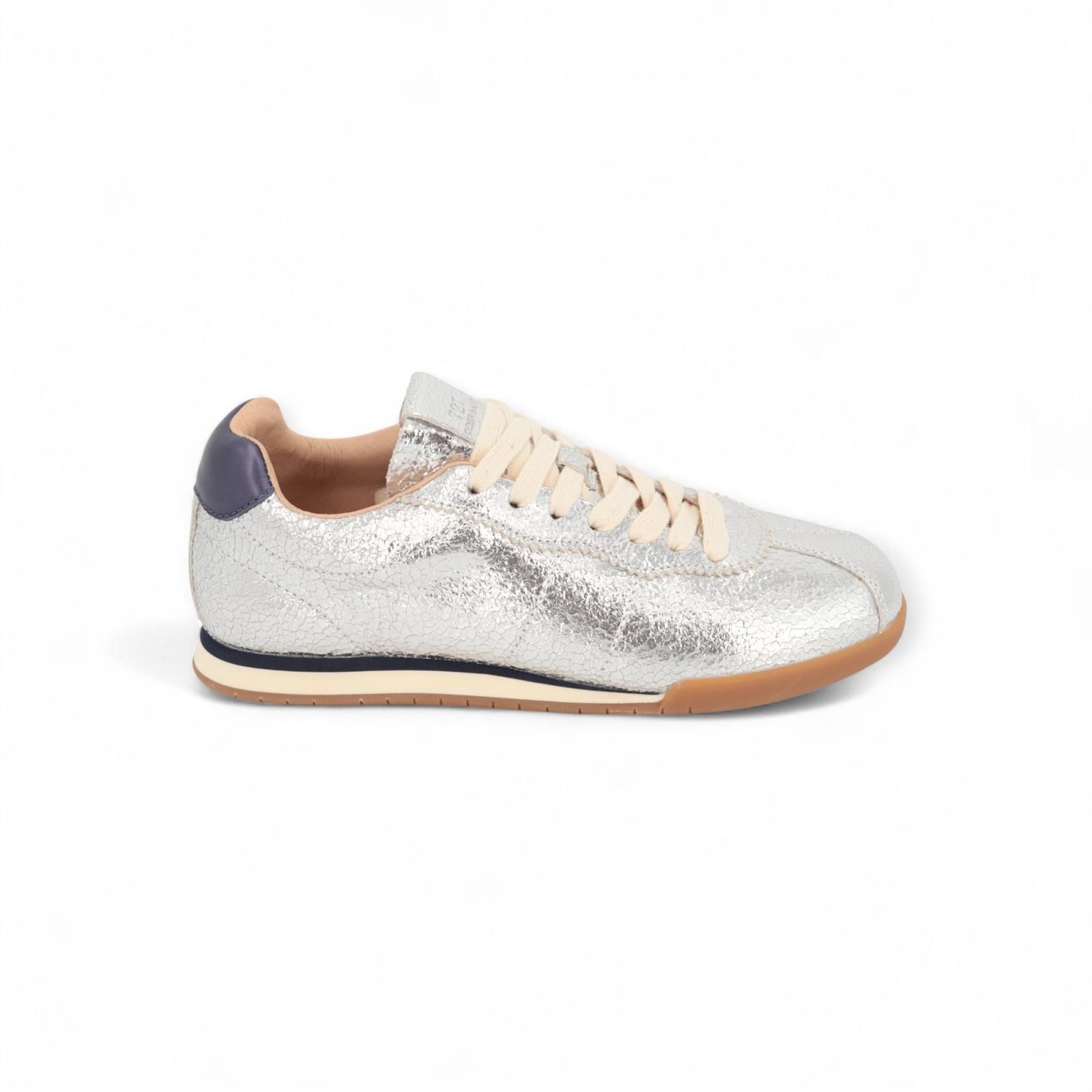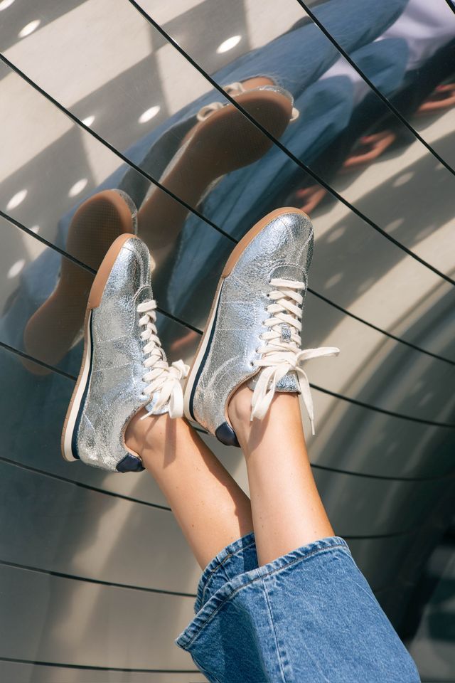 Sneaker Tulip van Cycleur De Luxe voor dames. Deze mooie sneaker is in zilver geschubt shining leer. Heeft een moon blauwe flap en hielflap met beige veters. Heeft een bruine gummyzool met blauwe en off wit streep. De binnenzool is uitneembaar. met een uitneembare binnenzool.