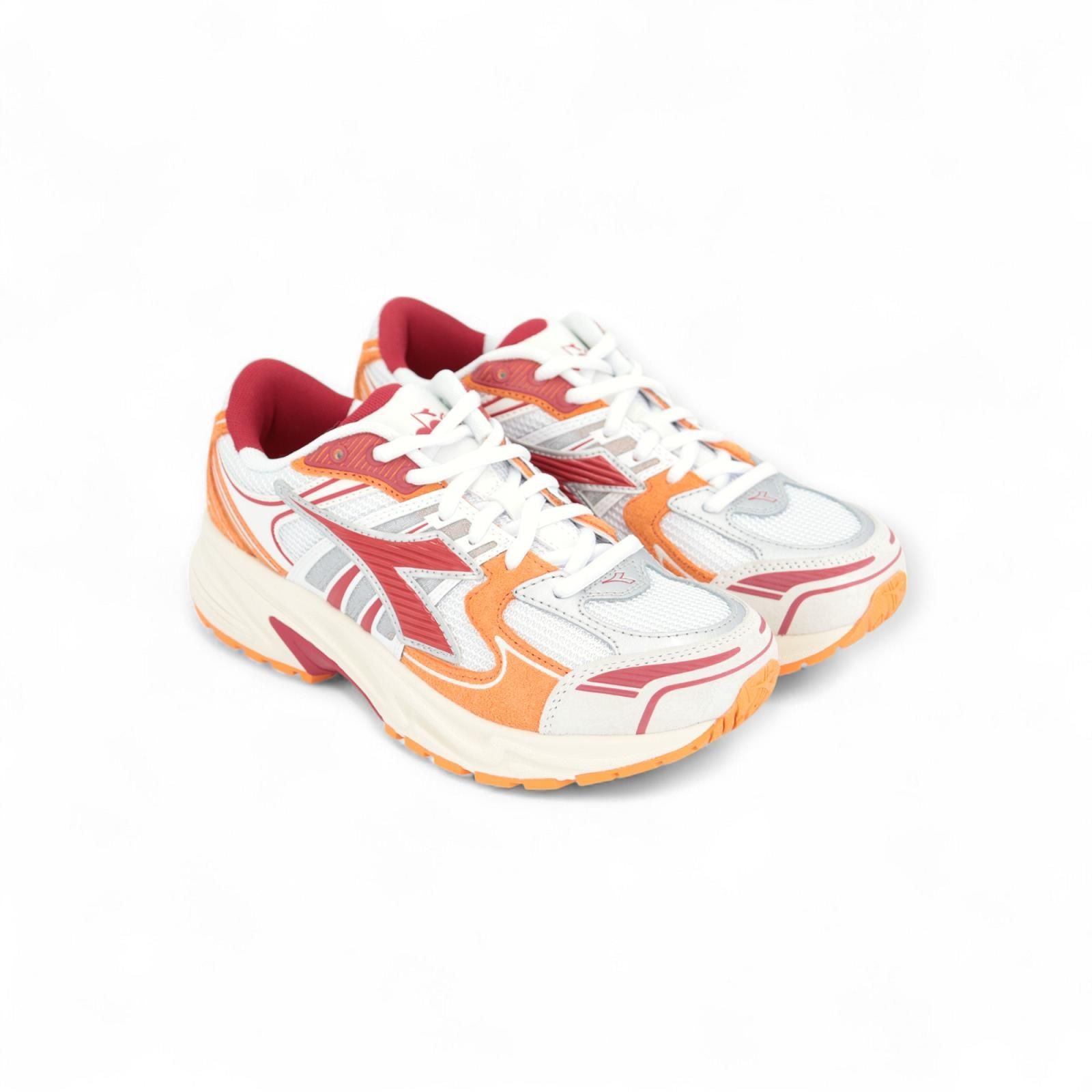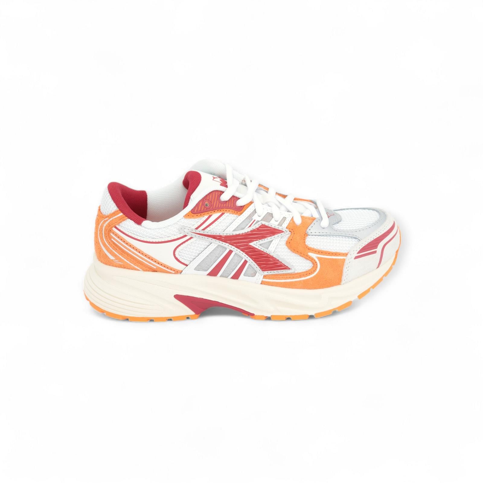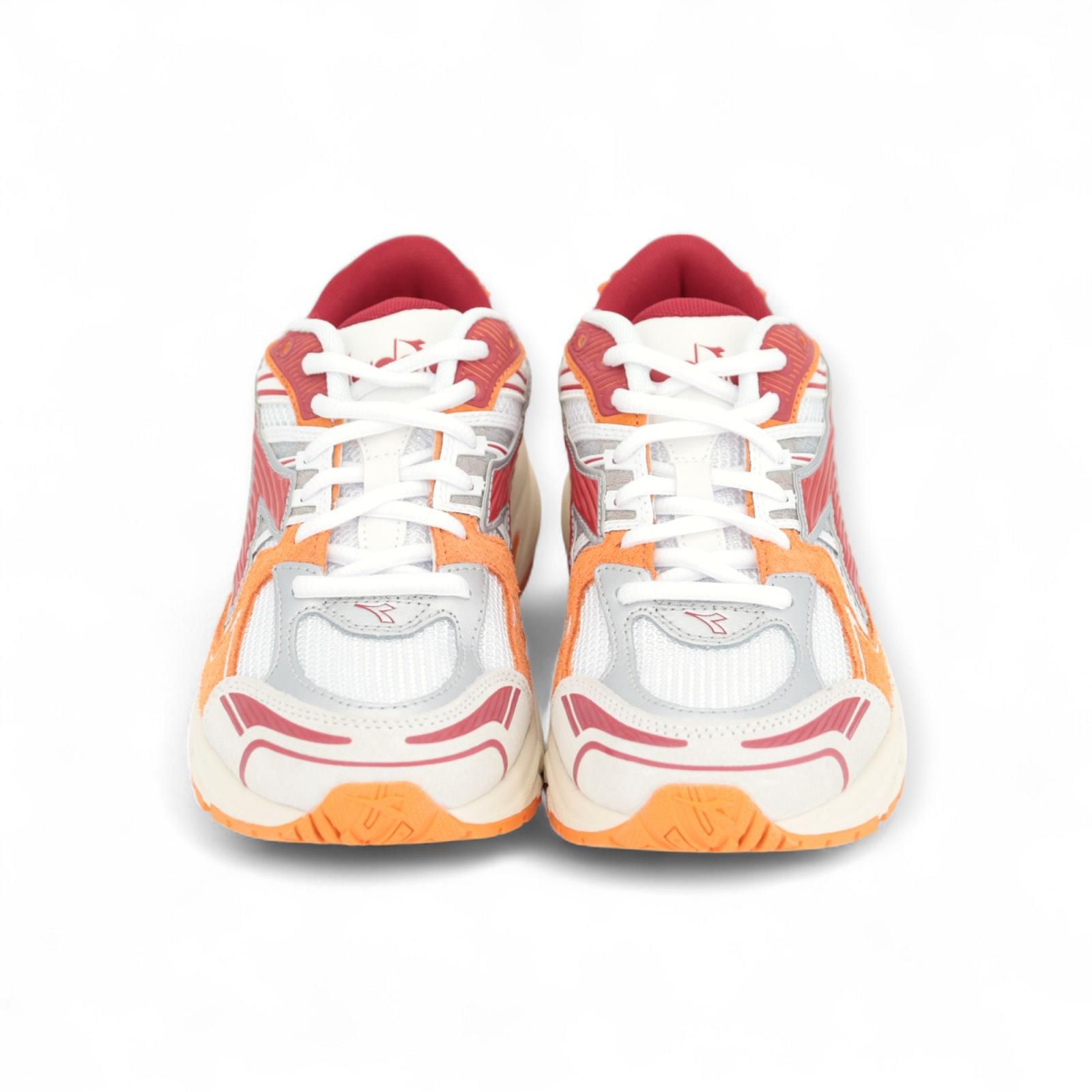 De Mythos Star Diadora sneaker voor dames; hebben een robuust ontwerp. Deze stijl combineert licht oranje, rood, wit en grijs kleuren met leder, mesh/ stof materialen in een onweerstaanbare mix van texturen.