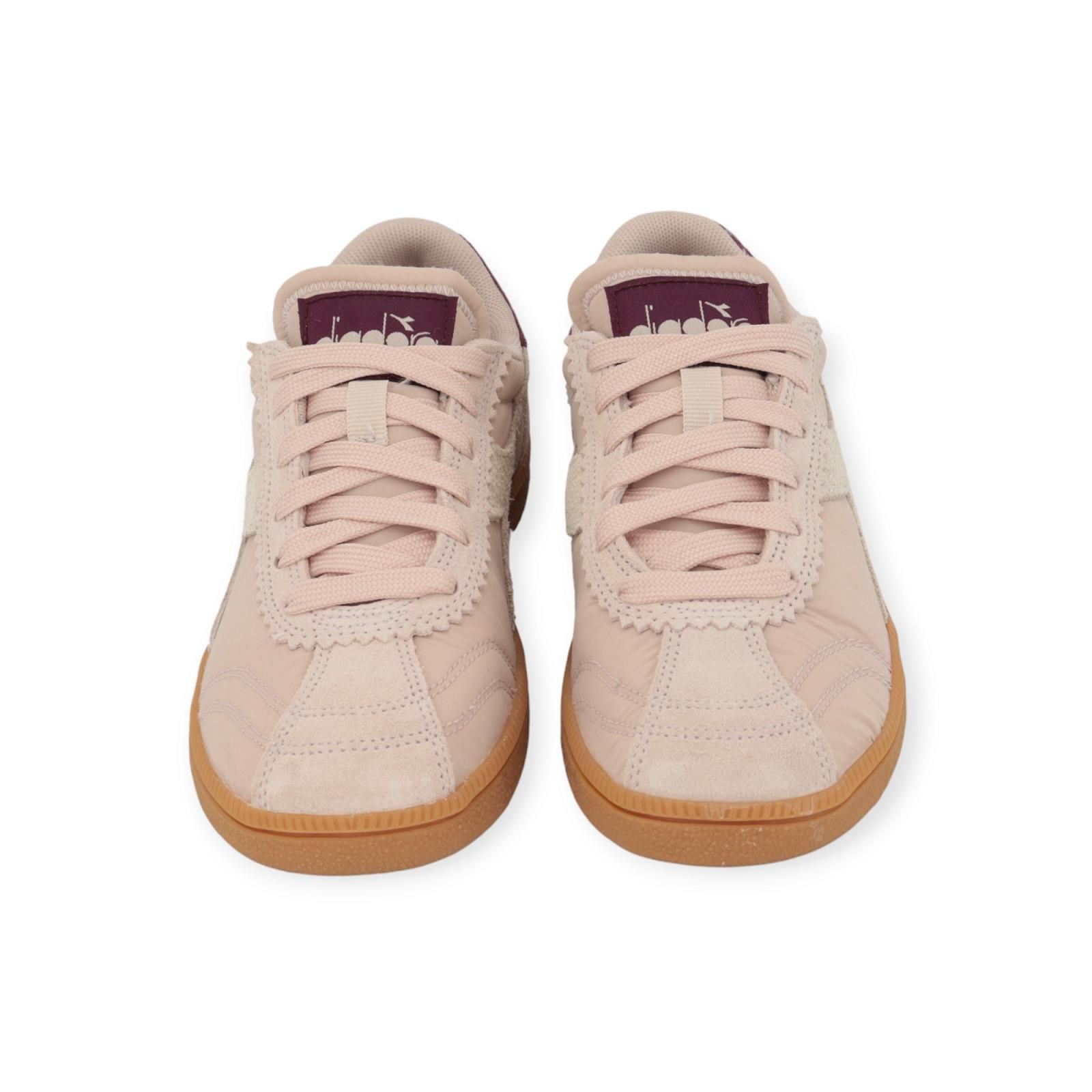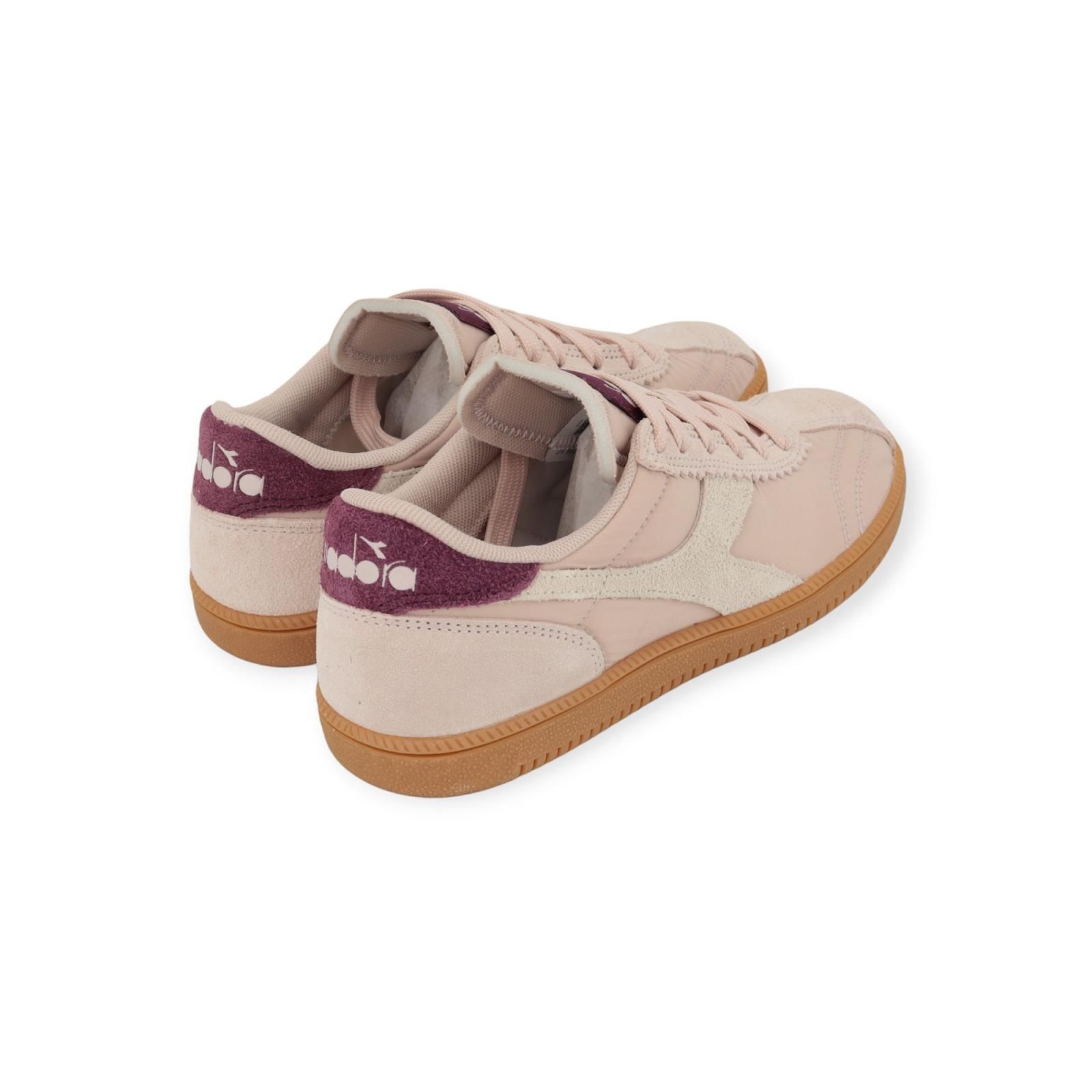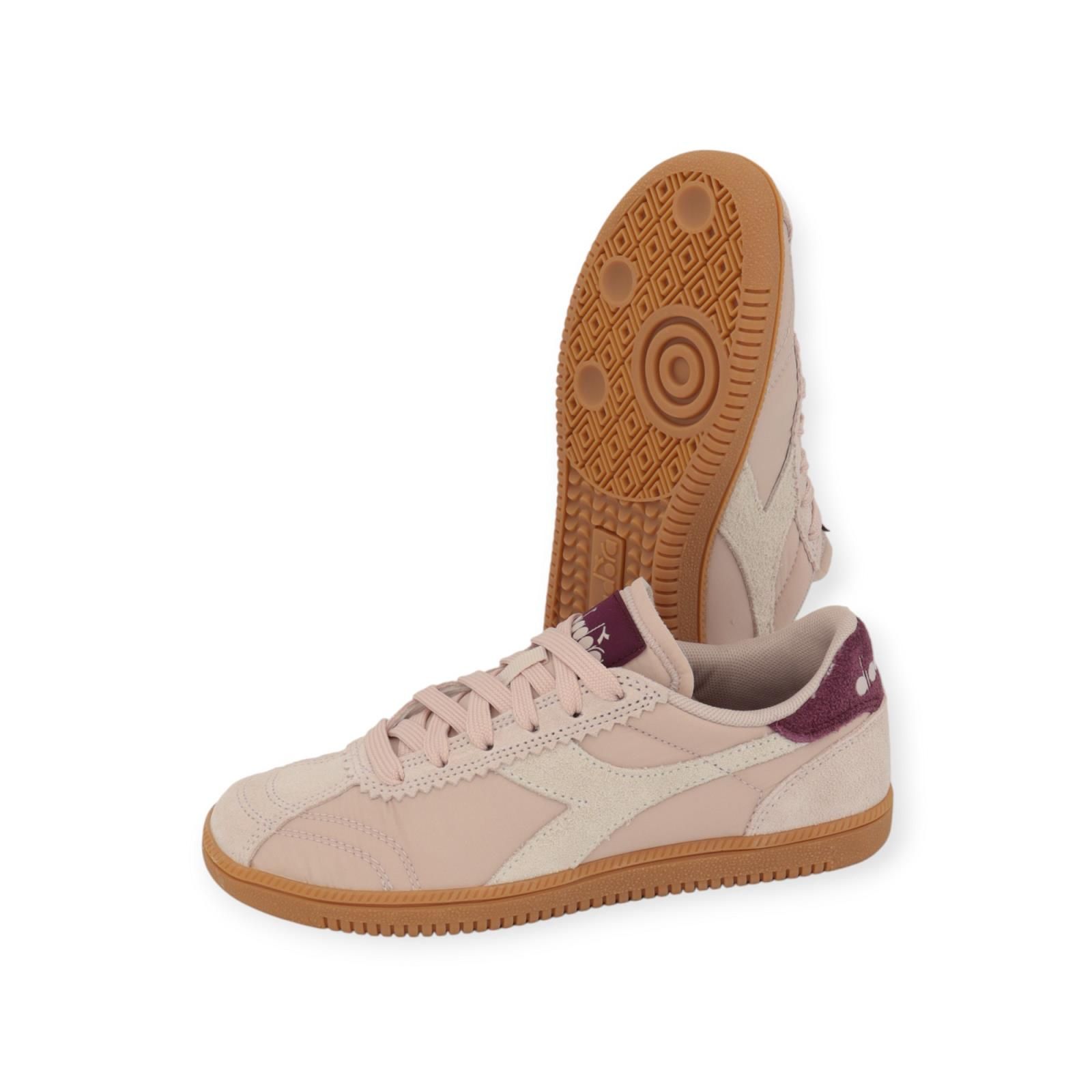 Sneaker Tokyo hit van Diadora voor dames. Deze trainer sneaker maakt een comeback in de sneakerwereld. De ‘hit’ versie is de combinatie van suède met nylo. Deze Is in roze suède met aan de zijkanten nylon en off wit diadora lijnen. De hiellip en flap is in donker roze. Het model is typerend aan hun zool: comfortabel, klassiek en een zool met handbal drukpunten.