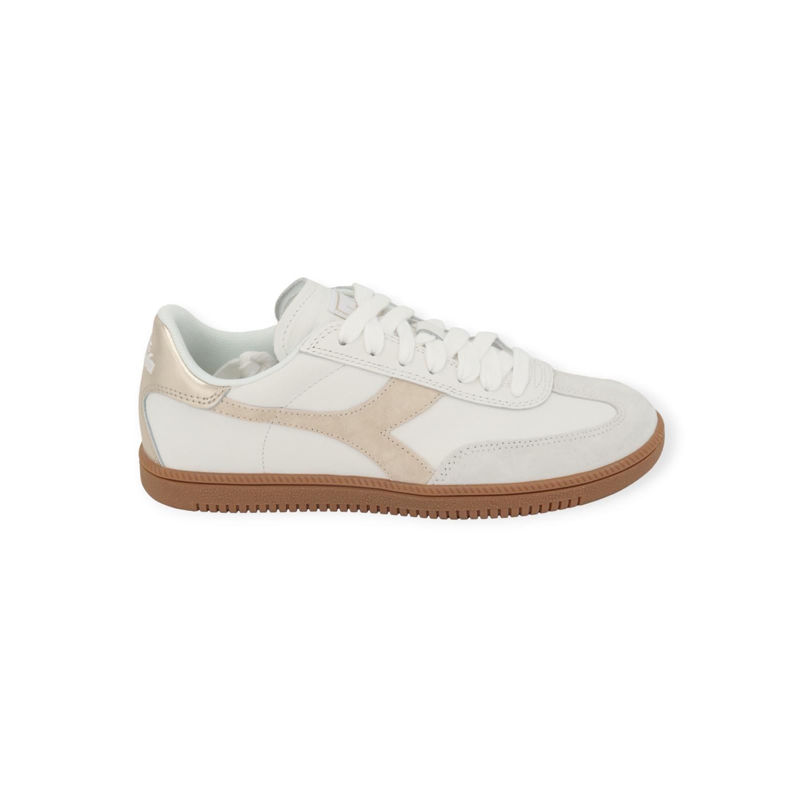 Sneaker Trainer Metal van Diadora voor dames. Deze sneaker is in off wit leer met suède. Heeft een metal shining hielflap en beige suède diadora lijnen aan de zijkanten. Is op een bruine gummyzool met uitneembare binnenzool.