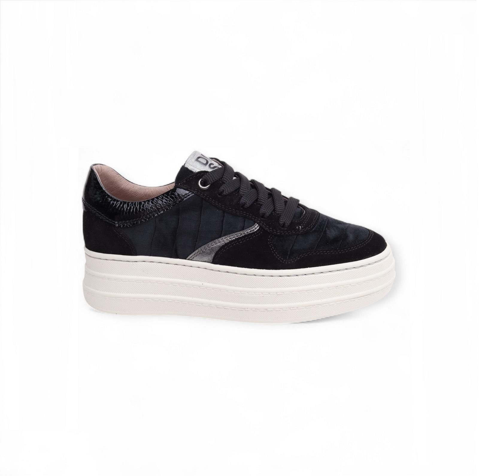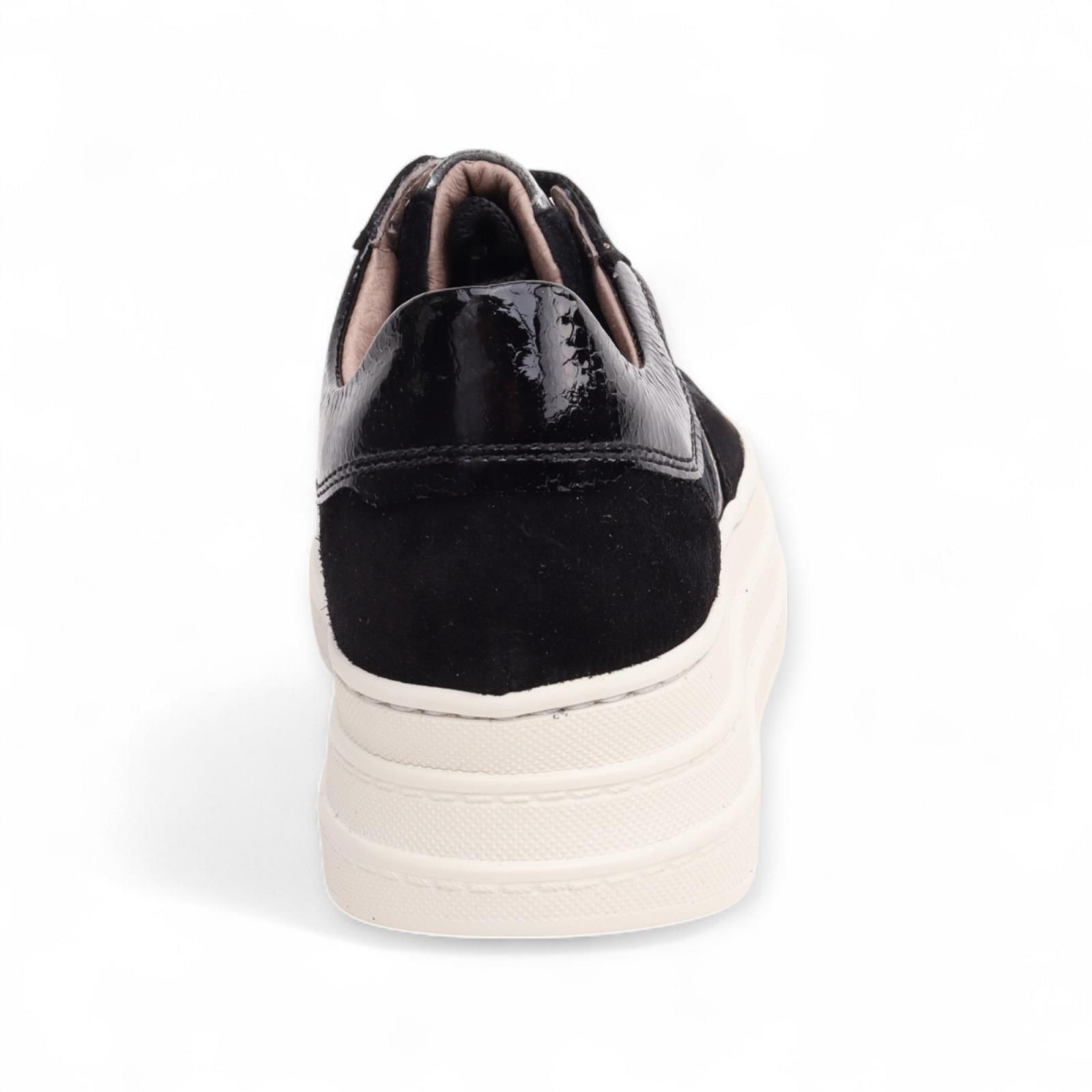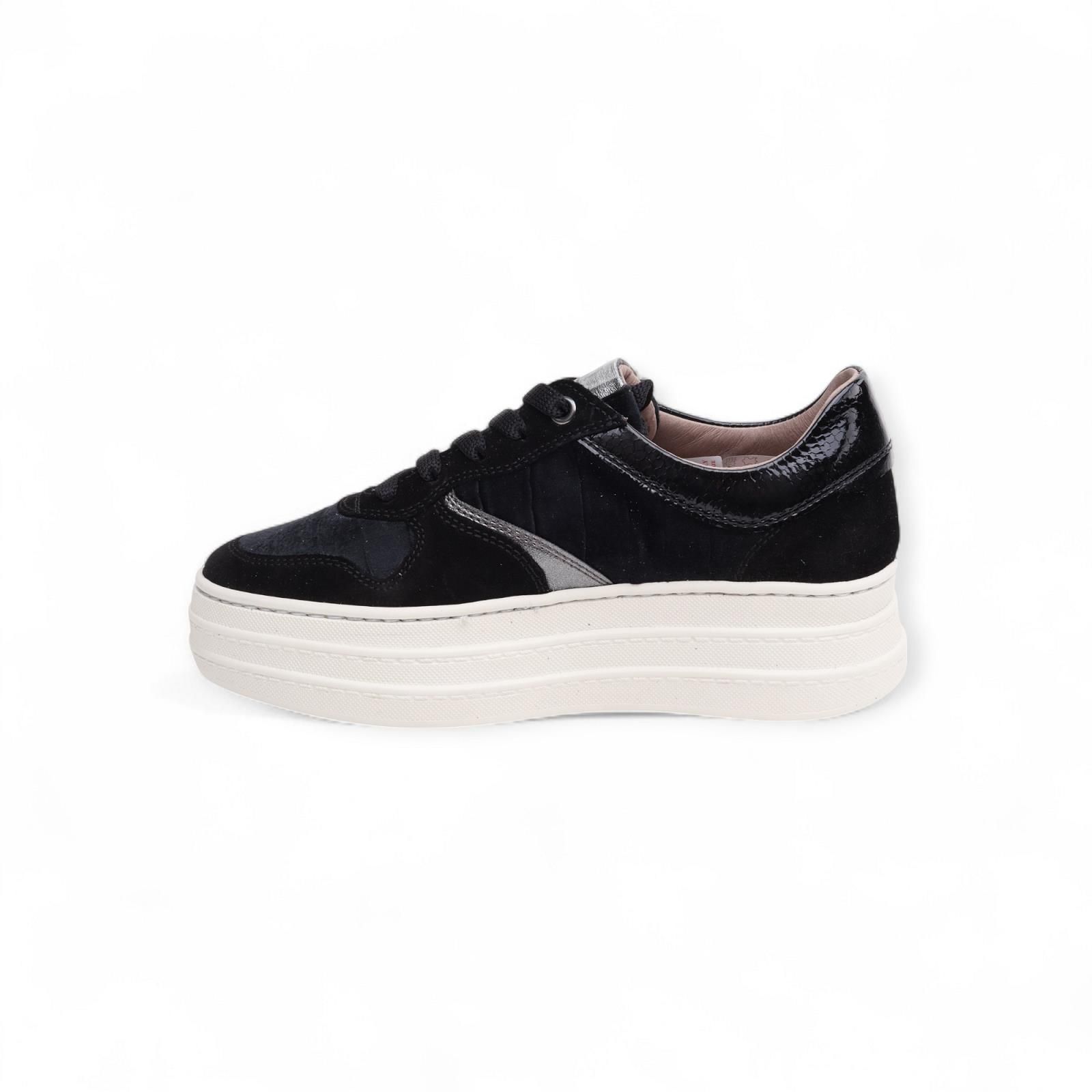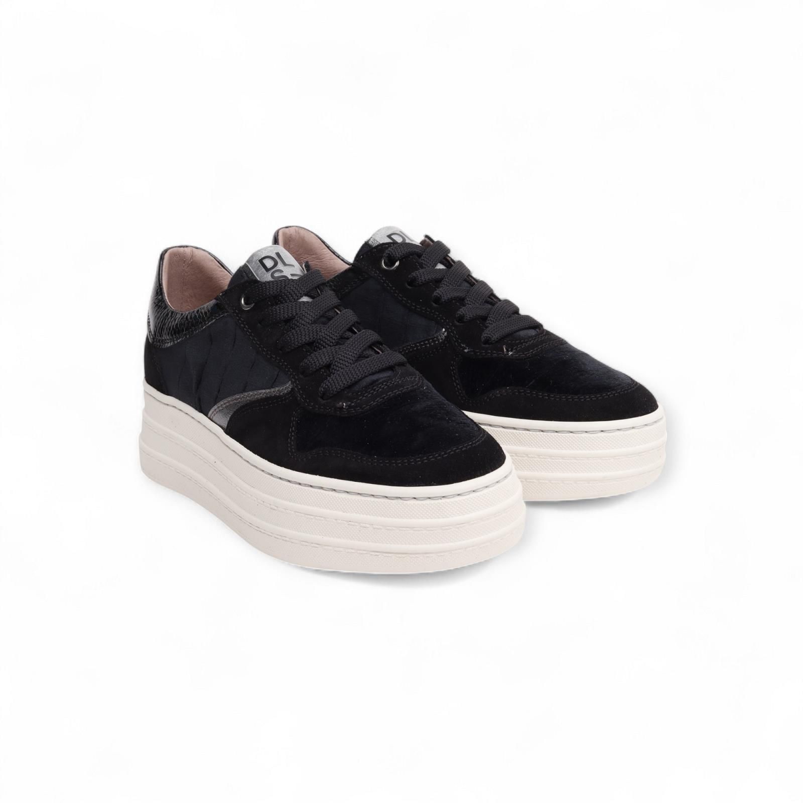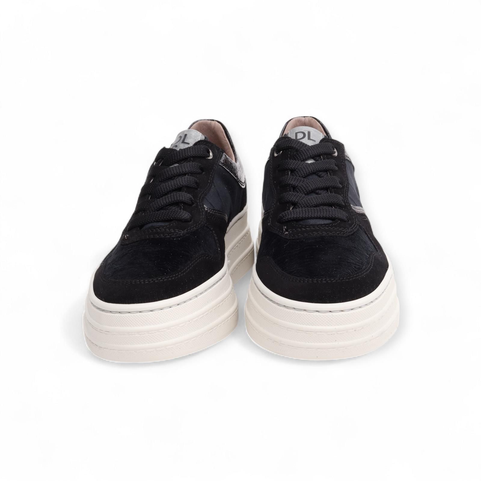 Sneaker Paula van DL Sport voor dames. Deze sneaker is in zwart suède met leer. Mooi afgewerkt met een zilver shining stukken en zwart lakleer in de hielflap. Heeft een witte plateauzool en de binnenzool is uitneembaar.