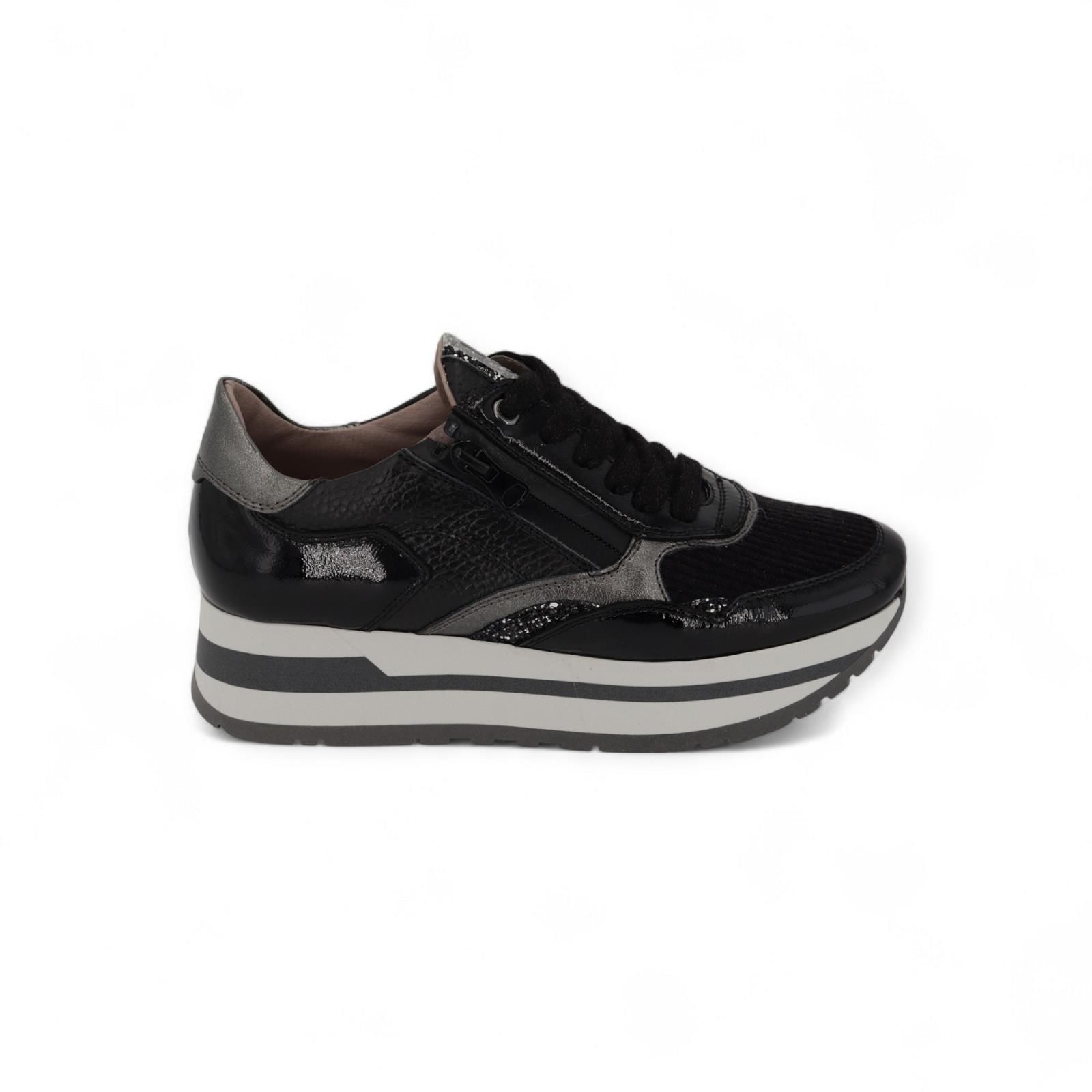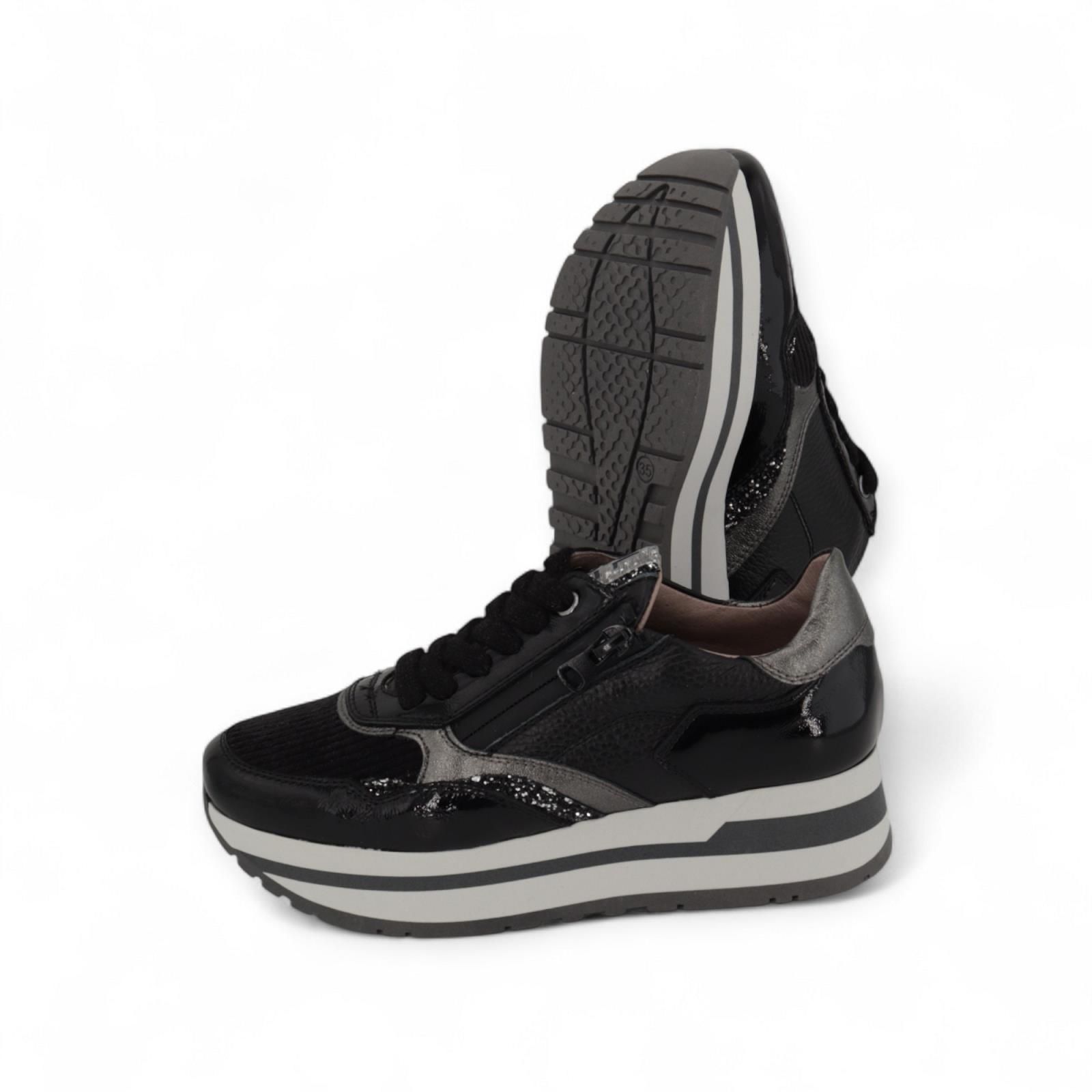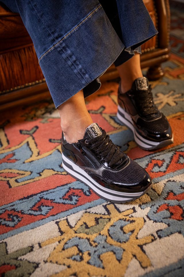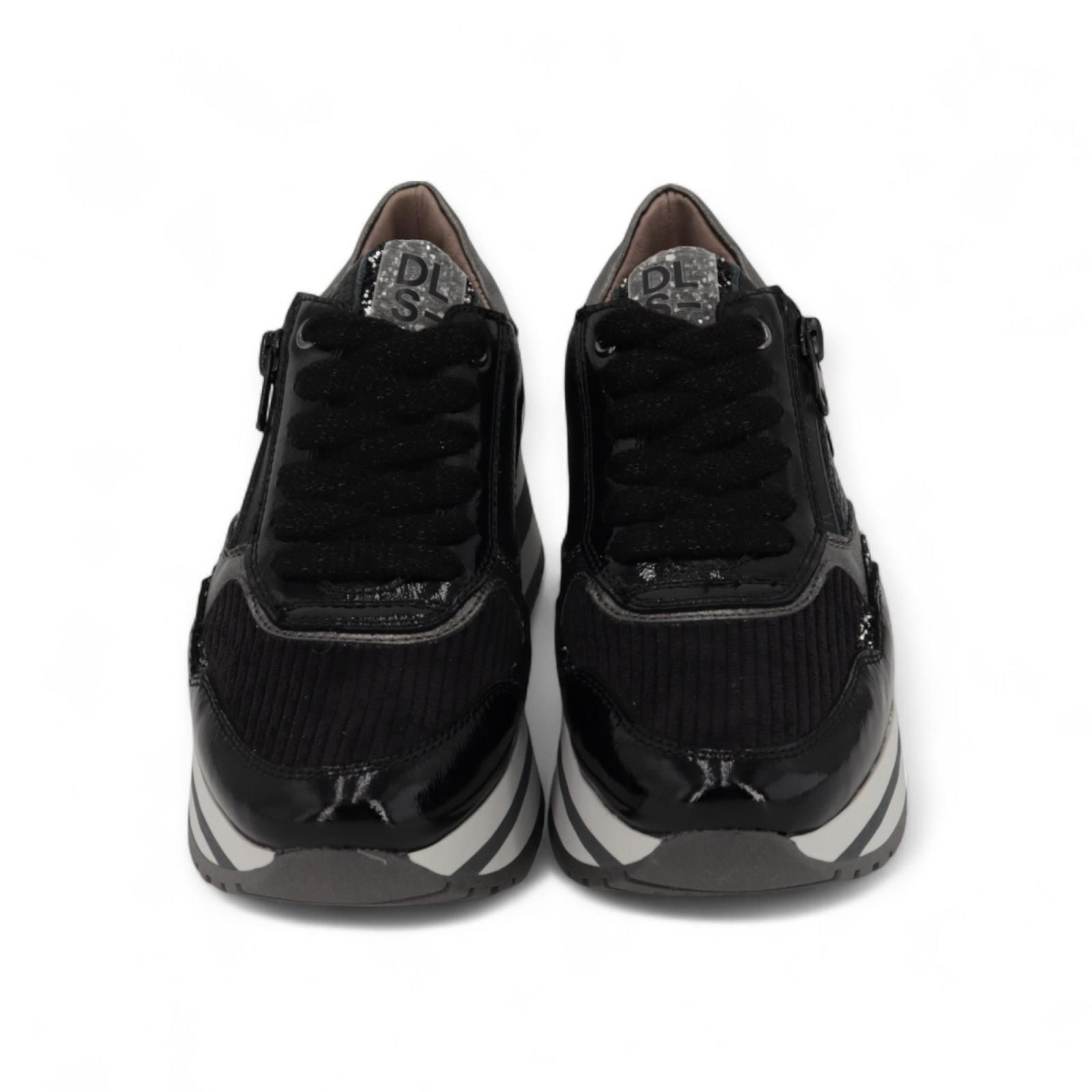 Sneaker van DL Sport 6730 voor dames. Deze sneaker is in zwart en zilver suède met lakleer en geribd stof op de voorvoet. Is afgewerkt met strassteentjes. Heeft een rits en vetersluiting en is op een plateauzool die voor aangenaam comfort zorgt. De binnenzool is uitneembaar.