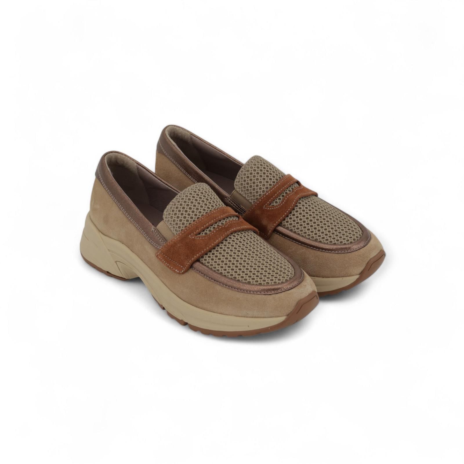 Mocassin van DL Sport 6733 voor dames. Deze mocassin is in taupe suède afgewerkt met een bronzen stiksel en een cognac boekel. Is met mesh over de wreef. Heeft een elastiek zodat het model mooi aan de voet blijft. En is op een dikke zool met een uitneembare binnenzool.