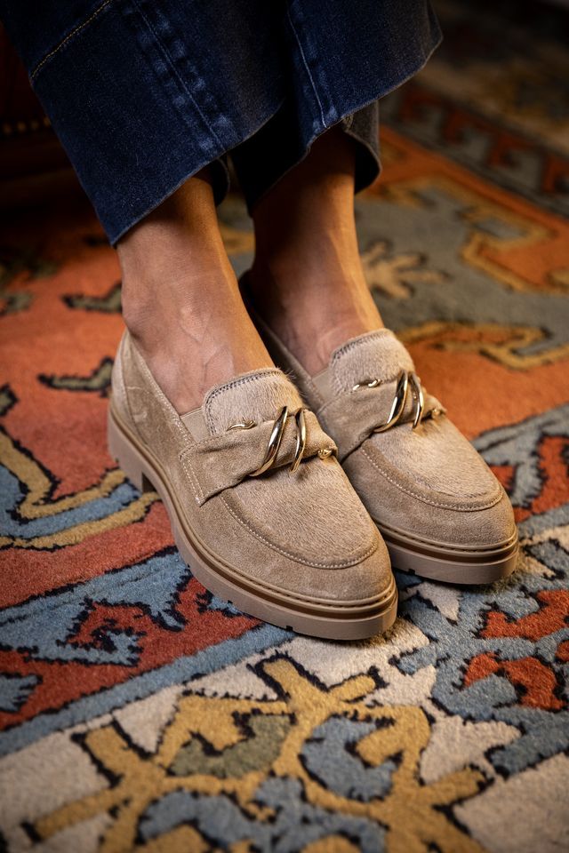 Mocassin van DL Sport 6766 voor dames. Deze mocassin is in taupe suède met pels op de wreef. Is mooi afgewerkt met een band en gouden boekel. Is met een elastiek aan de wreef zodat het model mooi aan de voet blijft. Heef een dikke zool afgewerkt met een cognac rand en een uitneembare binnenzool.