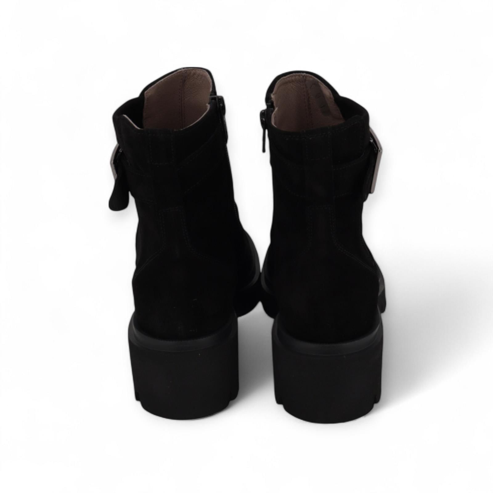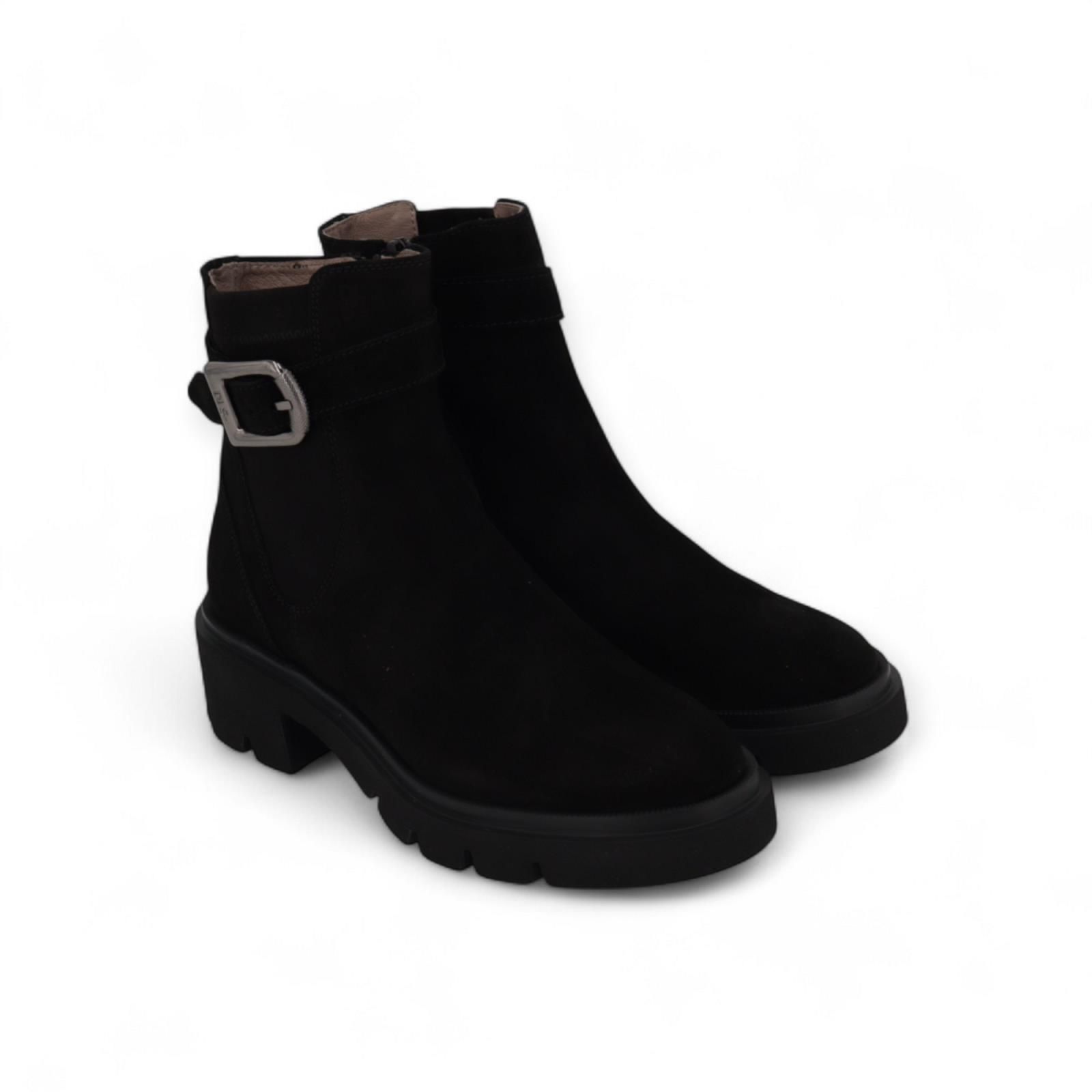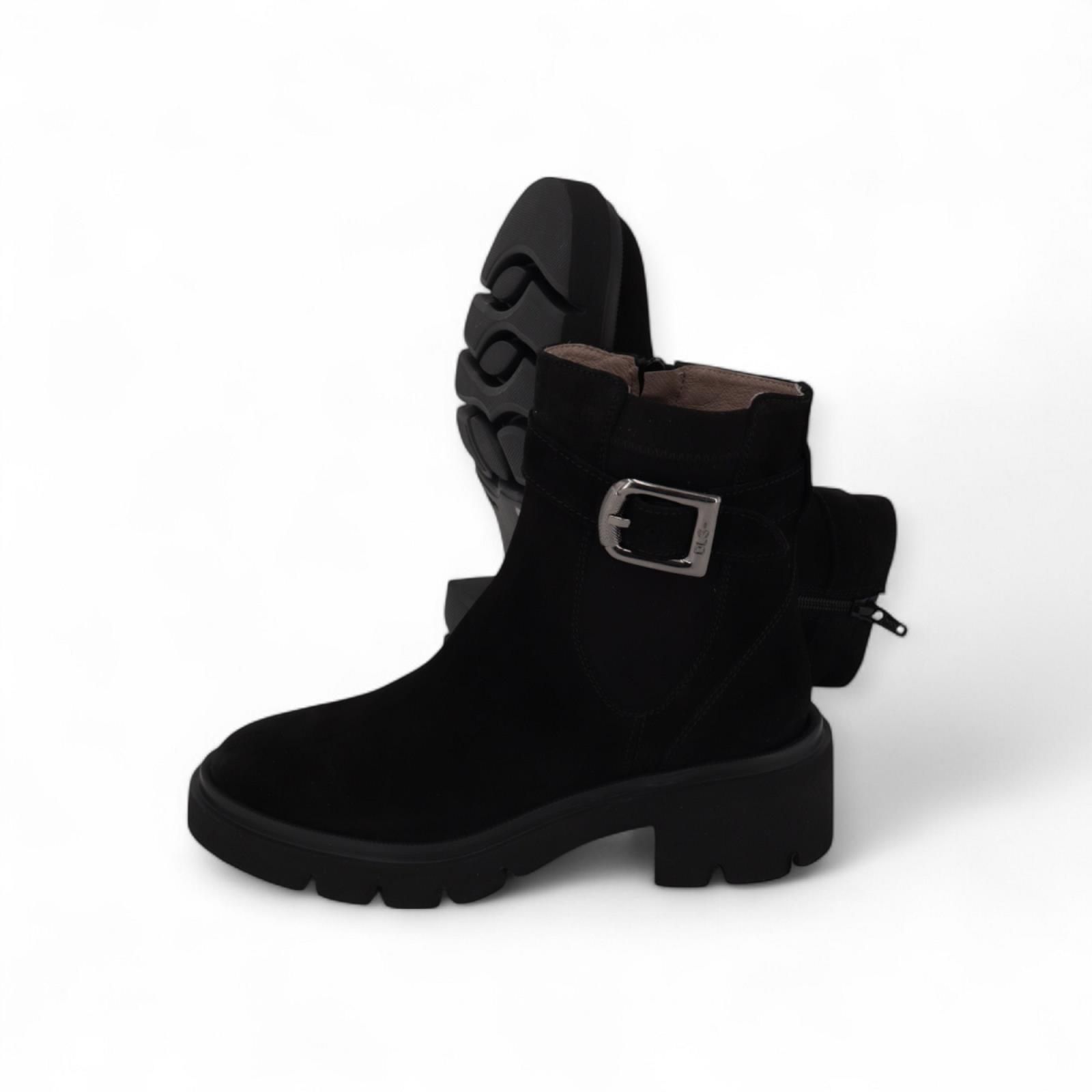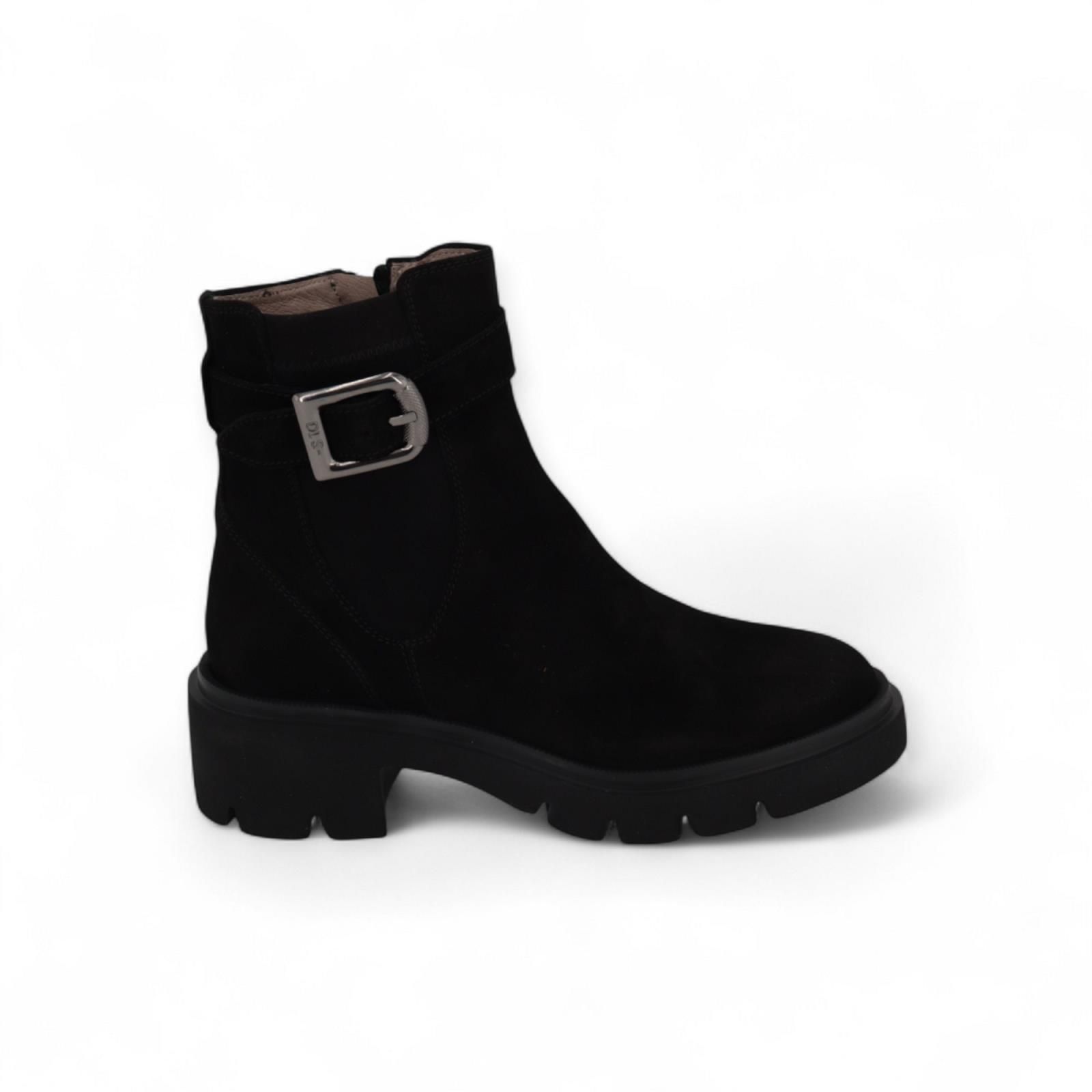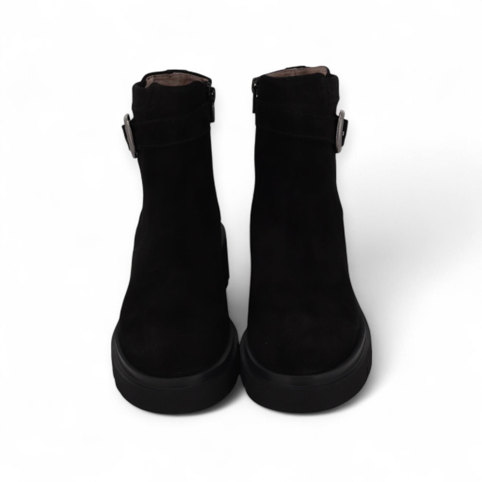 Enkellaars van DL Sport 6803 voor dames. Deze laars is in zwart suède afgewerkt met een gespsluiting rond de bovenkant. Heeft een volledige ritssluiting. Is op een dikke zool met een blokhakje van 2-2,5cm hoog en de binnenzool is uitneembaar.