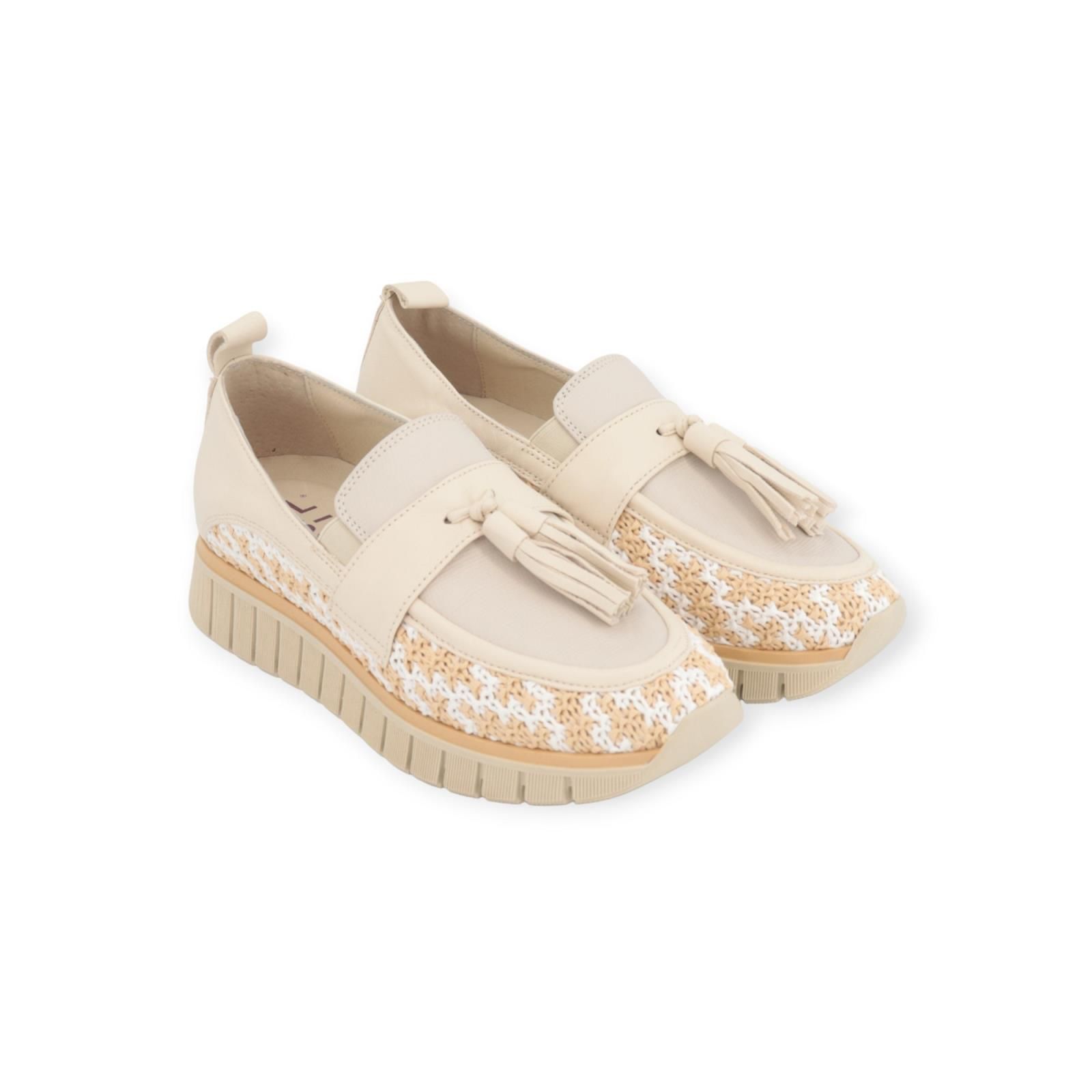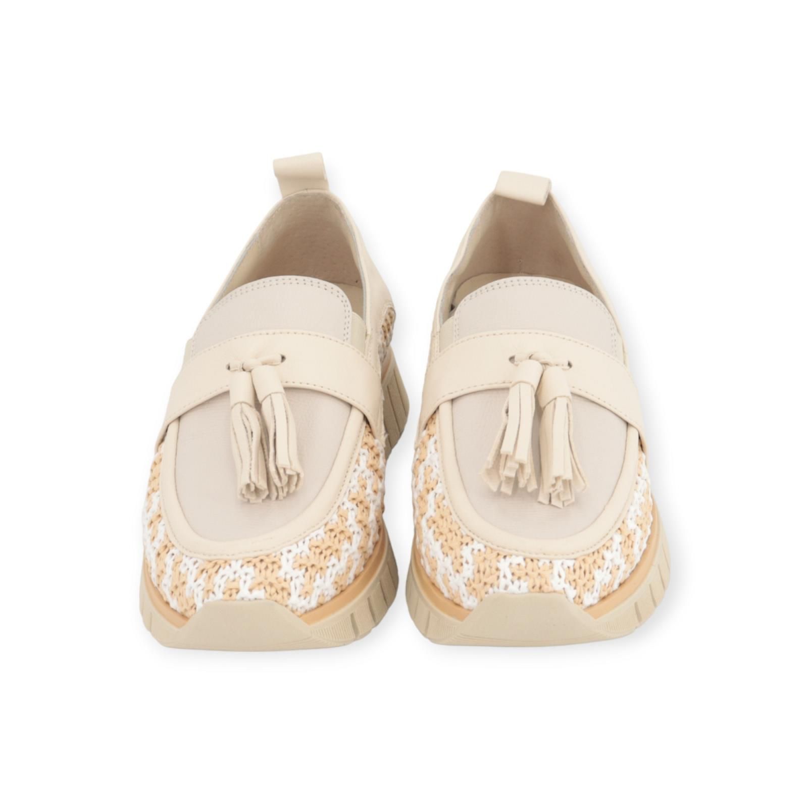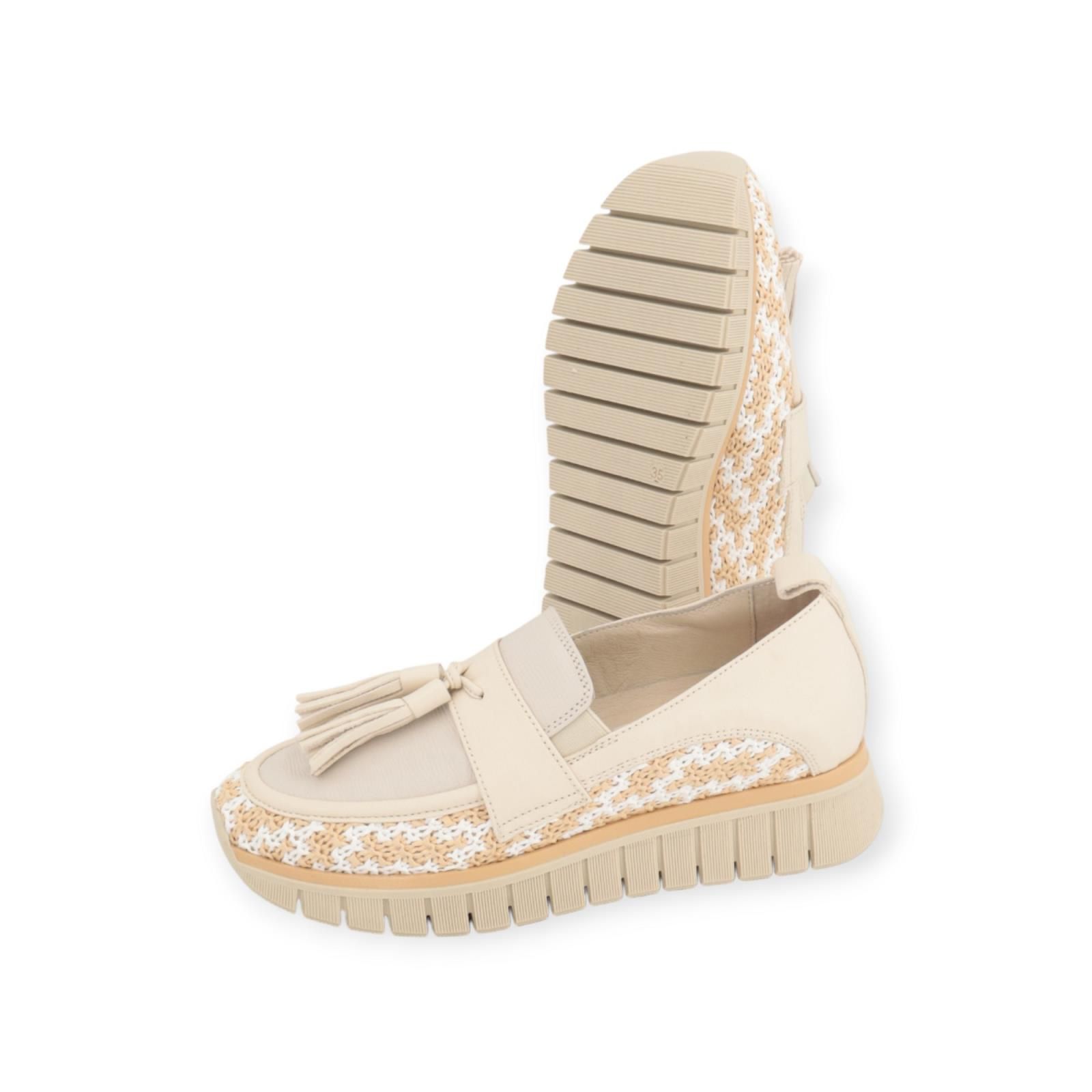 Mocassin 6967 van Dl Sport voor dames. Deze mocassin is in beige leer op de wreef licht pony haar en met gehaakt beige wit raffia aan de zijkant. Heeft een band met flosh over de wreef. De microzool heeft een lichte sleehak van 2cm hoog en is omrand met een zandkleurige boord. Blijft mooi vast aan de voet door de elastiek aan de wreef en is makkelijk aantrekbaar door de hiellus. De binnenzool is uitneembaar.