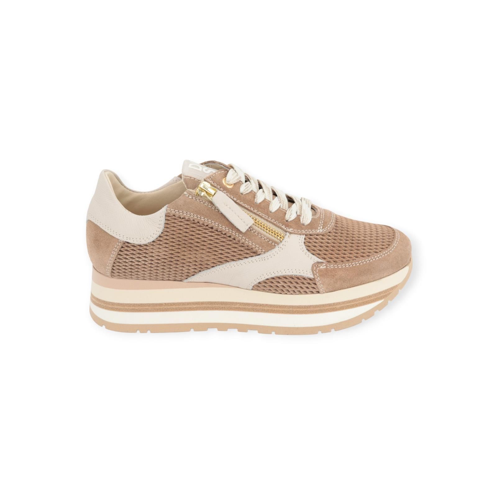 Sneaker 6982 van DL Sport voor dames. Deze sneaker is in camel suède met off wit leer. Aan de neus en zijkanten is de schoen in suède camel mesh. Heeft een rits aan de zijkant zodat je deze makkelijk aan en uit kan trekken. Heeft een plateauzool met een uitneembare binnenzool.